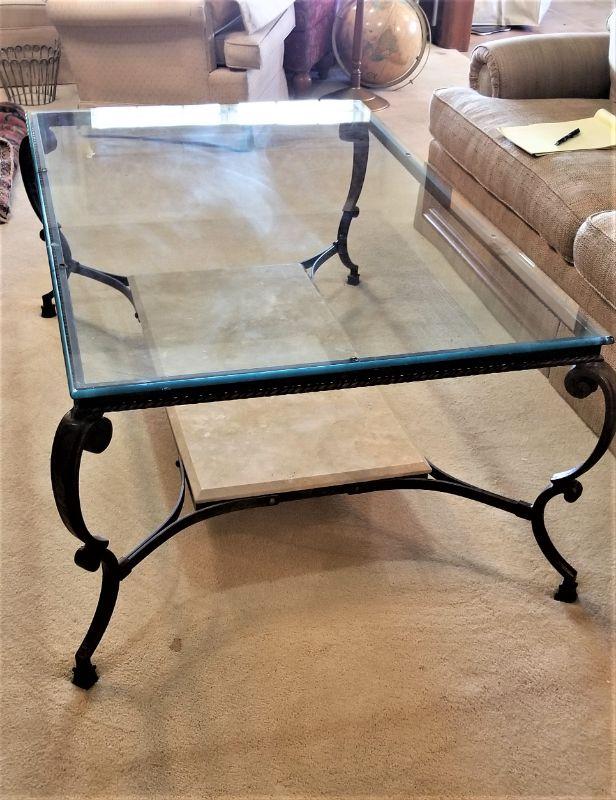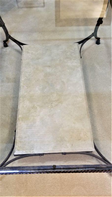 This one is a real beauty - heavy metal and tempered glass coffee table with marble insert. Comes apart, but you will need someone to help you move it. Measures 35" x 55". 22.5" tall.