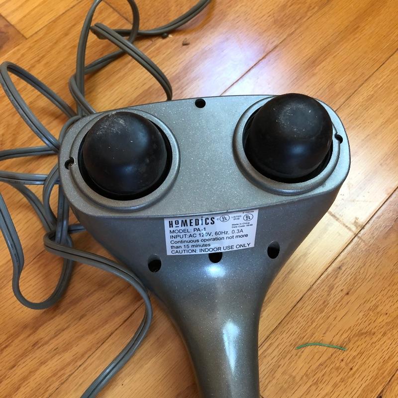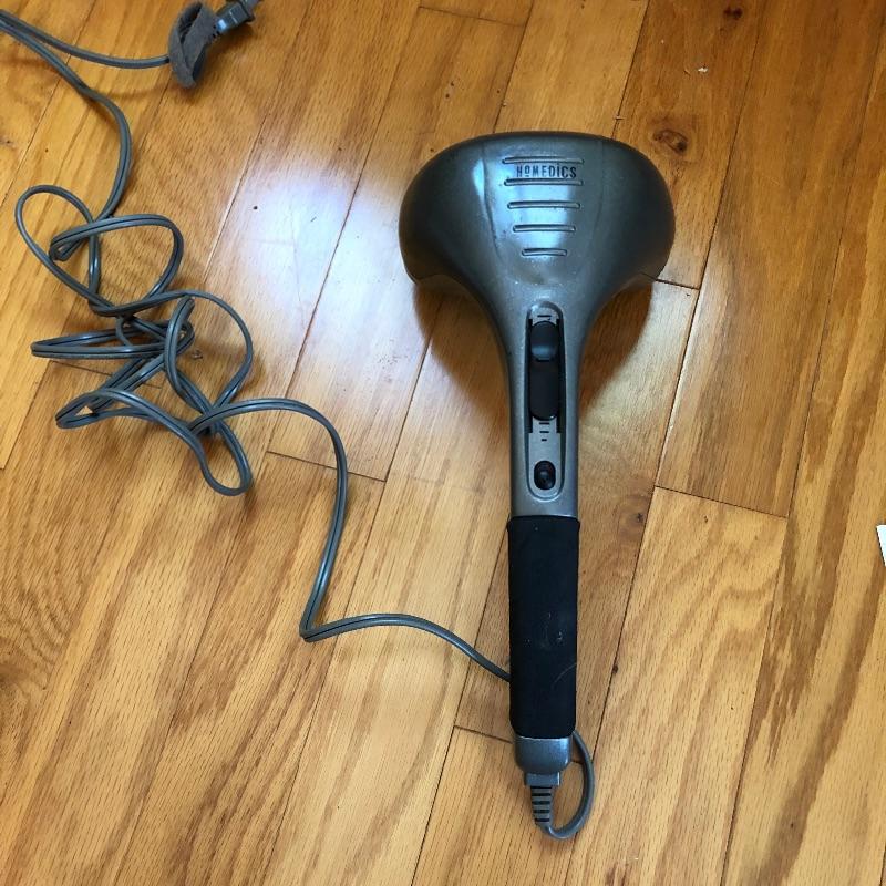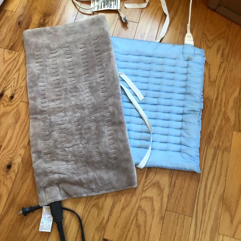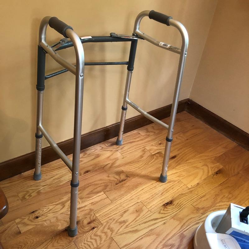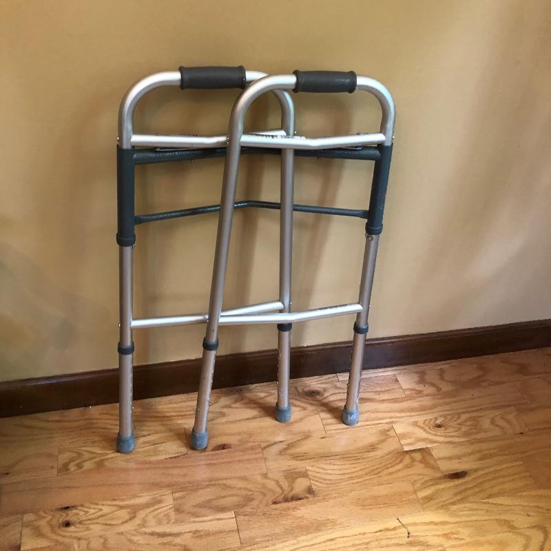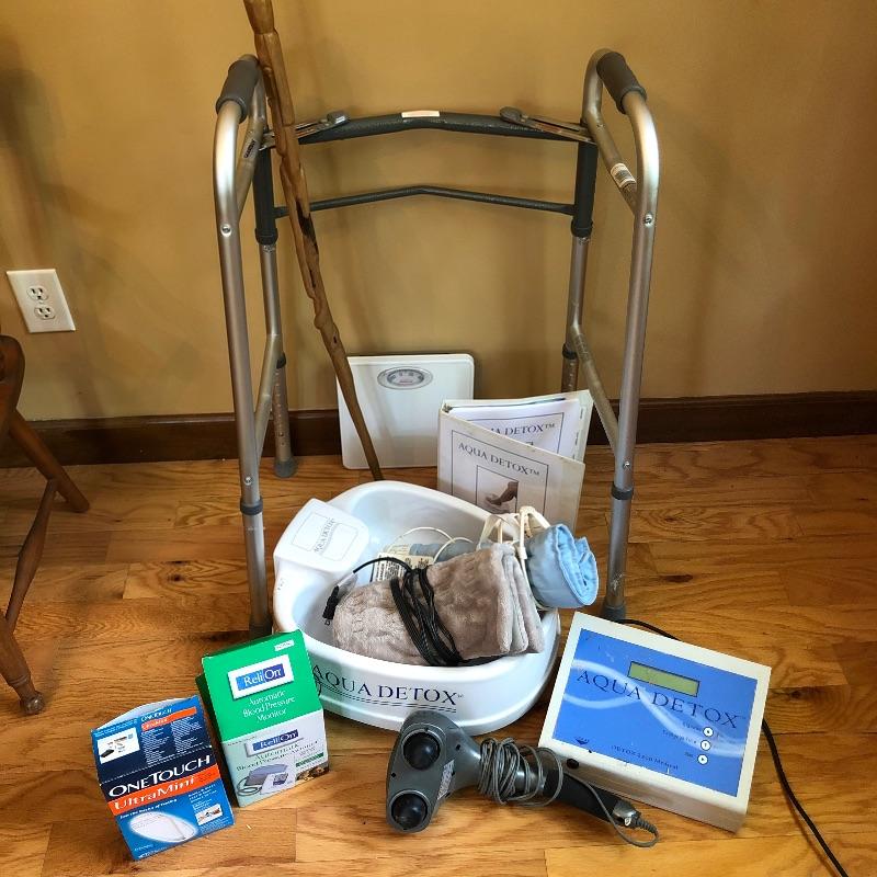 Back massager, two heating pads, scale, unique wooden walking stick, foldable aluminum walker, Aqua Detox System, glucose tester and blood pressure monitor.