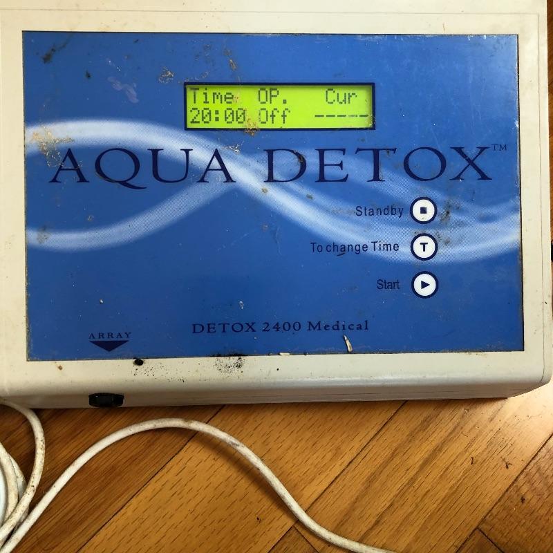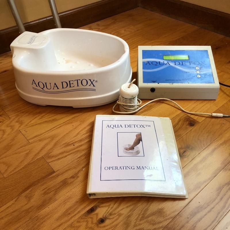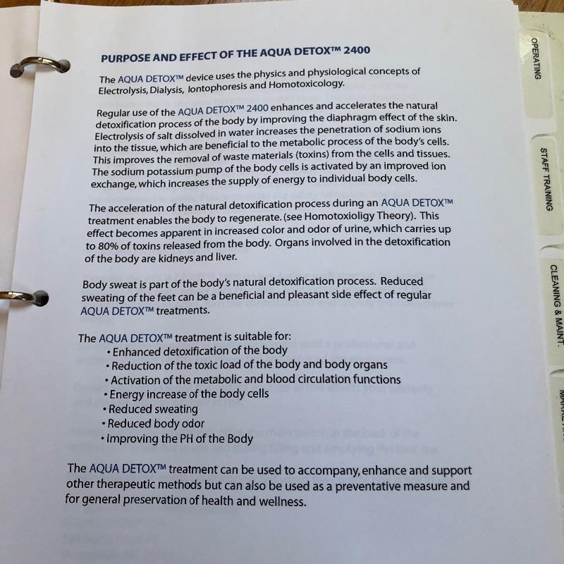The Aqua Detox is a device that uses the physics and concepts of electrolysis, dialysis, lontophoresis and homotoxicology, see the image of the manual for more information.
