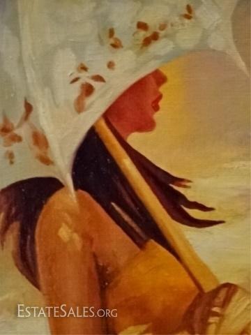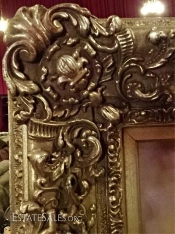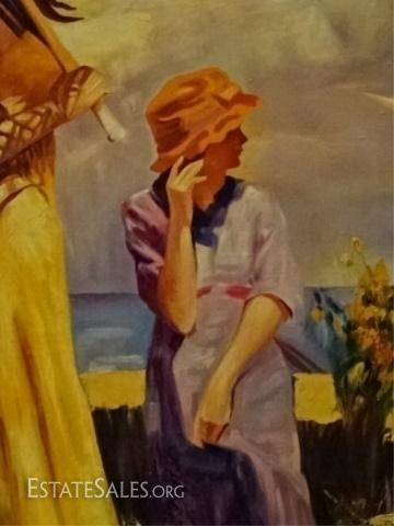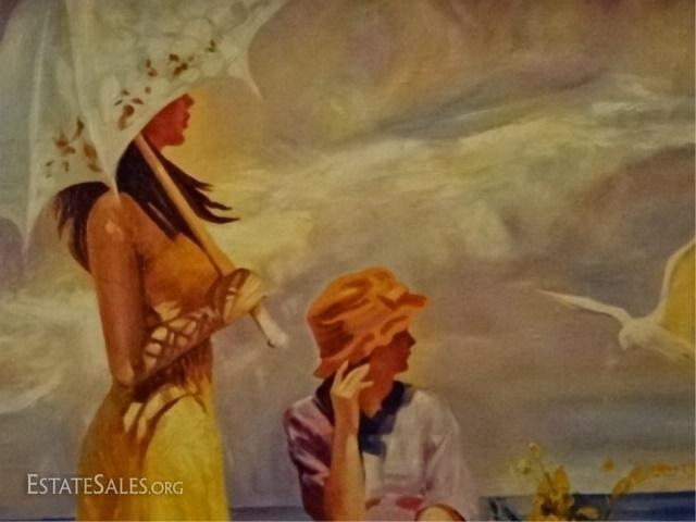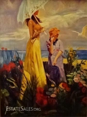 LOT 79: HUGE AFTER PINO DAENI OIL ON CANVAS PAINTING, WOMAN ON BEACH, NICE QUALITY REPRODUCTION IN ORNATE GOLD FRAME, VERY GOOD CONDITION, FRAMED SIZE 61" X 48", SKU203.06 H600