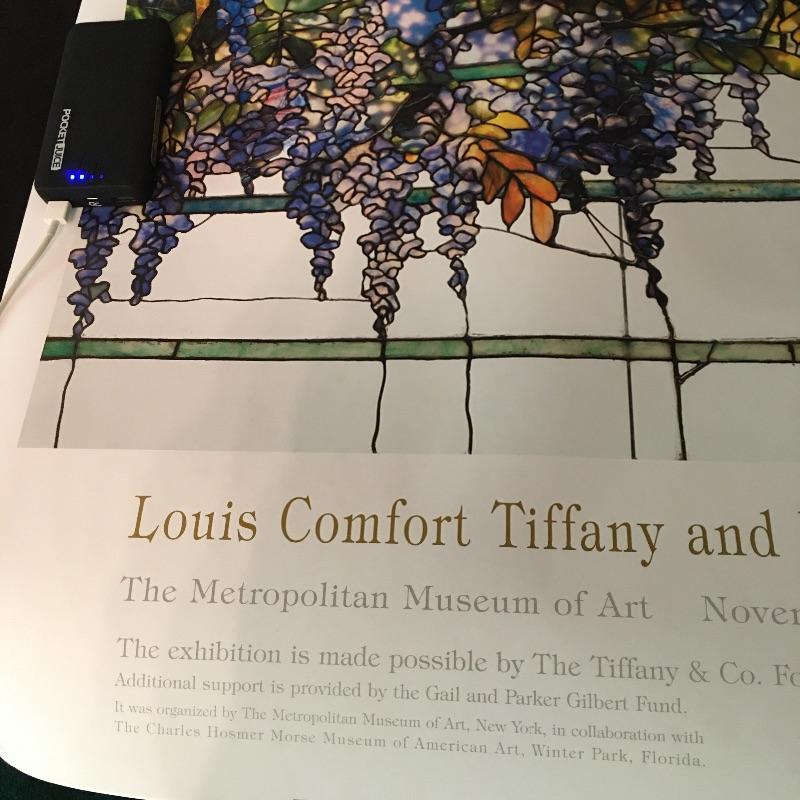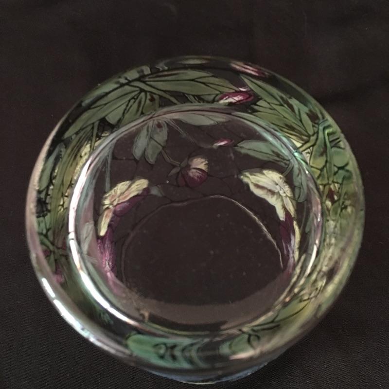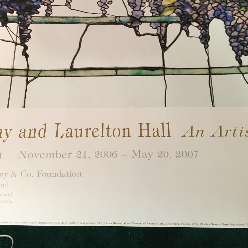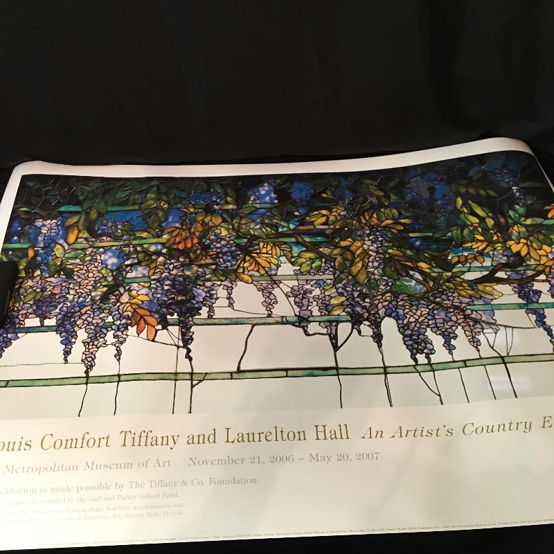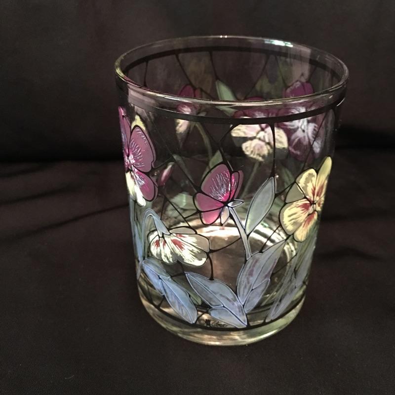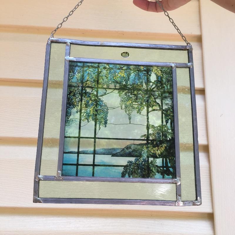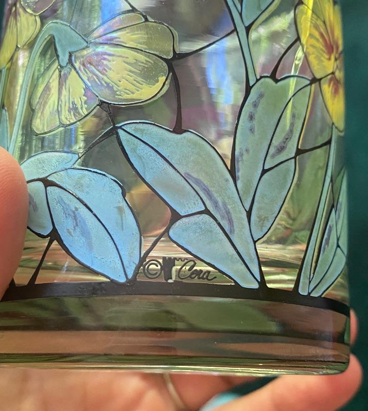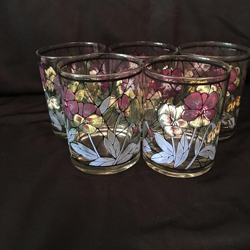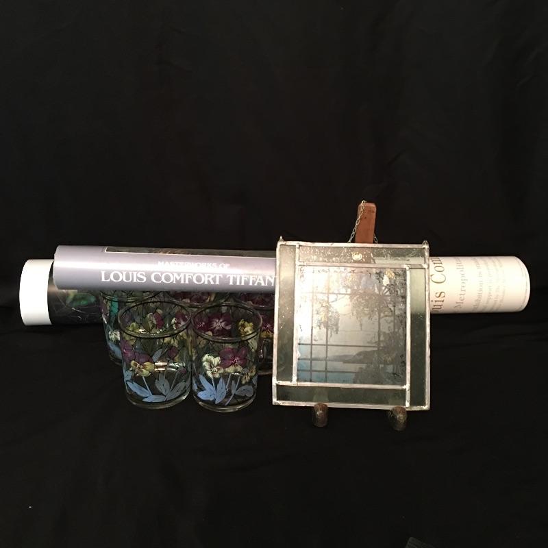 Lot includes five floral design glasses by Cora, a leaded glass hanging art piece and two posters featuring stained glass art. One poster is still wrapped in plastic. Leaded glass art measures 7.5” x 7.75”