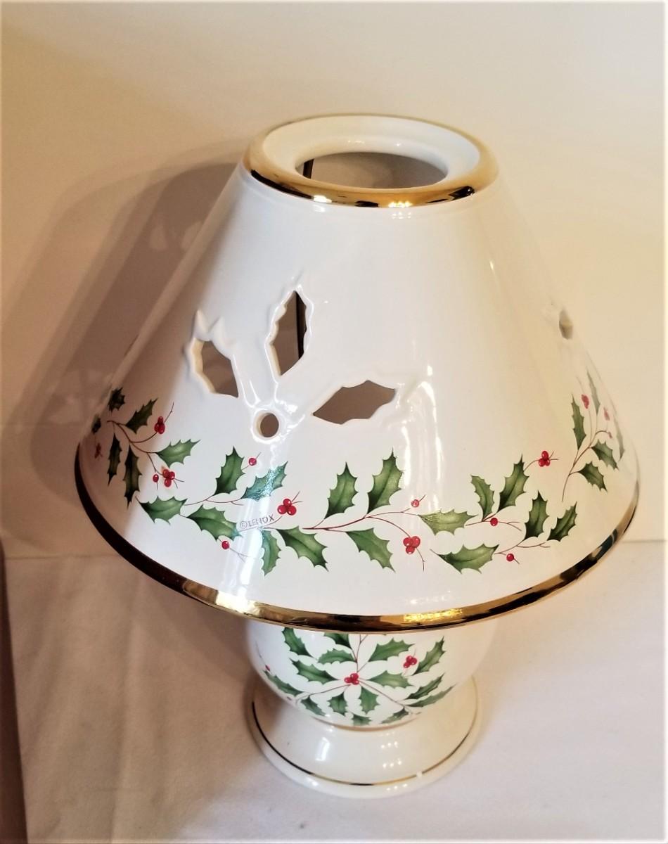 This pretty LENOX porcelain candle lamp in done in the "Holiday" pattern and has never been used. 10" tall.