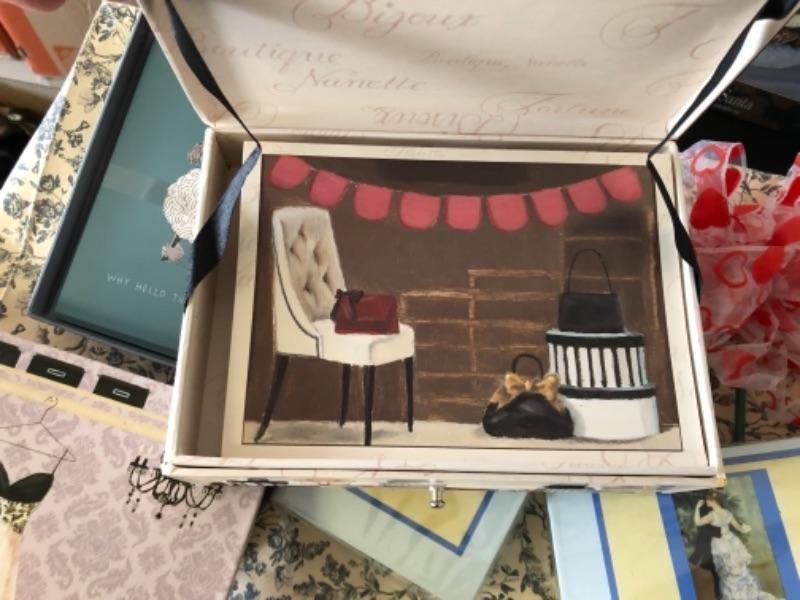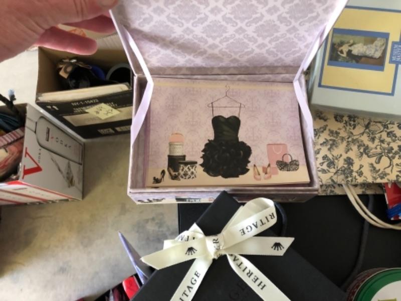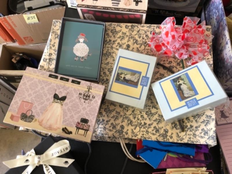 Lot 79. Lot of new notepads, boxes, gift wrap, ribbon tags, gift bags, Santa figure, two baskets, etc.--WAS $55““NOW $27.50