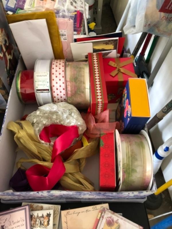 Lot 79. Lot of new notepads, boxes, gift  wrap, ribbon tags, gift  bags, Santa figure, two baskets, etc.--WAS $55““NOW $27.50
