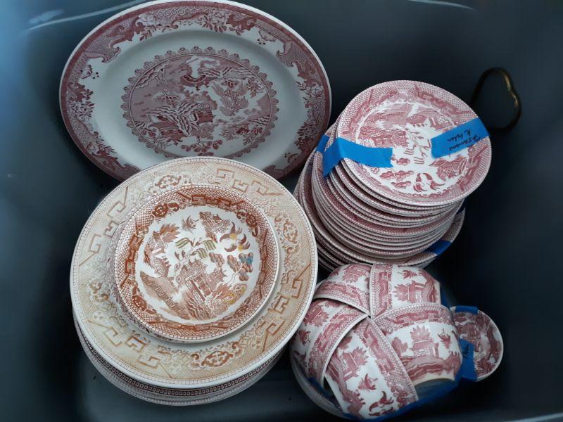 Lot 79 LR: Red/Pink Willow Ware Platter, Tea Cups/Saucers, Sugar/Creamer and much more!
