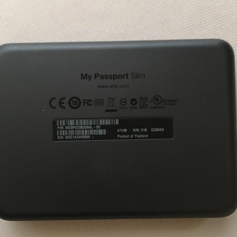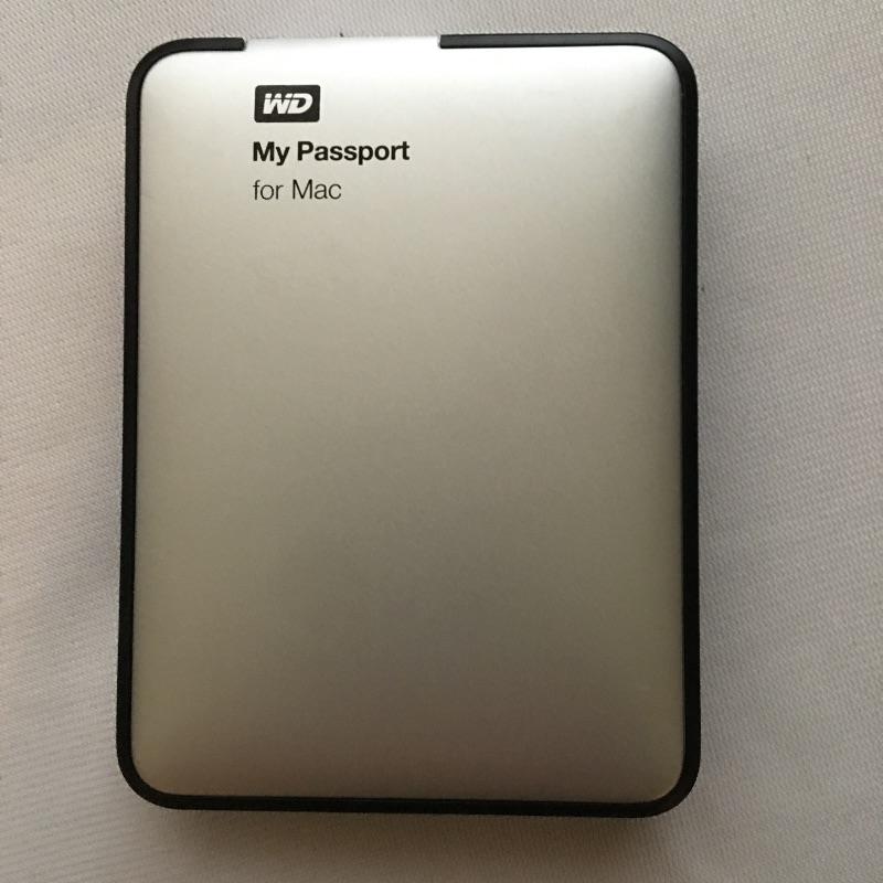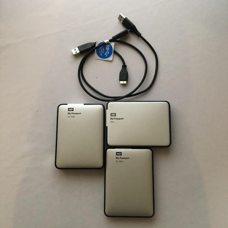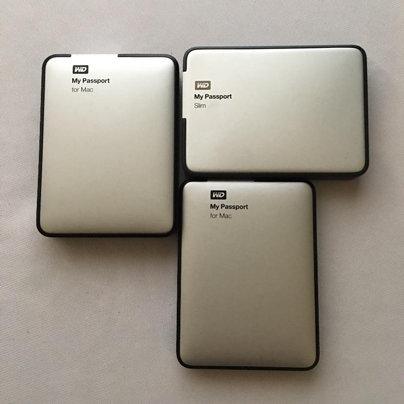 Trio of My Passport portable storage. Lot includes two for Mac, one and two terabyte drives and one two terabyte drive marked slim. You should be in great shape for back up with five terabytes of storage for backup.