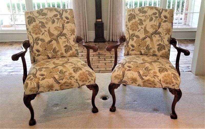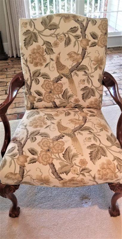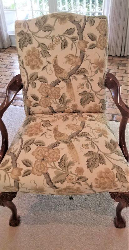 Lush pair of armchairs here - one has a small nick on the arm (as shown). Upholstery good - very pretty bird on branch motif - solid and comfy. No maker noted. Each is 32" across at the arms, 22" deep, 40" tall. Price for the pair.
