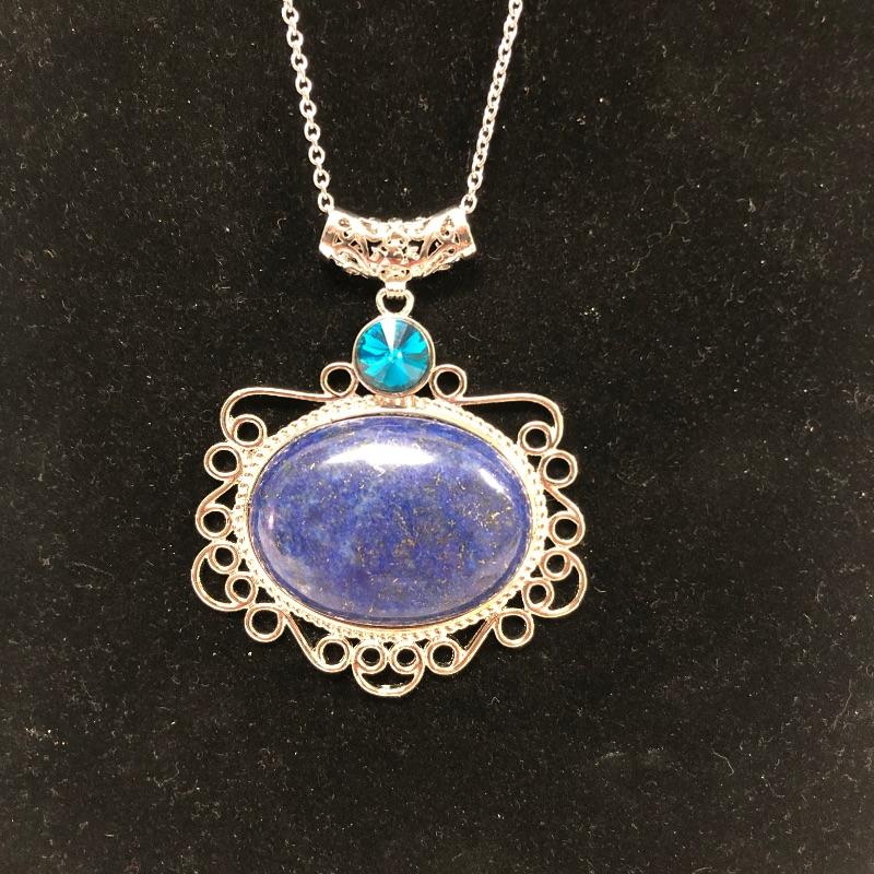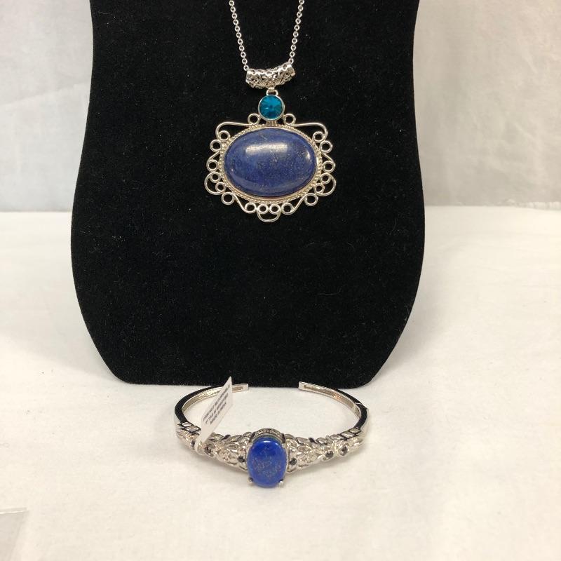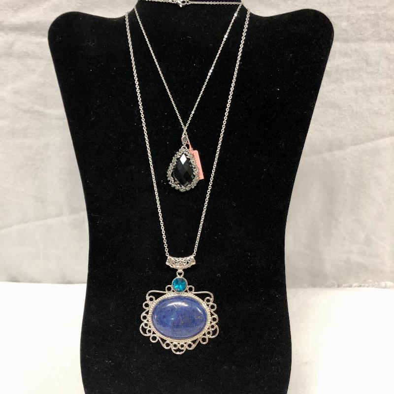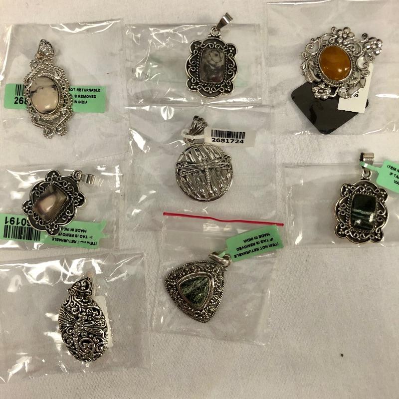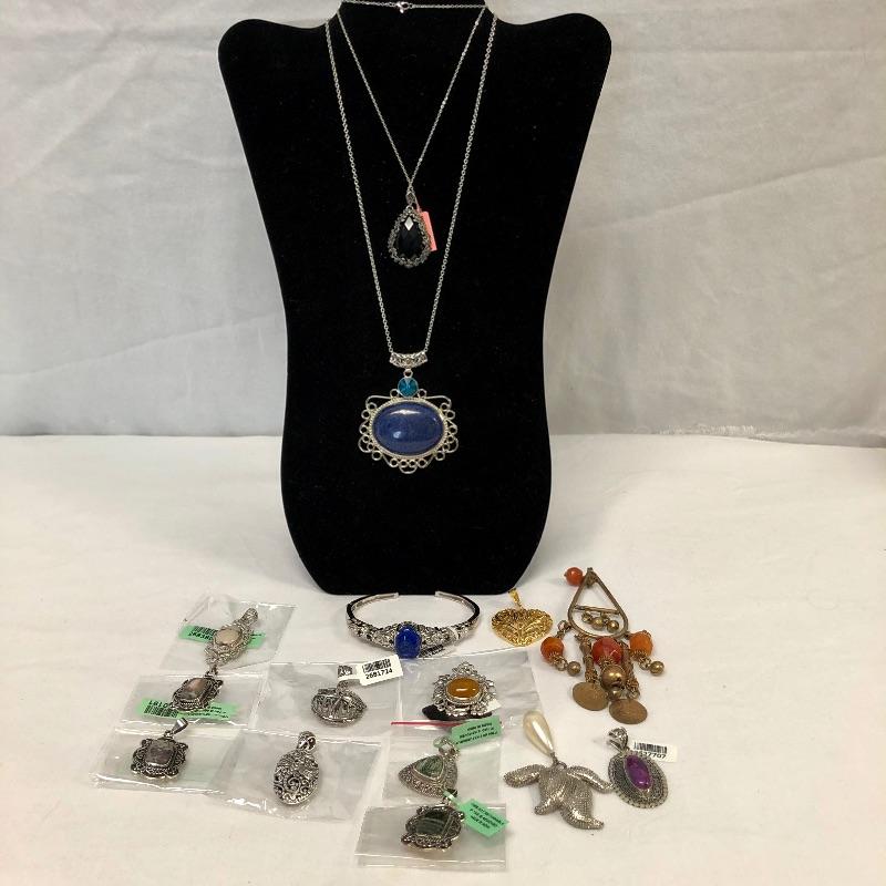 A lovely assortment of pieces that includes a matching necklace and bracelet with blue stone centerpieces. The necklace chain is marked stainless steel and measures 18”. The black stone pendant necklace also measures 18” and the pendant is marked stainless steel. Also included are 8 new in the bag pendants marked 925, an assortment of other pendants, necklaces, etc see images.