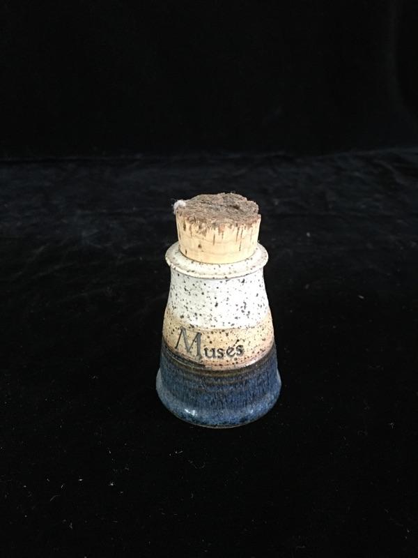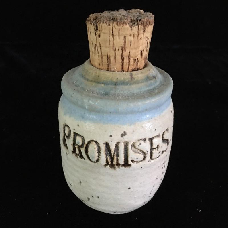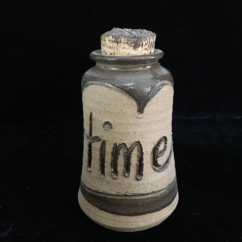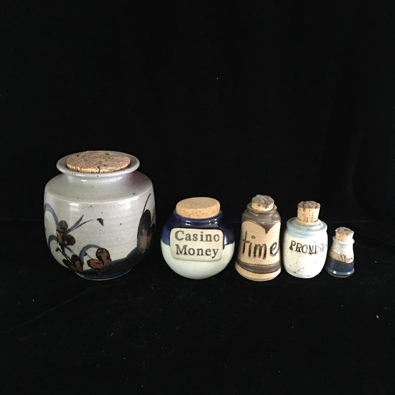 Pottery dream jars includes five jars with cork stoppers that look a little rough but are easily removed. Jars have different words including time, muses, promises and casino money. Save up for a rainy day with these unique jars. Largest jar measures 6.75”D x 7.75” tall.