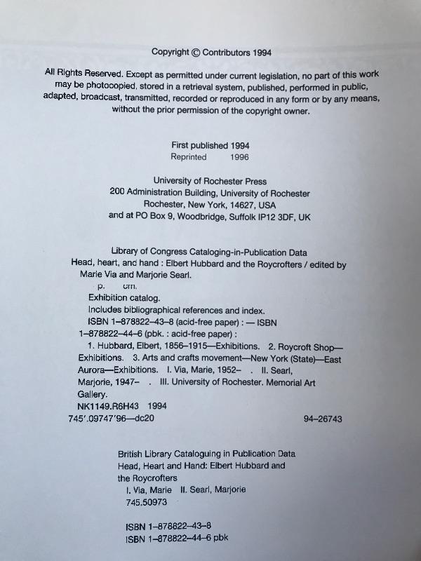 “Head, Heart And Hand” By Elbert Hubbard And The Roycrofters, And “Roycroft Art Metal” by Kevin McConnell. These are great additions to any Roycraft library.