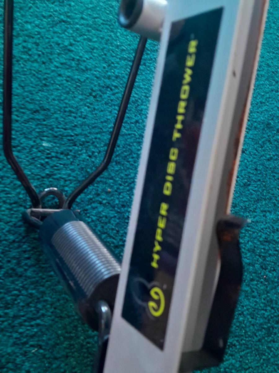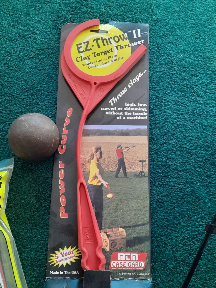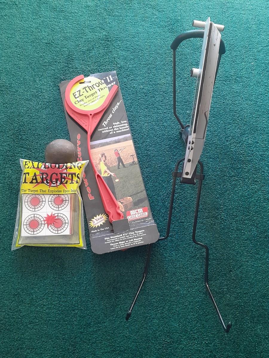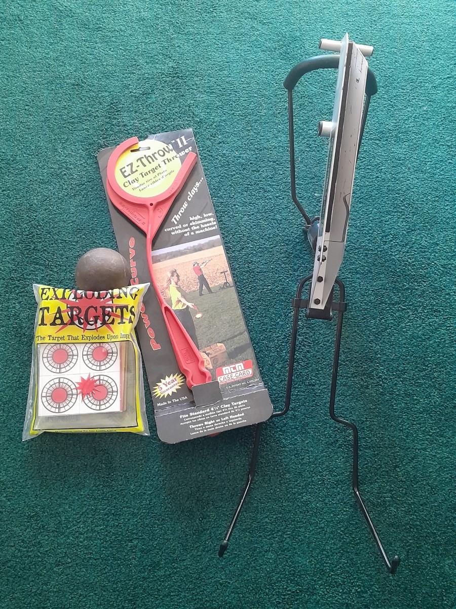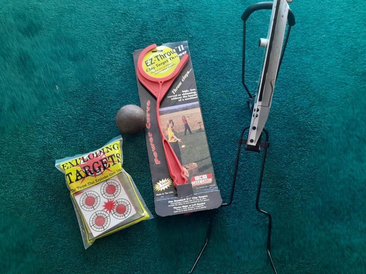 TWO DIFFERENT CLAY PIGEON THROWING TOOLS, AND A PACKAGE OF EXPLODING TARGETS