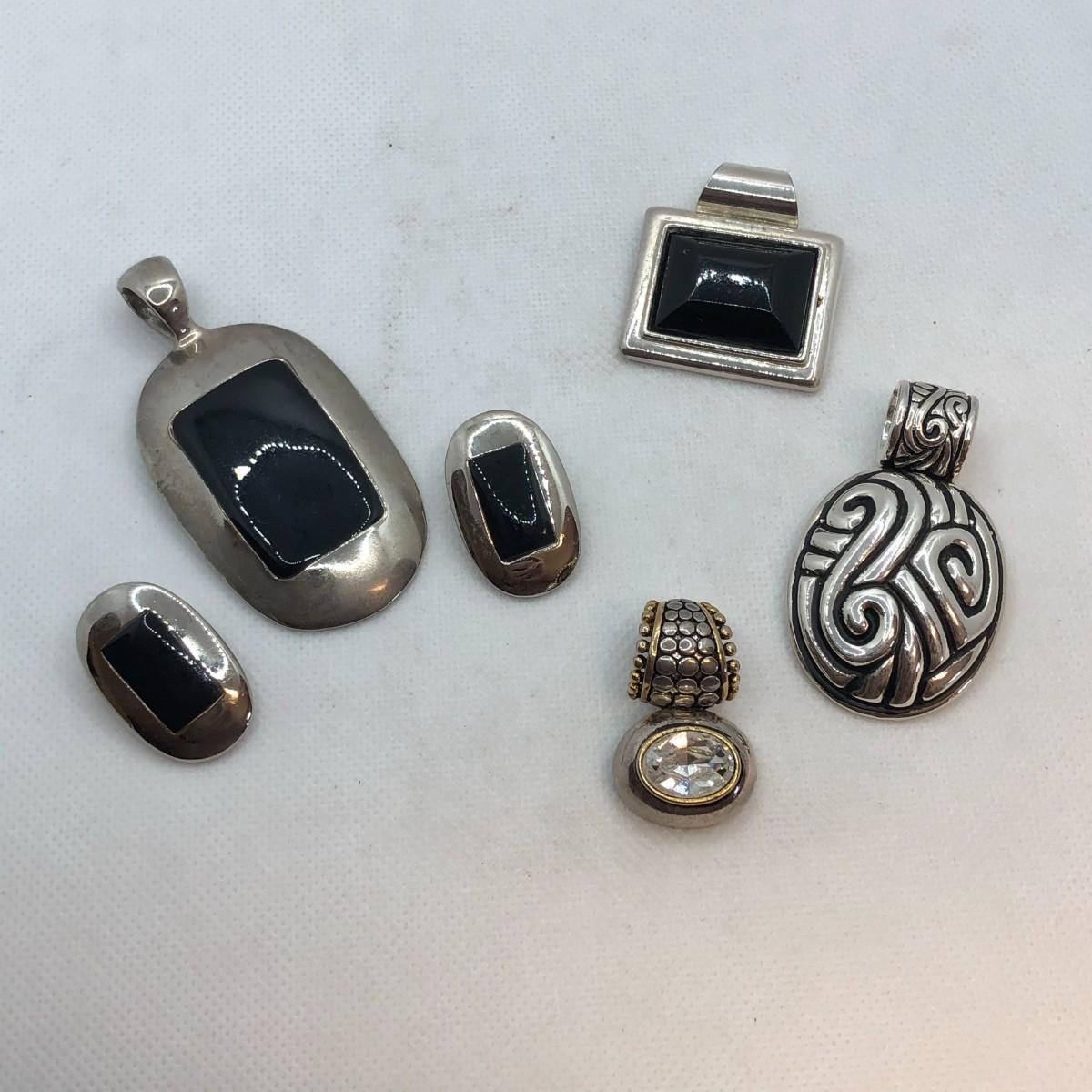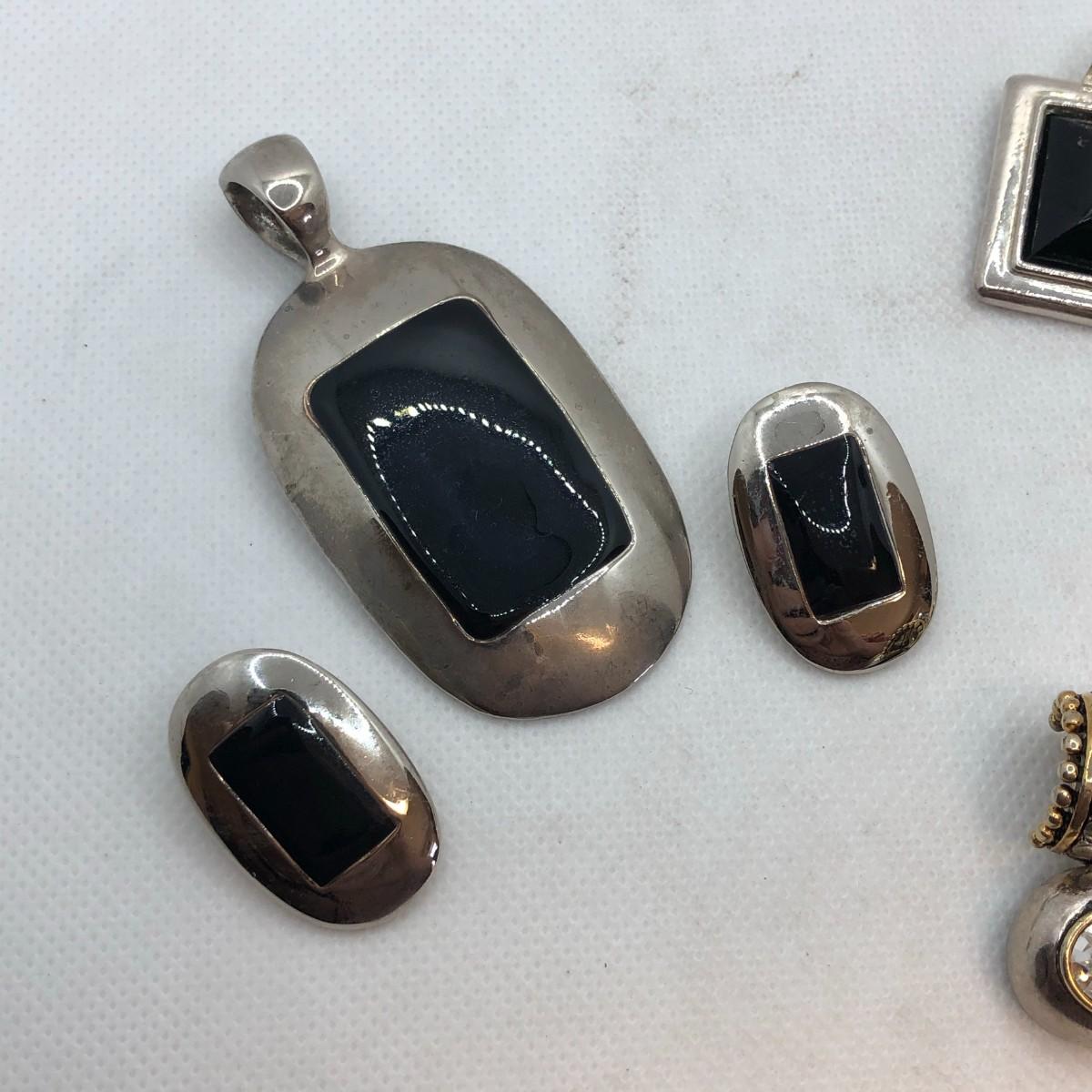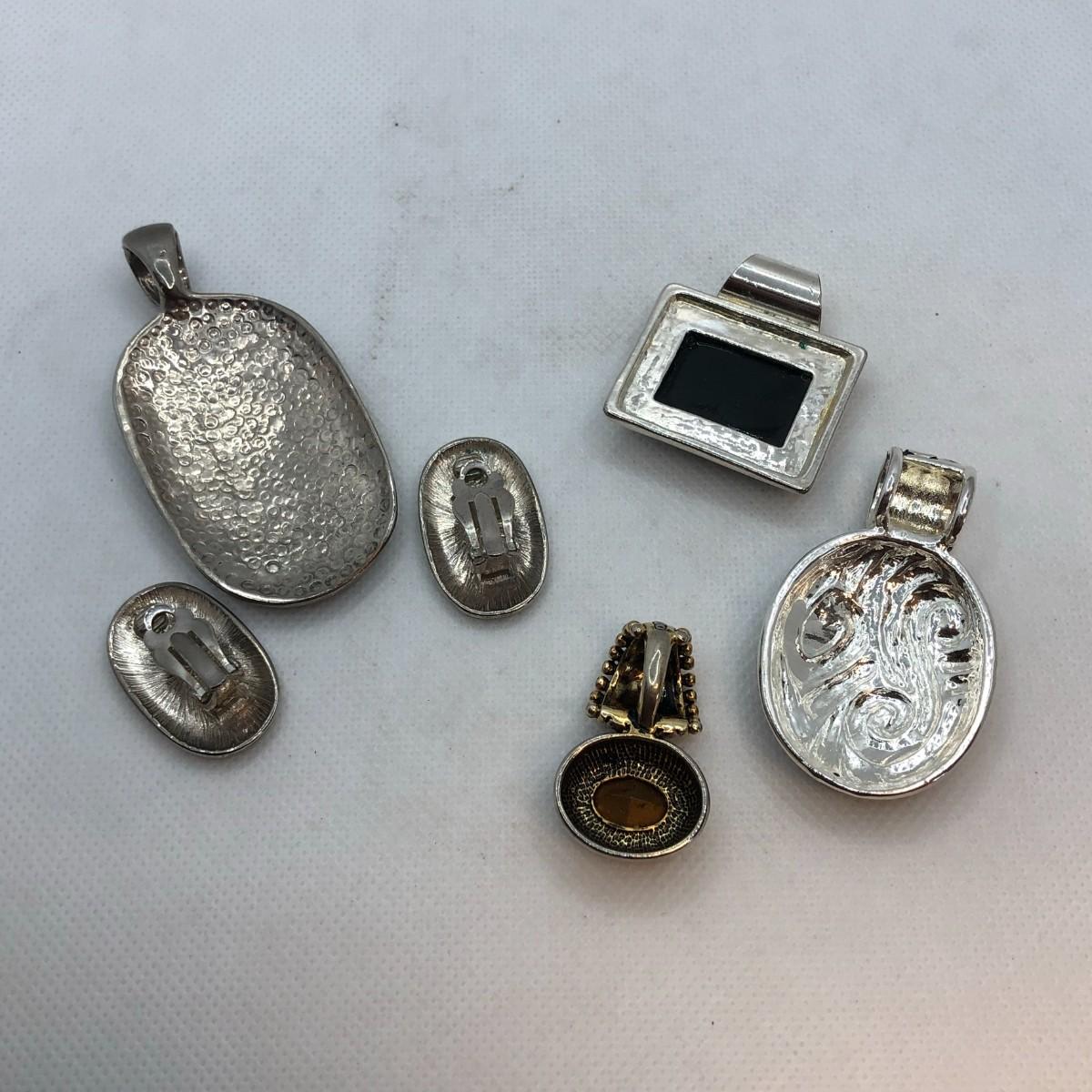 There is one set that is a pendant and clip-on earrings (on the left side). They look like they may be silverplate. All are in excellent condition, none are marked.