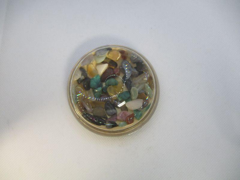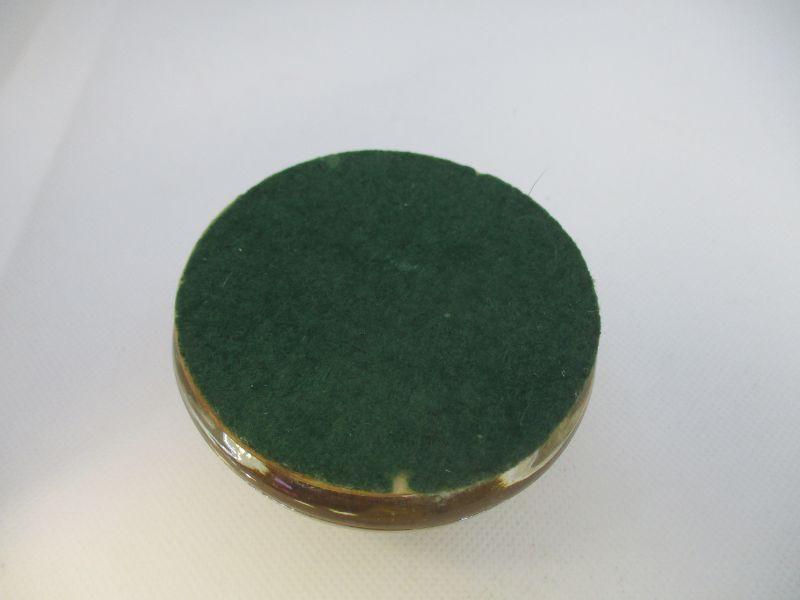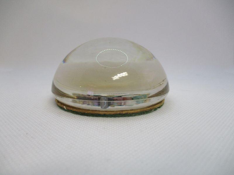 This paperweigtht could be a magnifying glass, but it has a felt bottom and small stones in the base instead. I didn't find any chips, cracks, or scratches that stood out. It is just over 3" in diameter.
