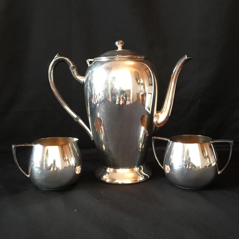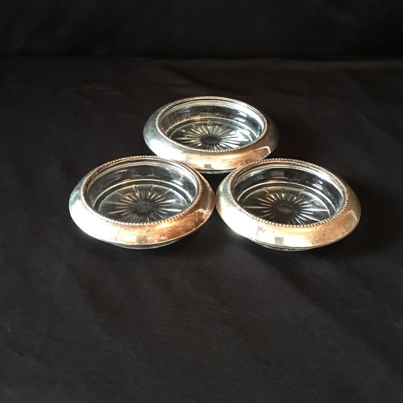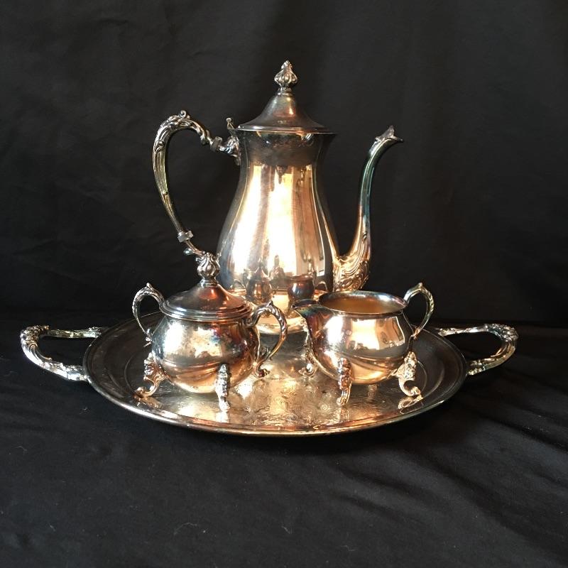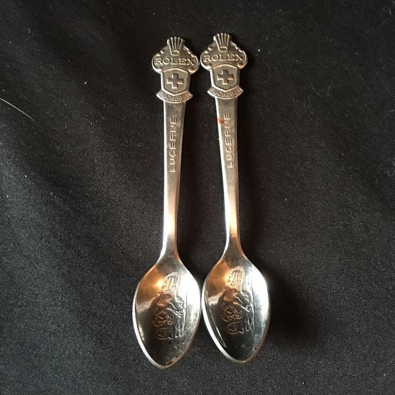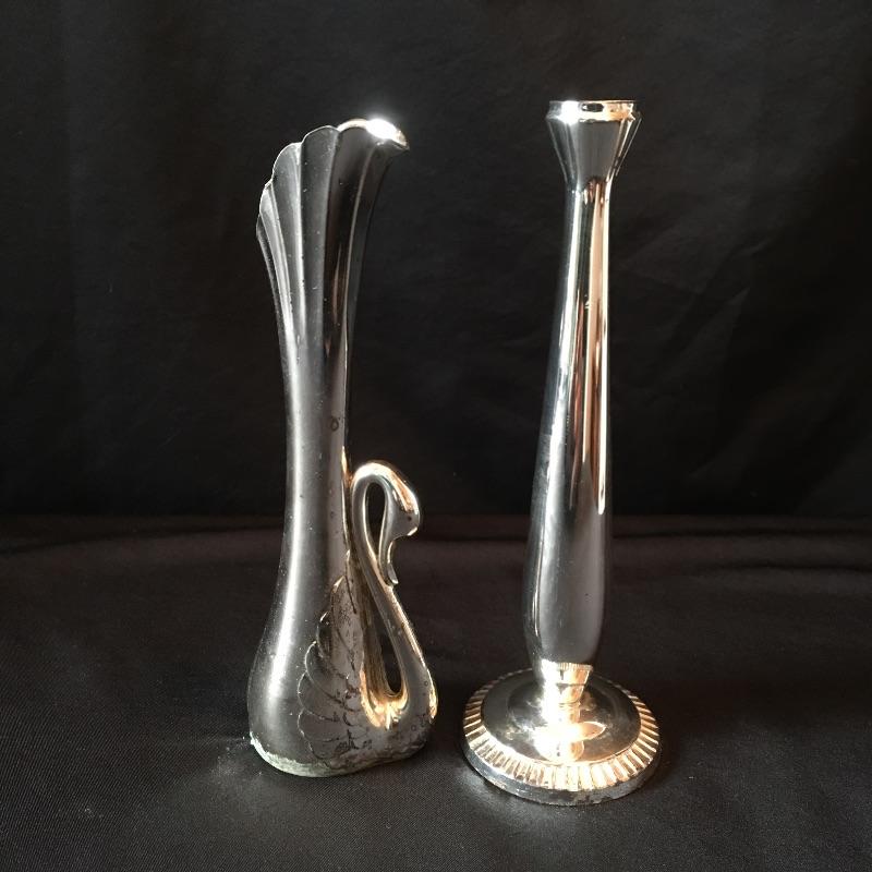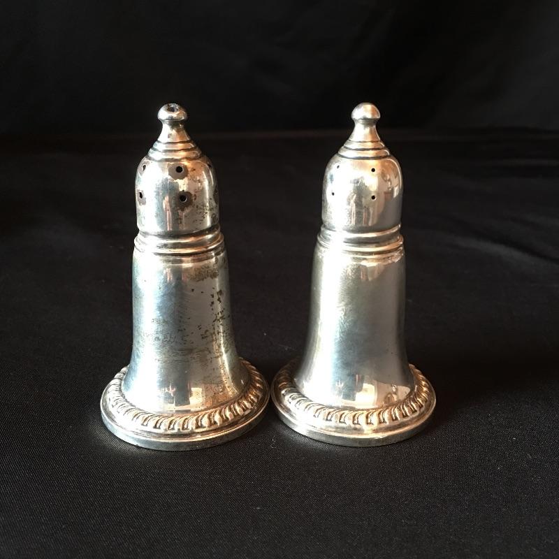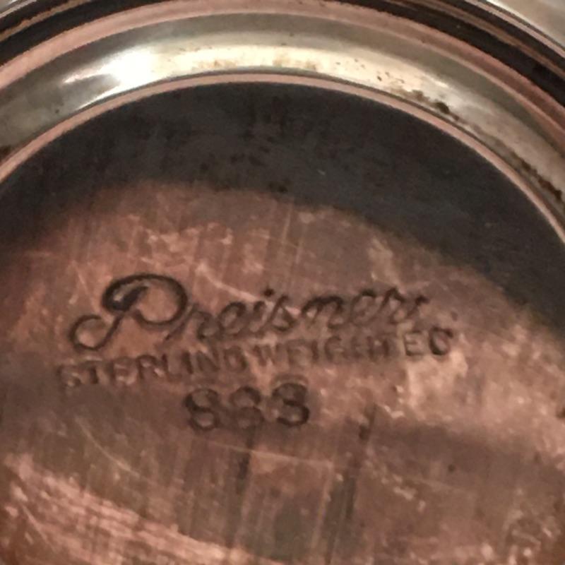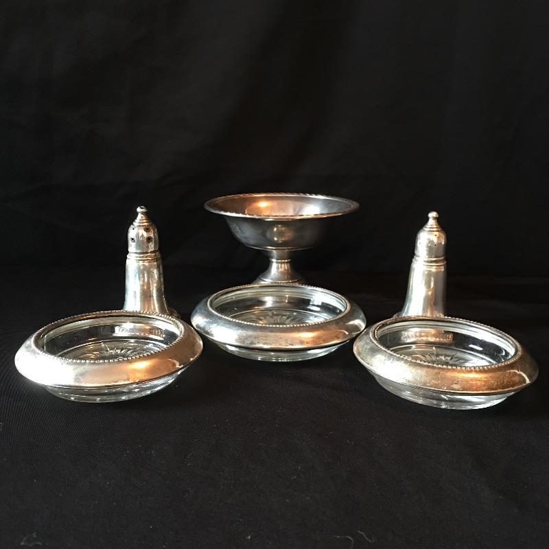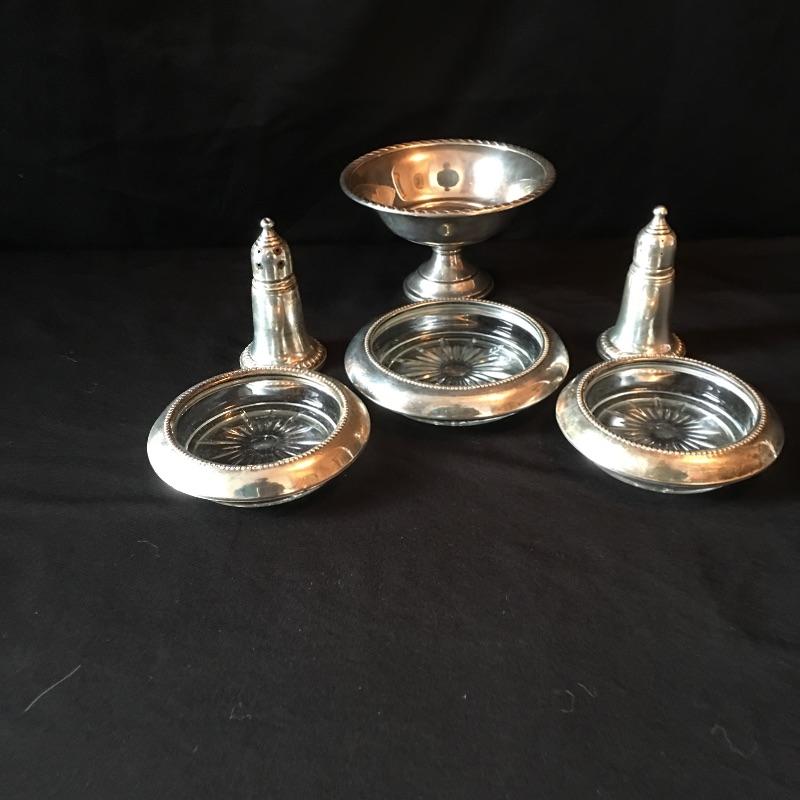 Sterling Silver items include salt and pepper shakers, stemmed bowl and three glass with sterling rim coasters. Other items are marked silver plate or unmarked and include two tea pots with cream and sugar bowls, butter dish, footed platter, bowl, platter, tongs, pair of vases and four collectible Rolex spoons from Switzerland. Shipping available.