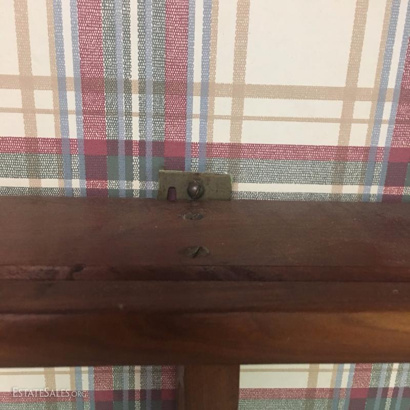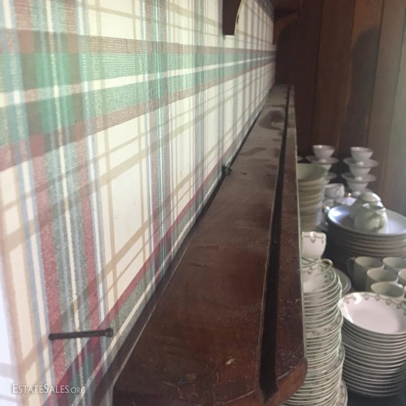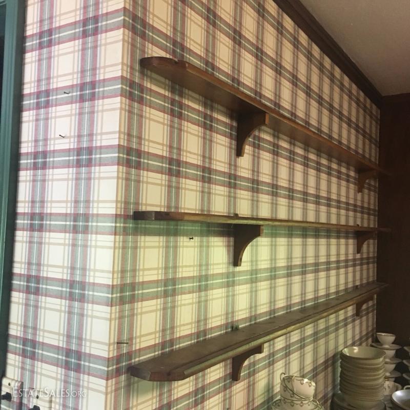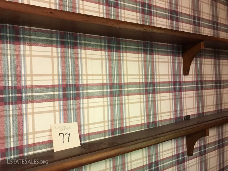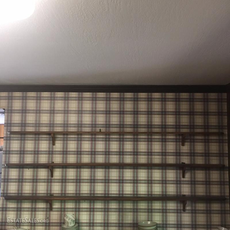 Three long wooden shelves with brackets and plate grooves. 79"l x 3.5"w x 6"h