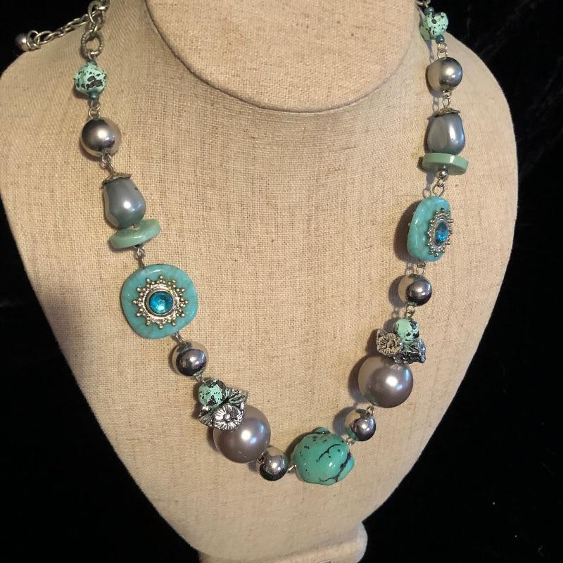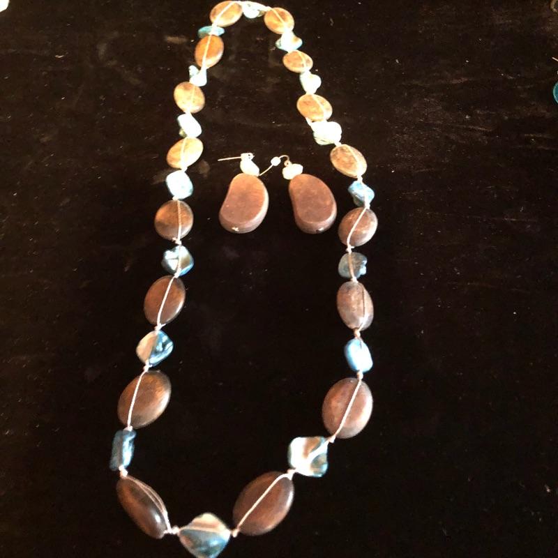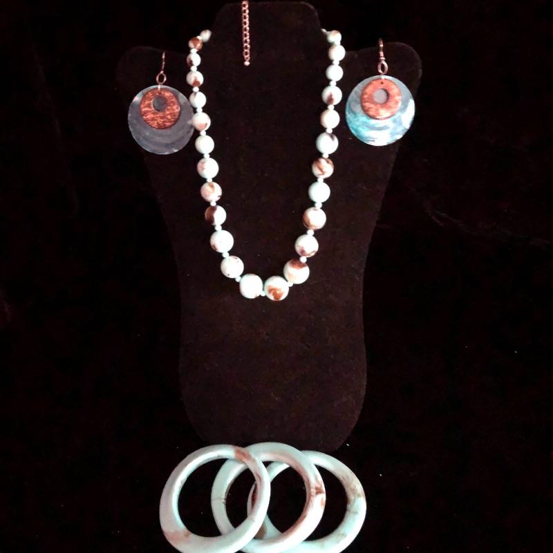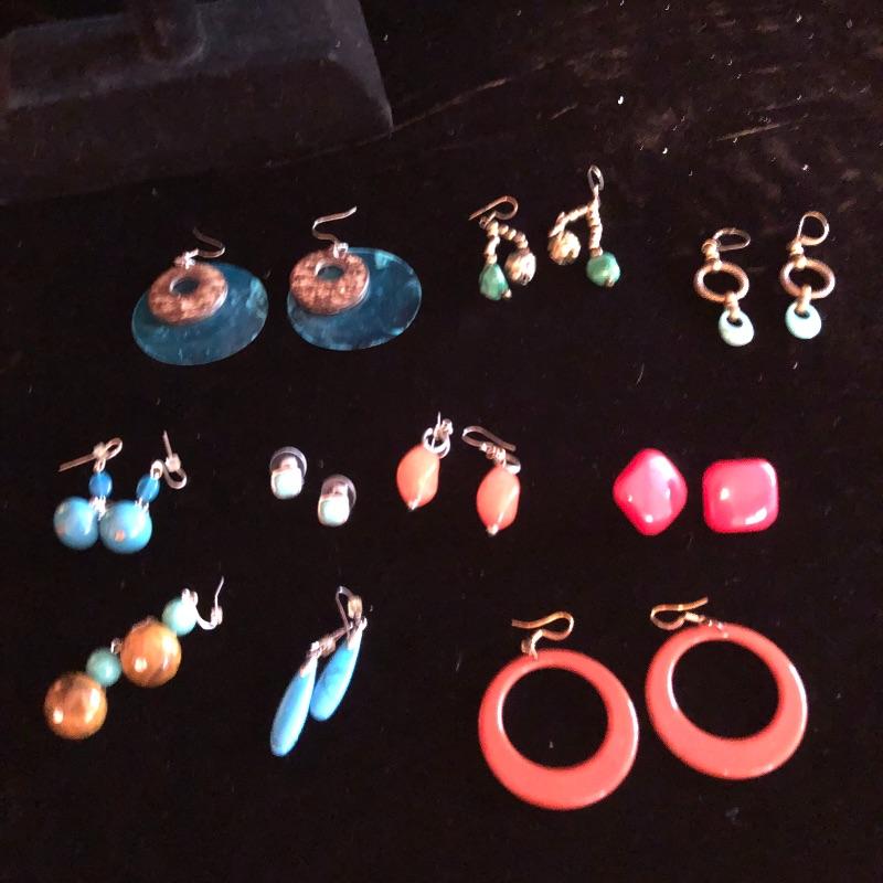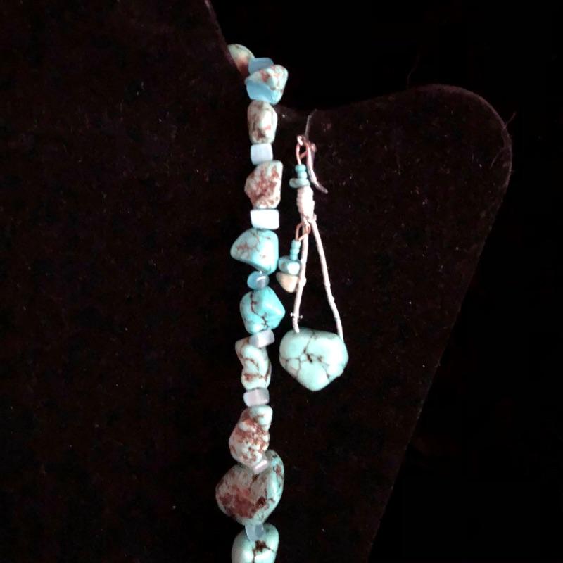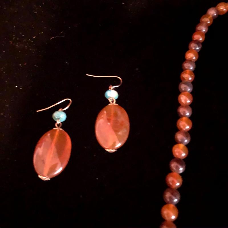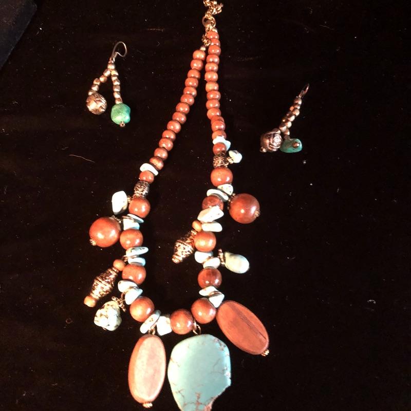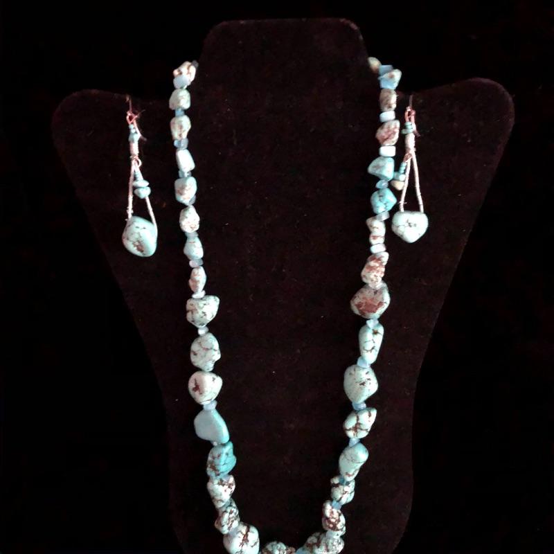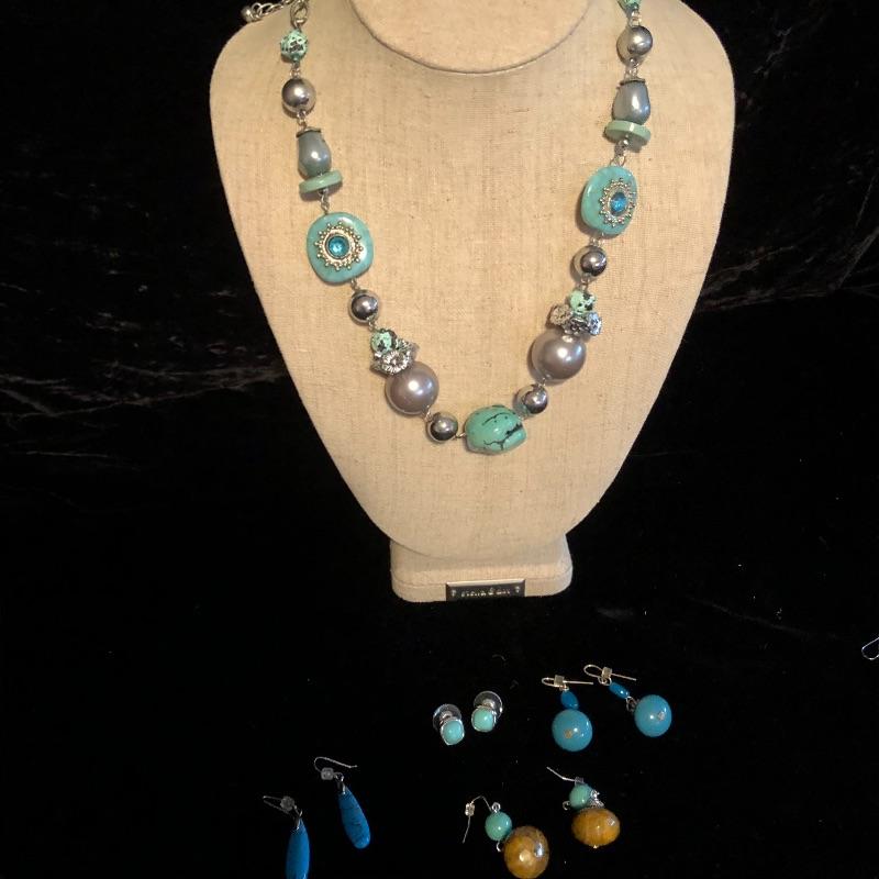 This coral and turquoise jewelry set will certainly draw attention! It contains eight necklaces five bracelets and 14 earrings. Seven of the necklaces have matching earrings with three sets having matching bracelets. Shipping Available.