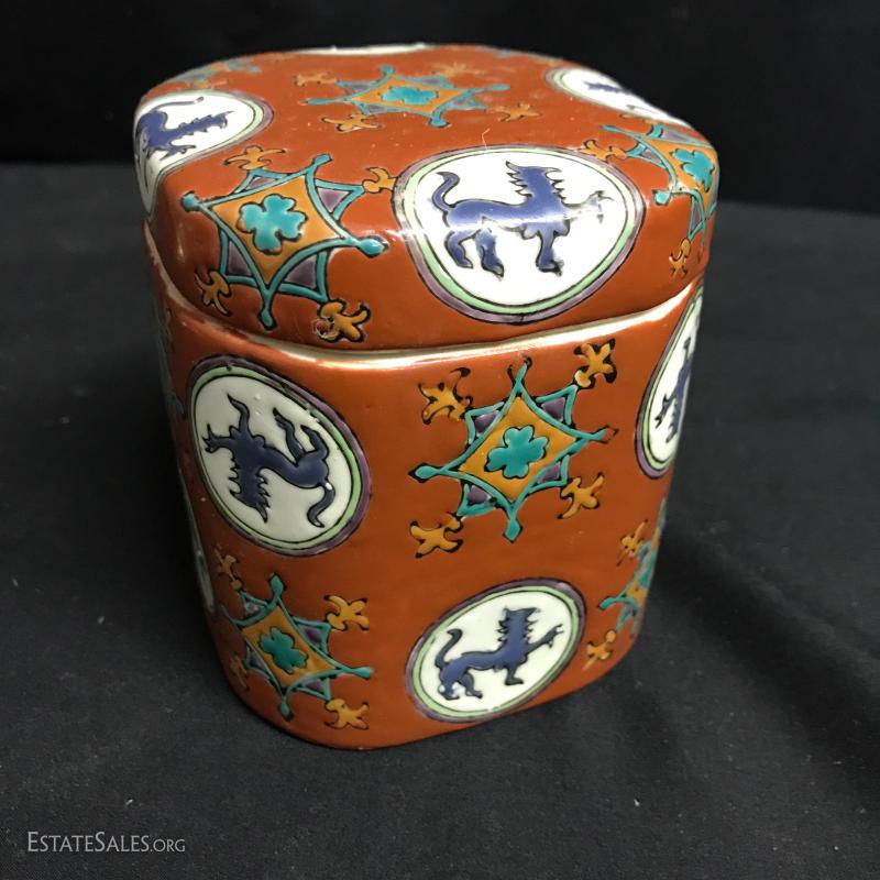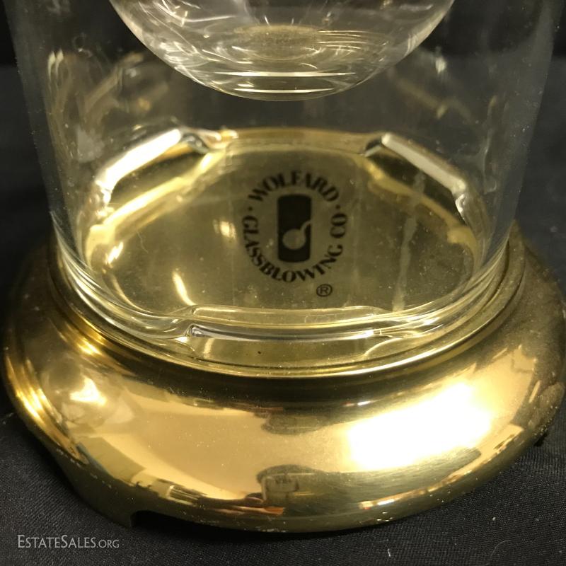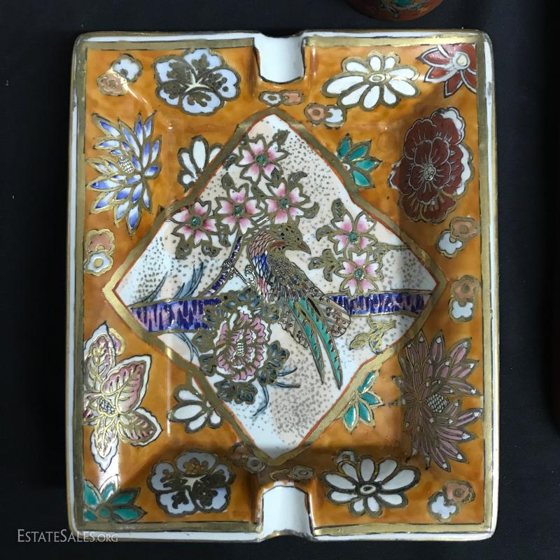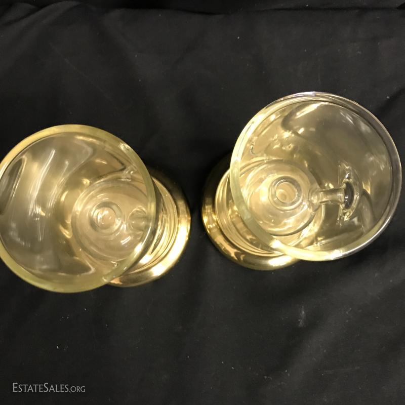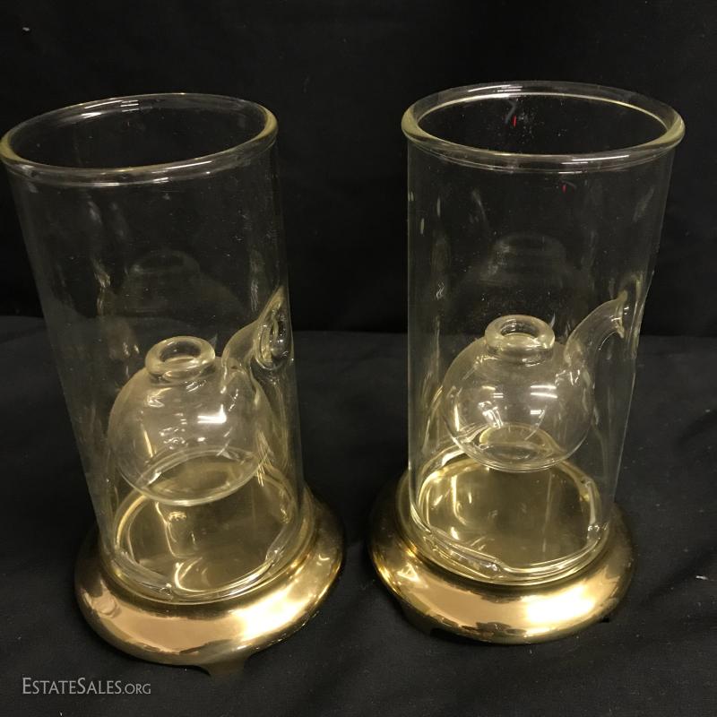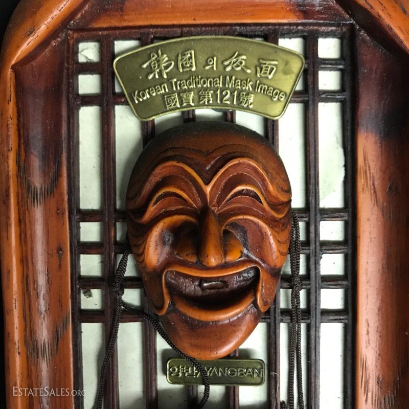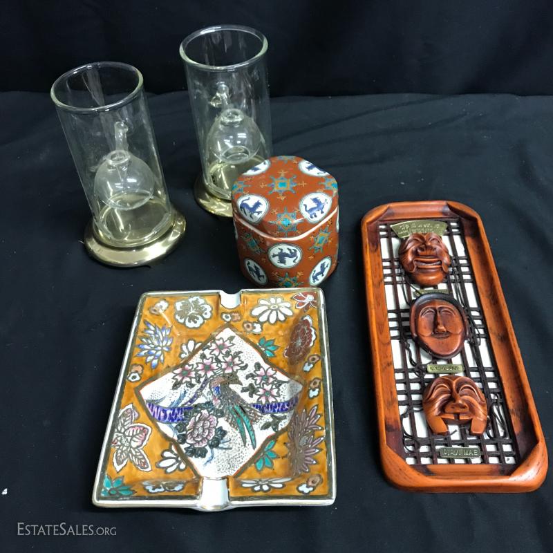 Two matching glass vases with brass stands made by Wolfard Glass Blowing Company. 7"tall. One covered ceramic jar. One painted ashtray. One Korean Mask wall art. 12"l x 5"w.