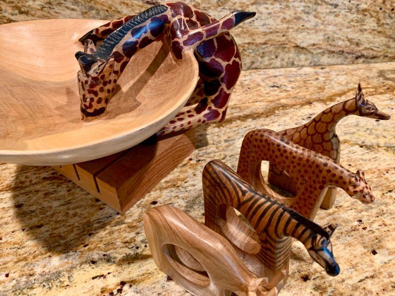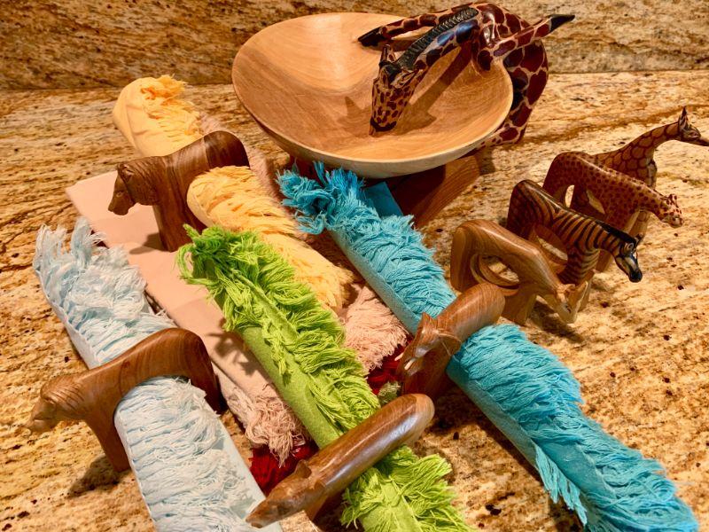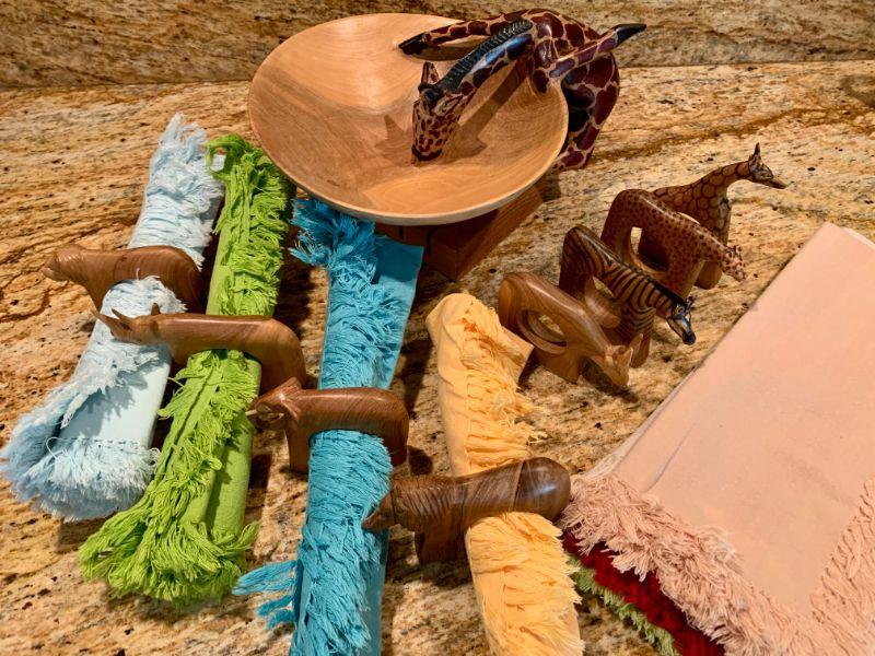 Vintage African souvenirs. Wooden bowl with a carved giraffe and 8 carved animal napkin rings. Solid color napkins.