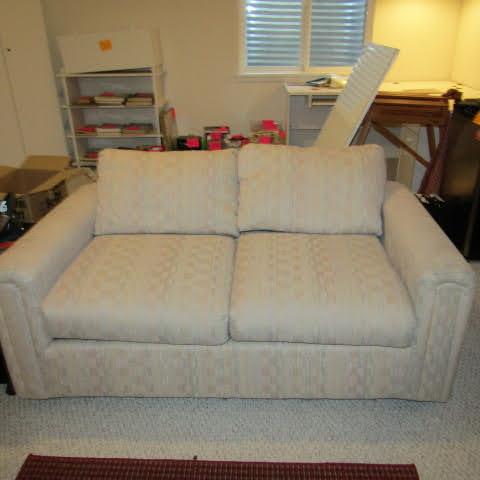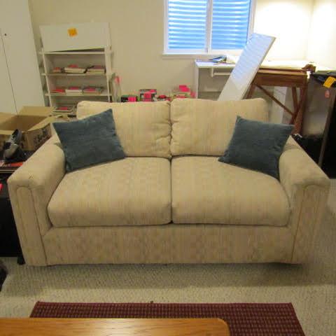 CREAM CHECK PATTERN LOVESEAT. MEASURES APPROXIMATELY 60x34. COMES WITH 2 SMALL BLUE THROW PILLOWS. VERY CLEAN AND COMFY