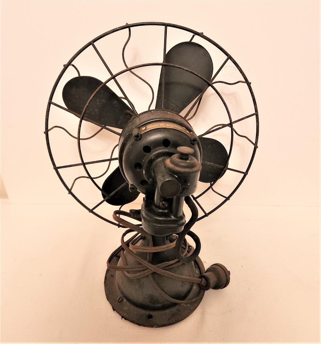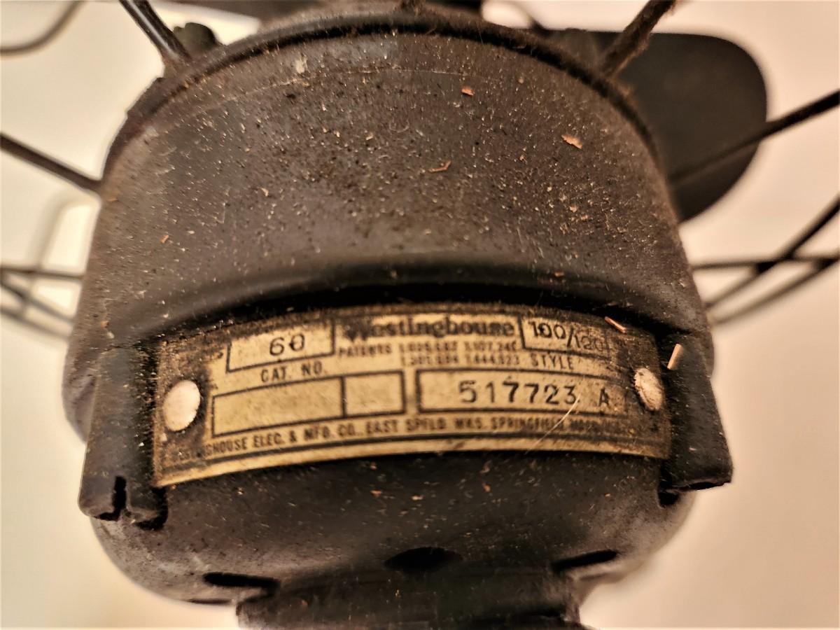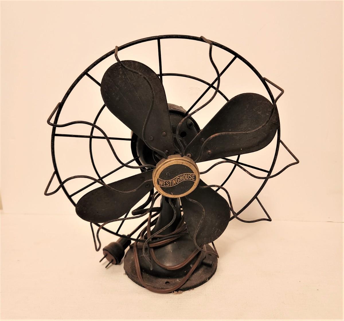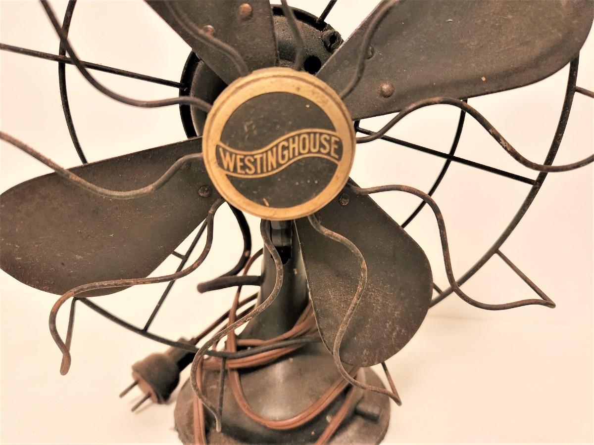 Cool old Westinghouse table fan, Model 517723A, 10.5" across, 13" tall. Note: The cord is dry rotted and we didn't dare plug it in. You are buying this fan AS IS.