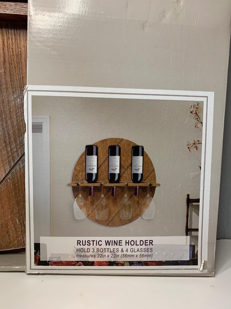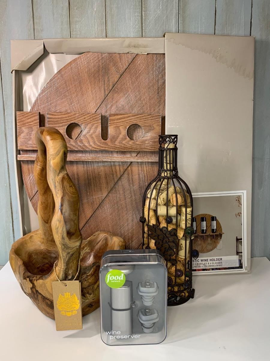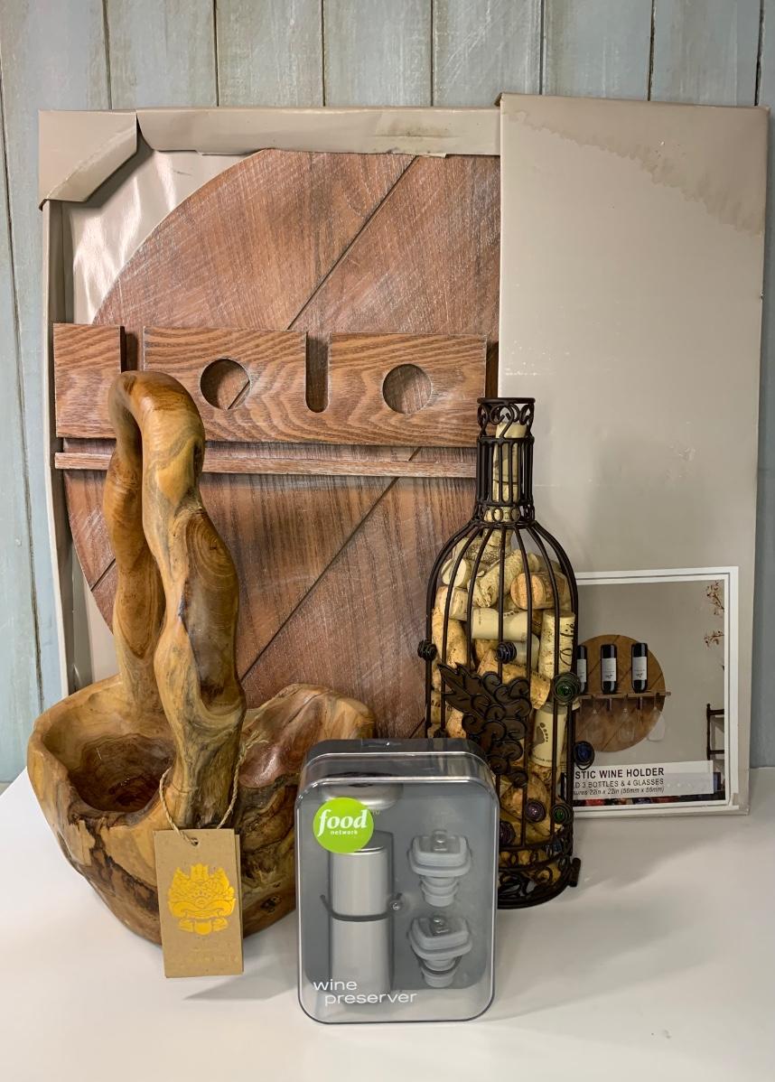 LOT 22R: Home Decor: Rustic Wine Holder, Crafted Wooden Bowl & Wine Accessories