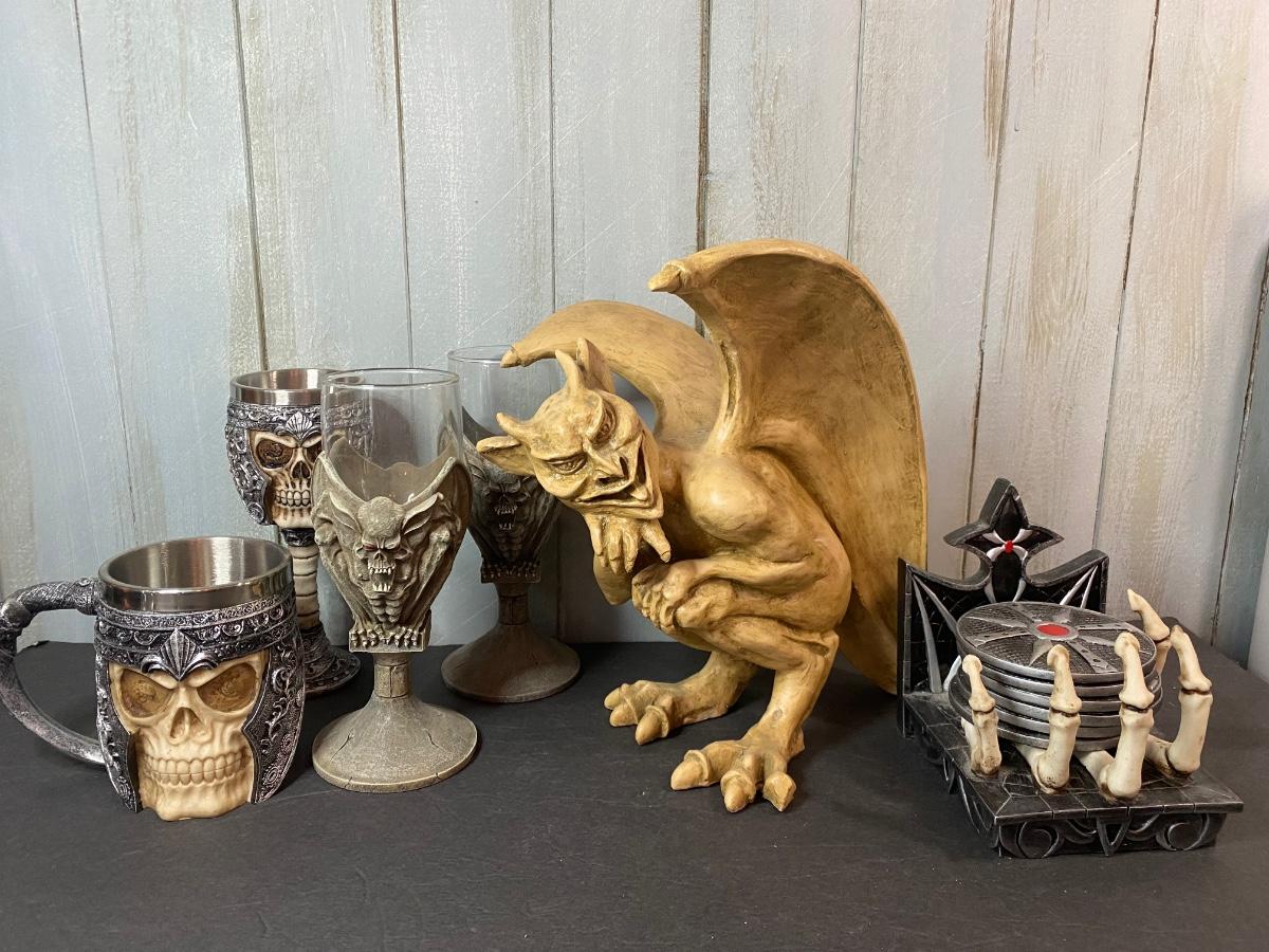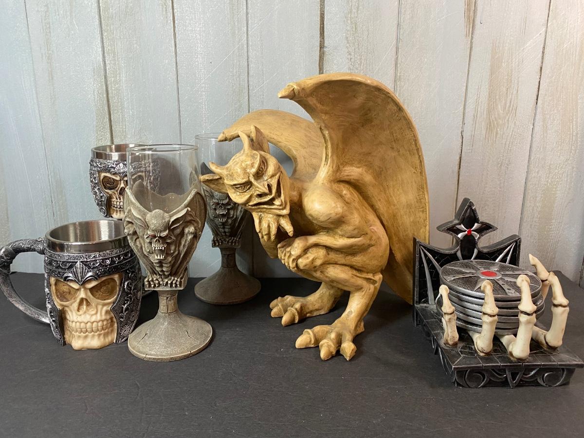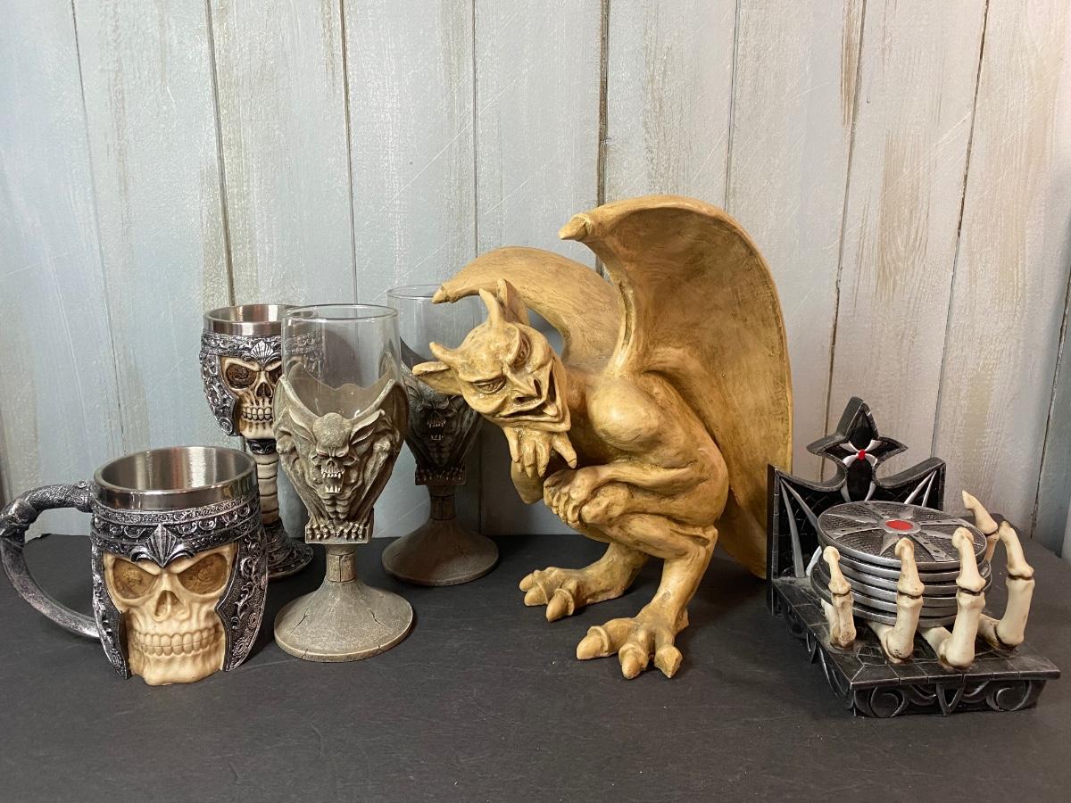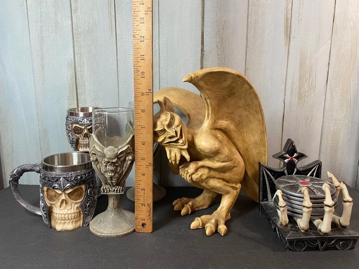 Gargoyle figurine, skull mug and goblet, gargoyle glasses and skeleton coasters. Please see all pictures as they are the best representation of the items. The pictures show condition, measurements if taken, and what is included in the lot. Due to the large amount that we photograph and the time frame, we are not always able to take measurements. All items unless noted, are pre-owned and have been used. If you purchased furniture, you must bring help. We do not allow one person to carry large furniture out on their own. Bring help, tools and a truck for the safety of our client’s homes, and your personal safety. Any damages that result to the property including walls, and floors due to moving of the furniture will be charged to the buyer. Company policy. Thank you.