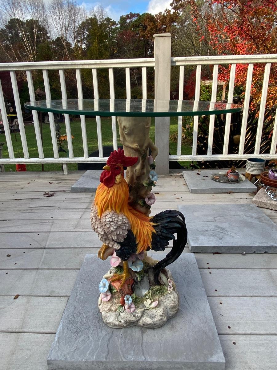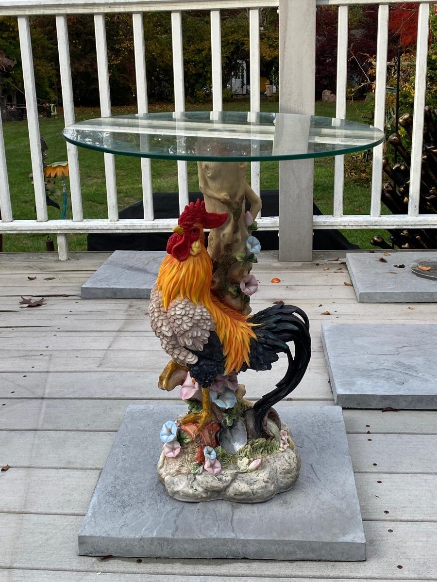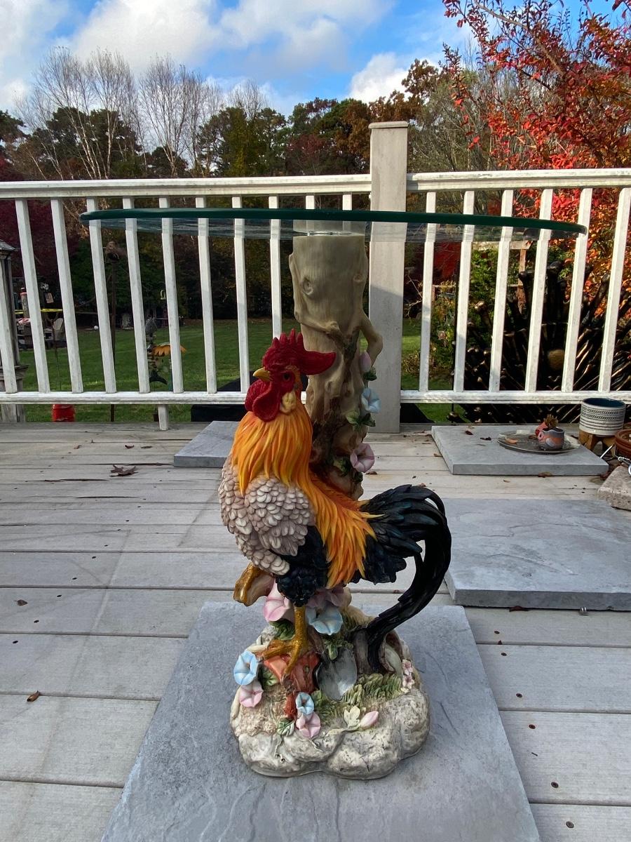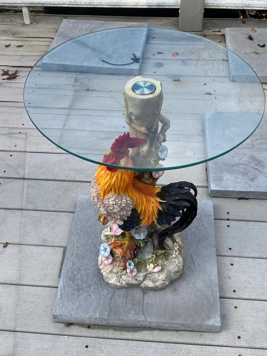 Colorful resin rooster table. Glass top screws off and on. Please see all pictures as they are the best representation of the items. The pictures show condition, measurements if taken, and what is included in the lot. Due to the large amount that we photograph and the time frame, we are not always able to take measurements. All items unless noted, are pre-owned and have been used. If you purchased furniture, you must bring help. We do not allow one person to carry large furniture out on their own. Bring help, tools and a truck for the safety of our client’s homes, and your personal safety. Any damages that result to the property including walls, and floors due to moving of the furniture will be charged to the buyer. Company policy. Thank you.