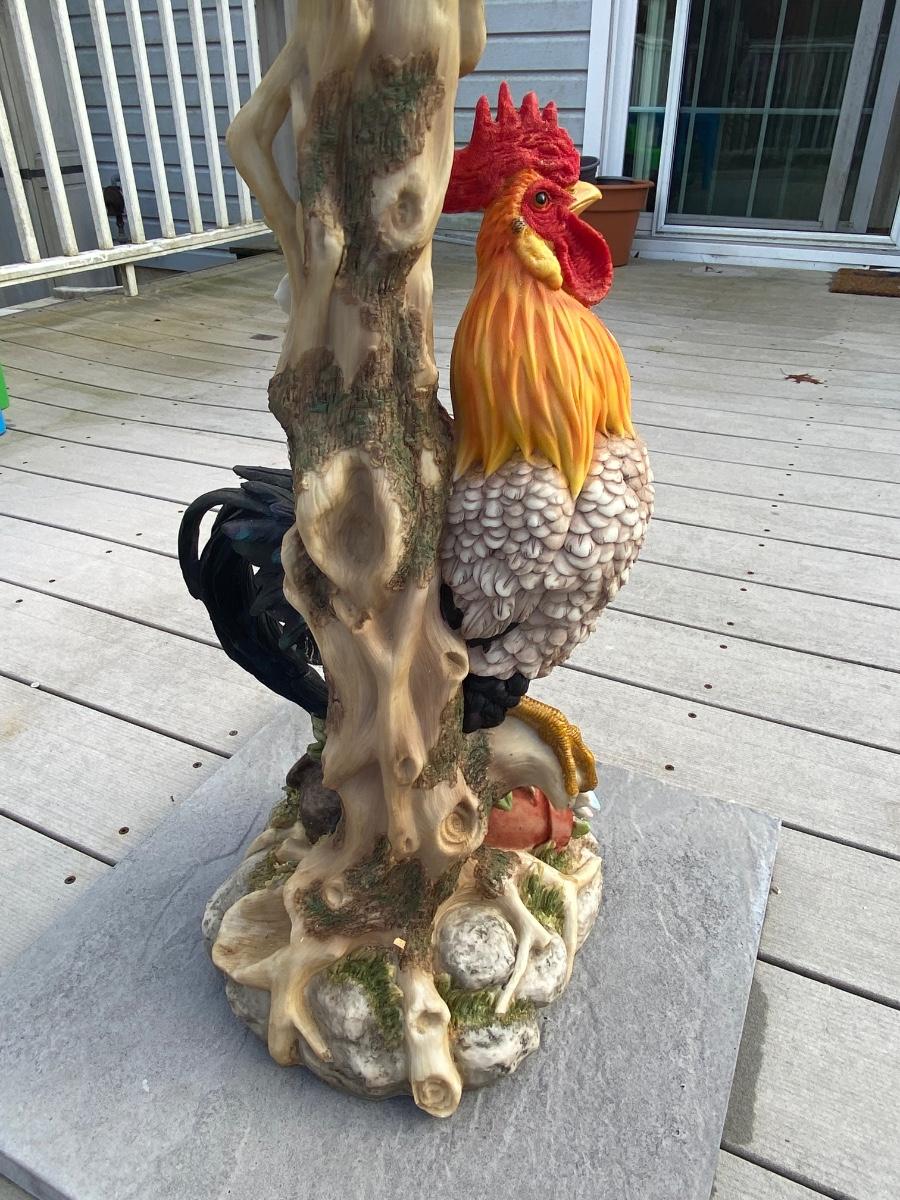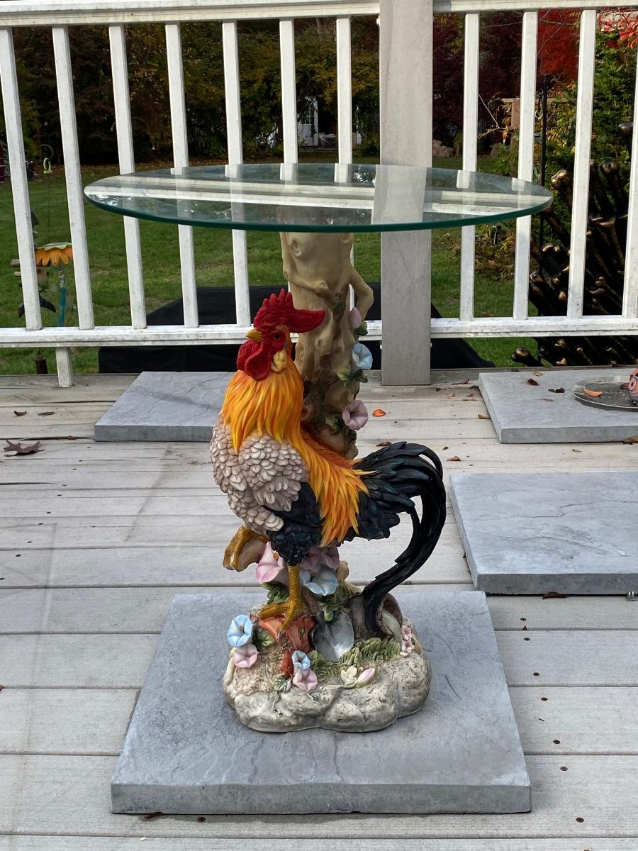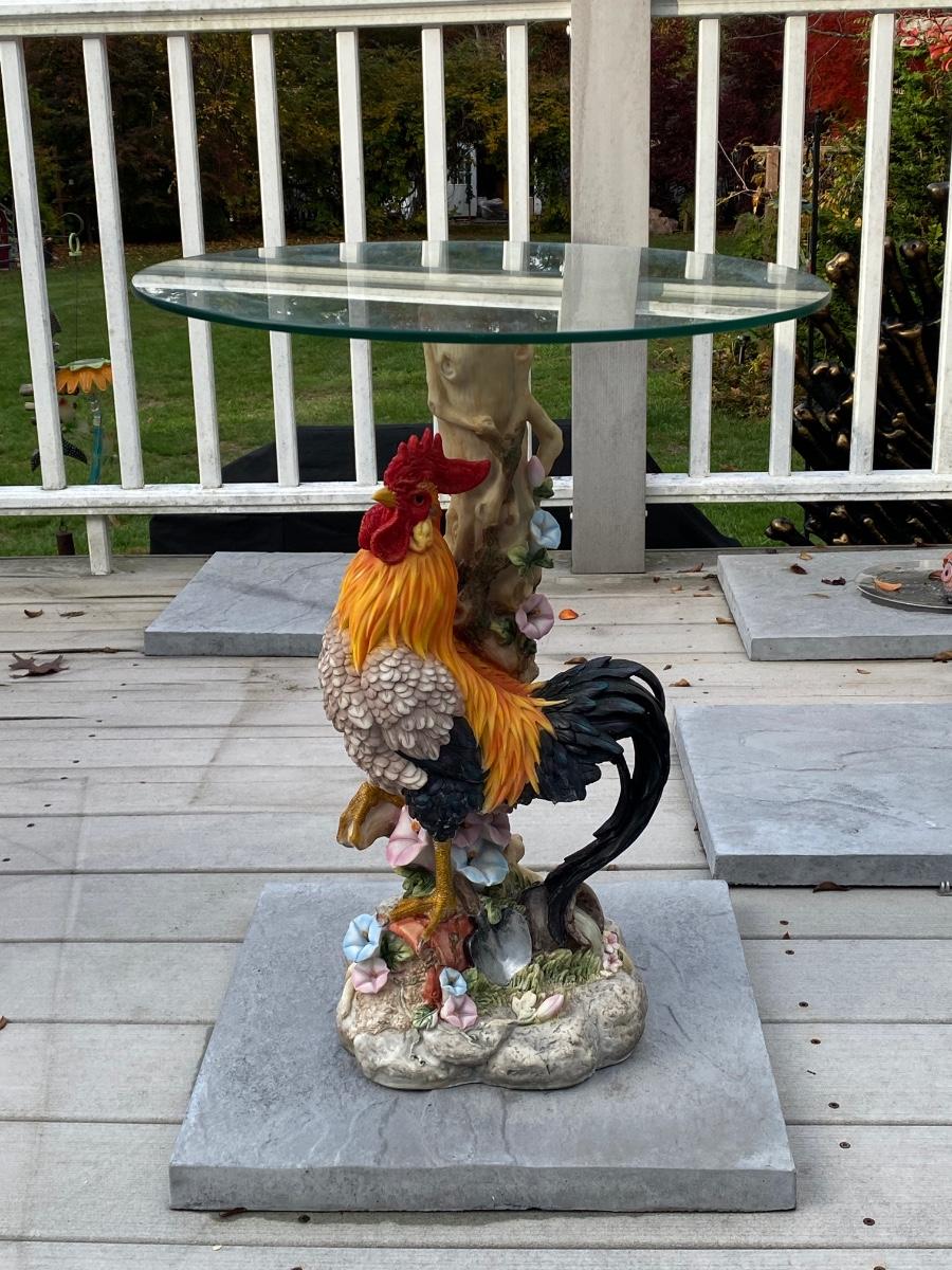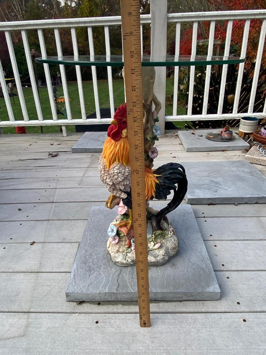 Colorful resin rooster table. Glass top screws off and on. Please see all pictures as they are the best representation of the items. The pictures show condition, measurements if taken, and what is included in the lot. Due to the large amount that we photograph and the time frame, we are not always able to take measurements. All items unless noted, are pre-owned and have been used. If you purchased furniture, you must bring help. We do not allow one person to carry large furniture out on their own. Bring help, tools and a truck for the safety of our client’s homes, and your personal safety. Any damages that result to the property including walls, and floors due to moving of the furniture will be charged to the buyer. Company policy. Thank you.