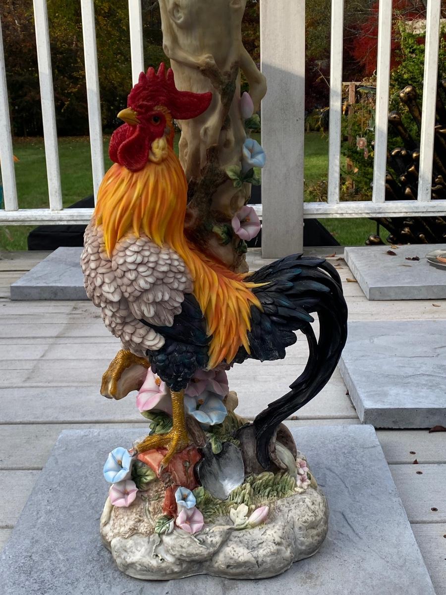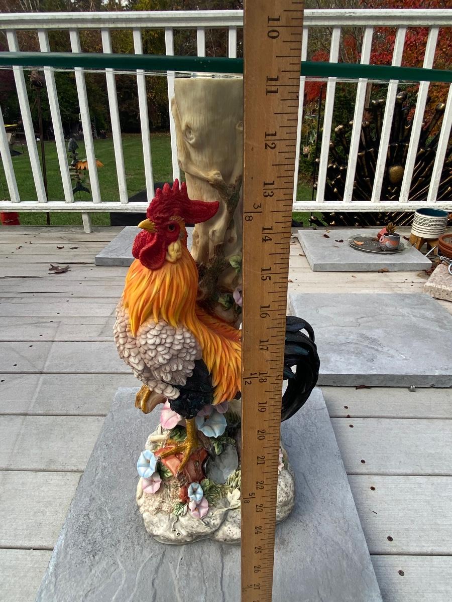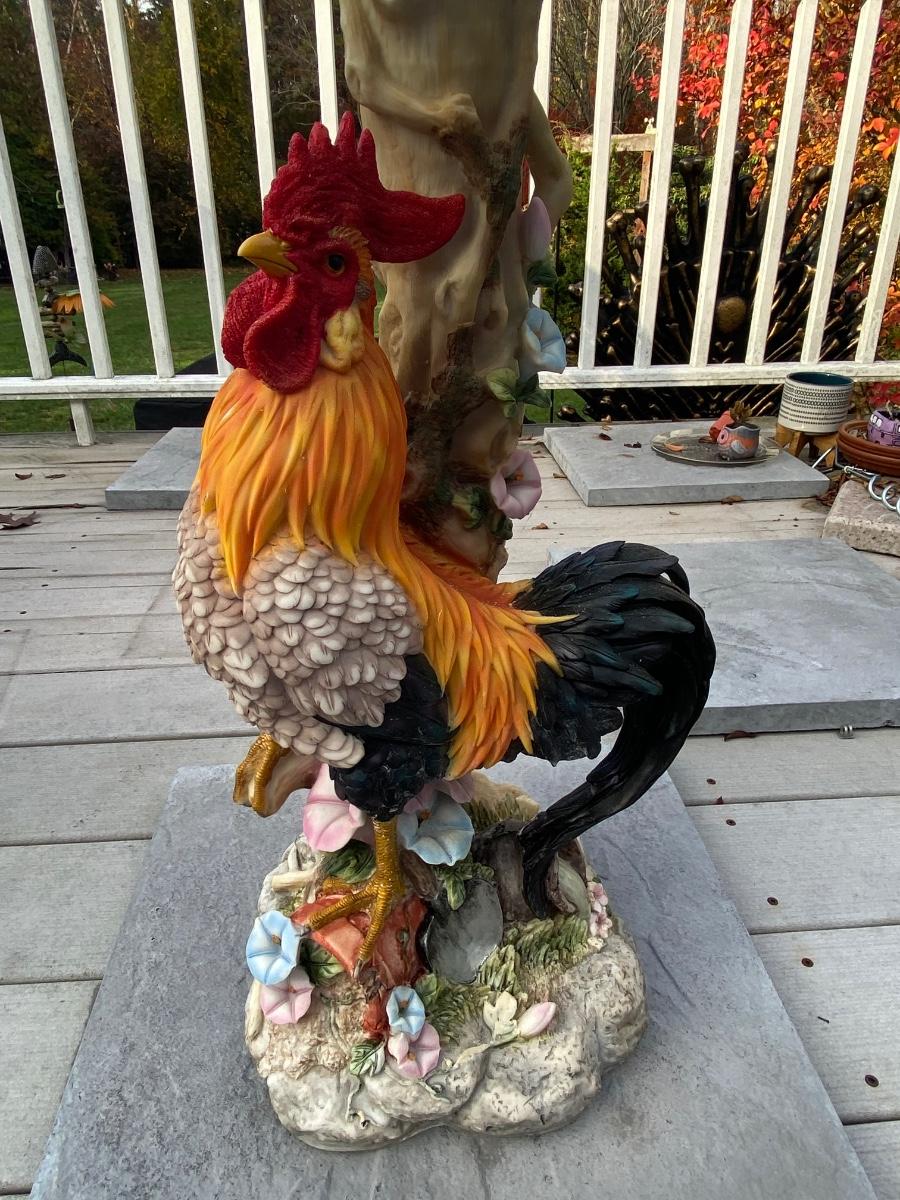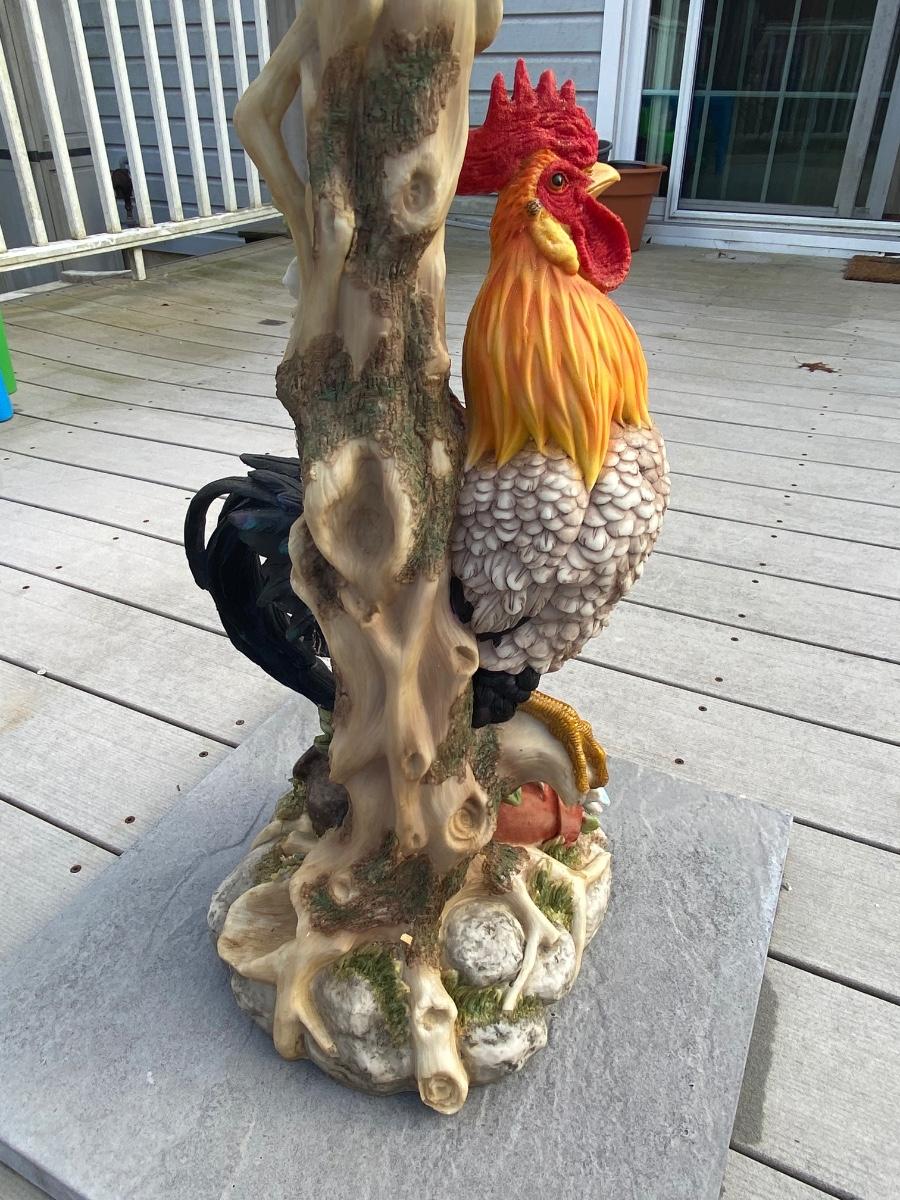 Colorful resin rooster table. Glass top screws off and on. Please see all pictures as they are the best representation of the items. The pictures show condition, measurements if taken, and what is included in the lot. Due to the large amount that we photograph and the time frame, we are not always able to take measurements. All items unless noted, are pre-owned and have been used. If you purchased furniture, you must bring help. We do not allow one person to carry large furniture out on their own. Bring help, tools and a truck for the safety of our client’s homes, and your personal safety. Any damages that result to the property including walls, and floors due to moving of the furniture will be charged to the buyer. Company policy. Thank you.