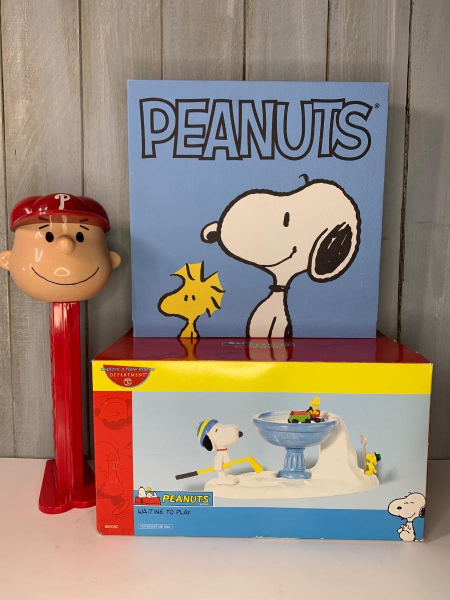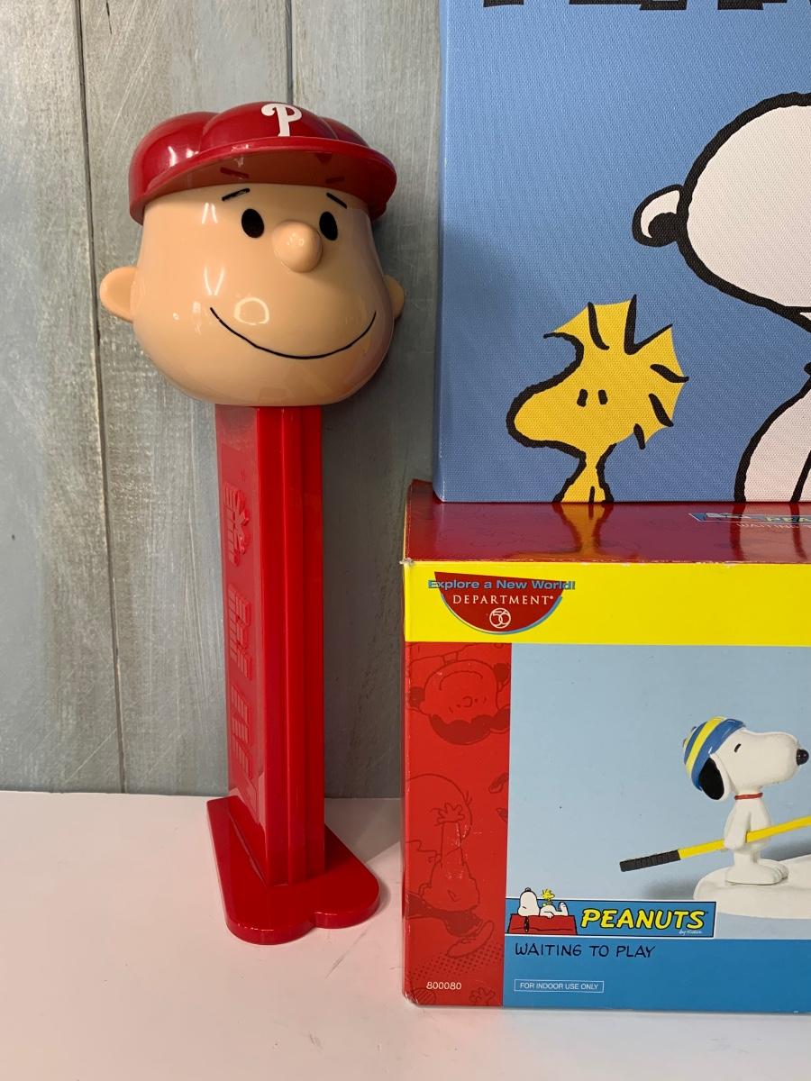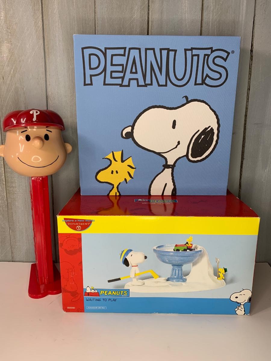LOT 96R: Peanut Collection: Dept 56 "Waiting To Play", Canvas Wall Art, Charlie Brown w/Phillies Hat Pez Dispenser