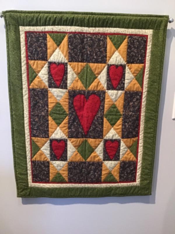 SMALL HANGING Handmade QUILT GREEN WITH HEARTS, and HANGING ROD INCLUDED