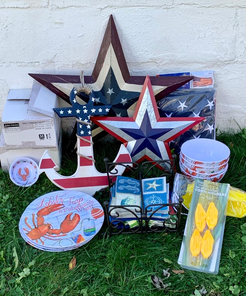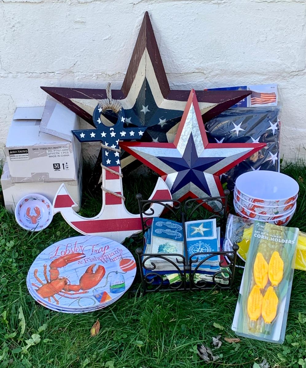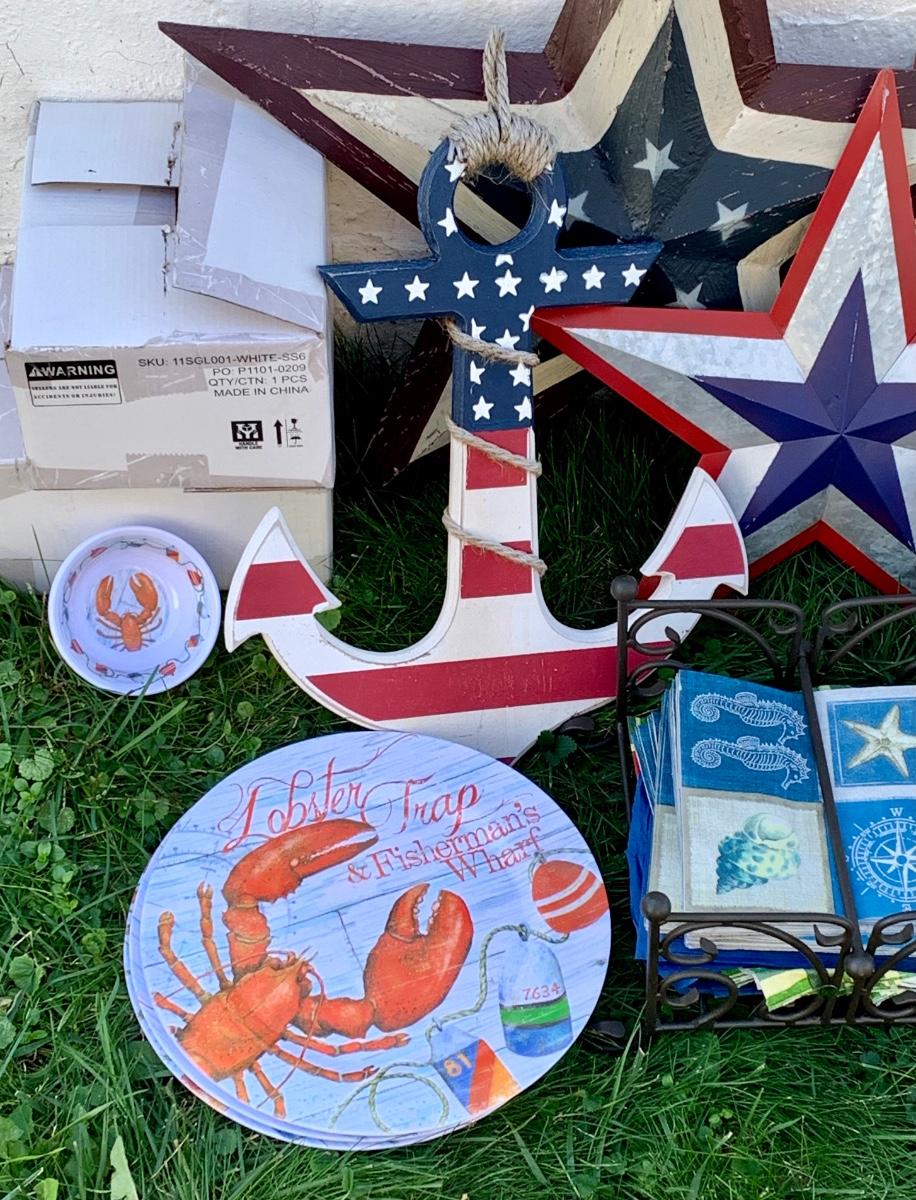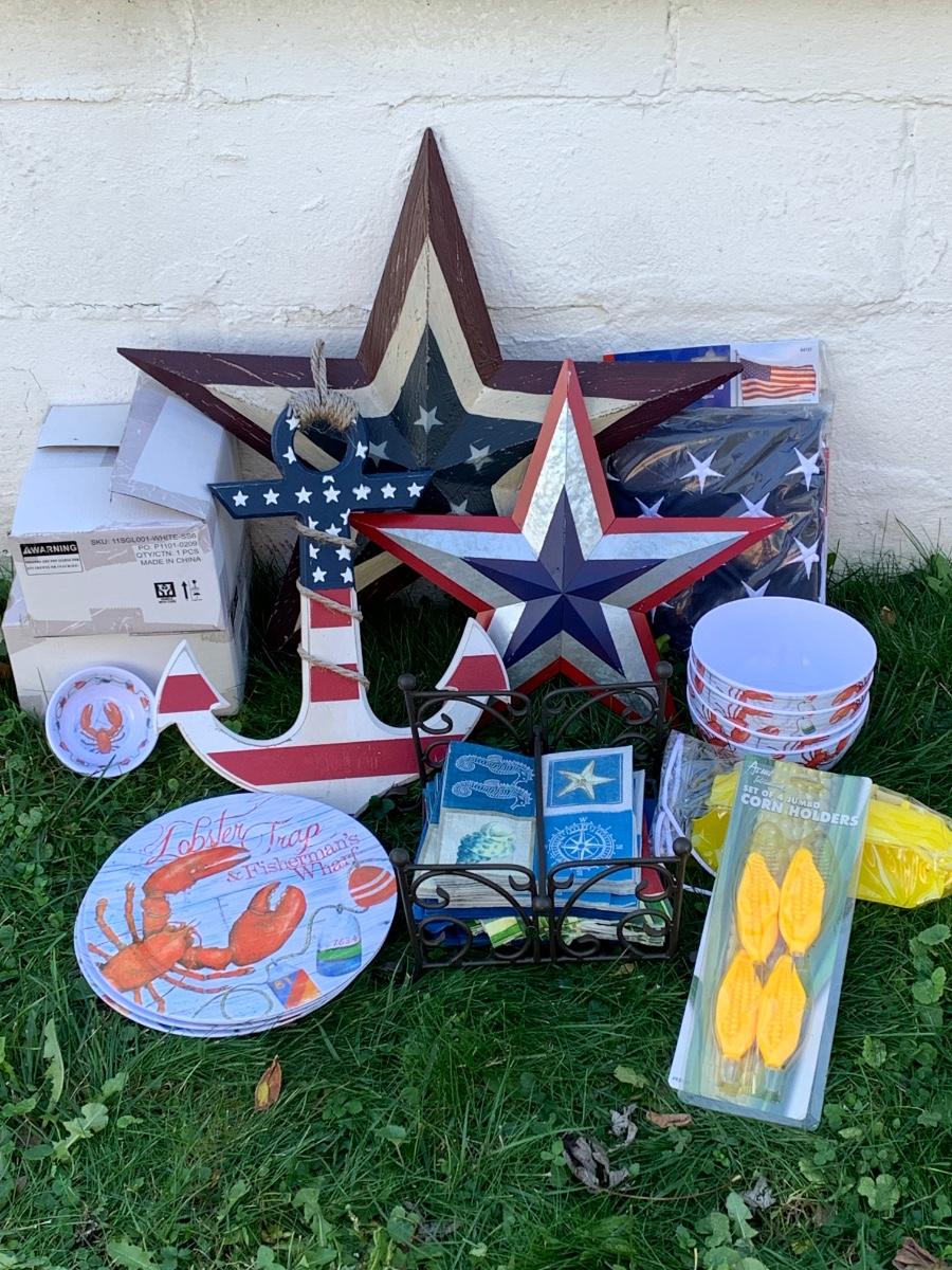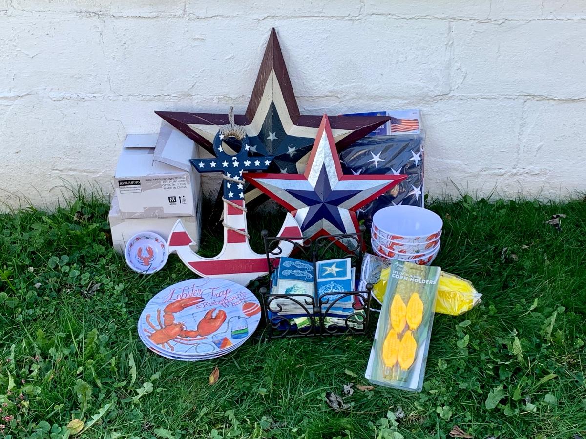 LOT 61R: Patriotic Decor, Flags, Solar Walkway Lights, Lobster Plates & More