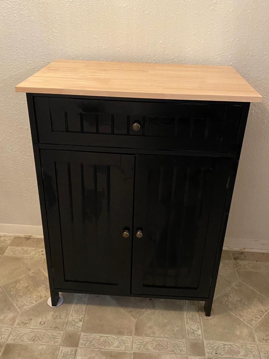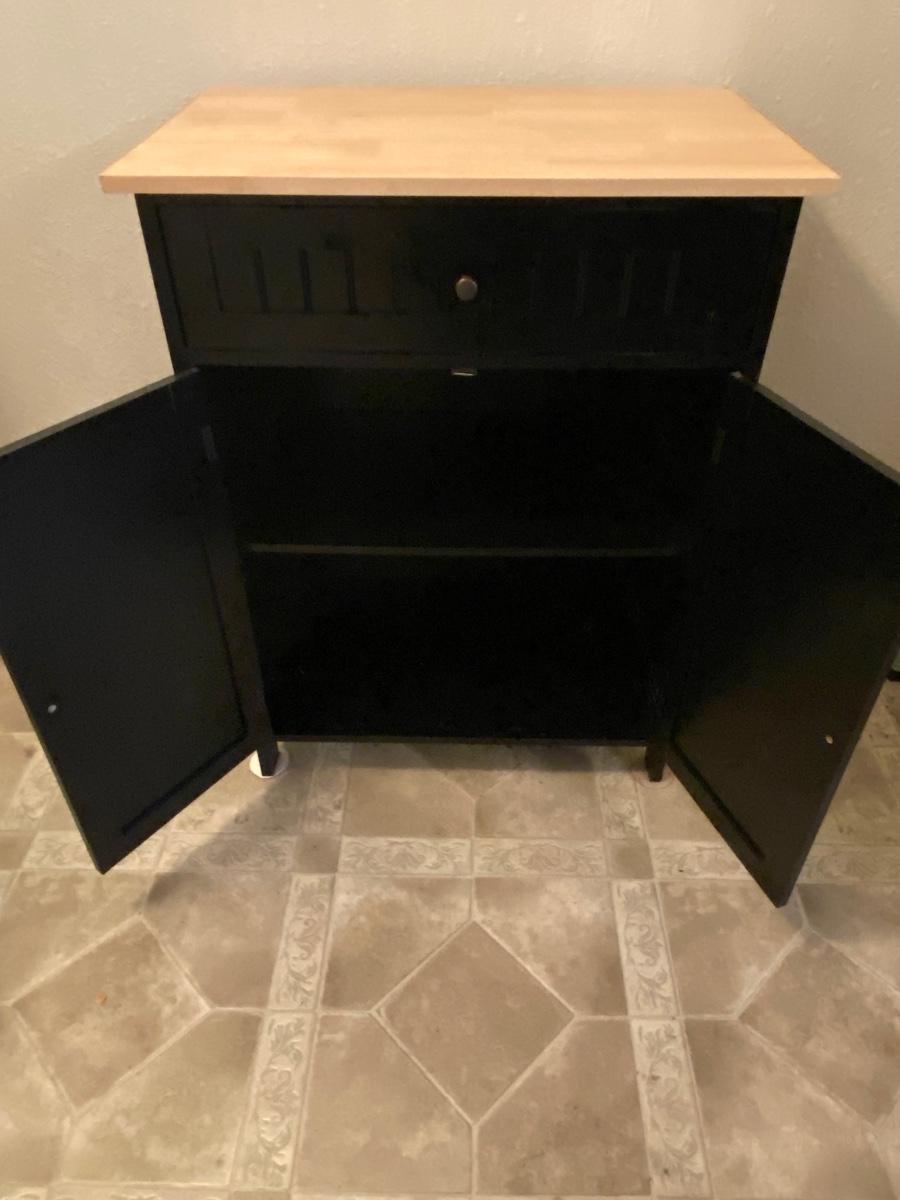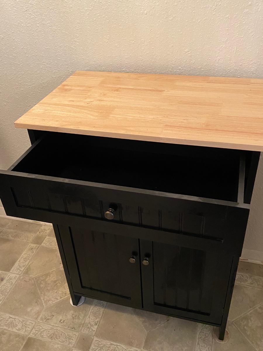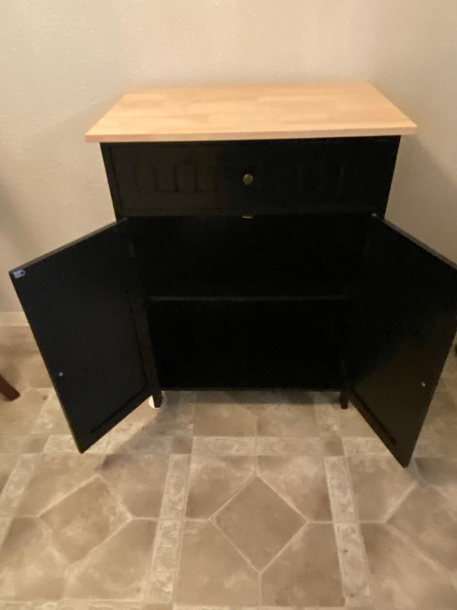 Black microwave/ Kitchen cart. Cart has drawer and two door cabinet. 27”17”x 35”. Please see all pictures as they are the best representation of the items. The pictures show condition, measurements if taken, and what is included in the lot. Due to the large amount that we photograph and the time frame, we are not always able to take measurements. All items unless noted, are pre-owned and have been used. If you purchased furniture, you must bring help. We do not allow one person to carry large furniture out on their own. Bring help, tools and a truck for the safety of our client’s homes, and your personal safety. Any damages that result to the property including walls, and floors due to moving of the furniture will be charged to the buyer. Company policy. Thank you.
