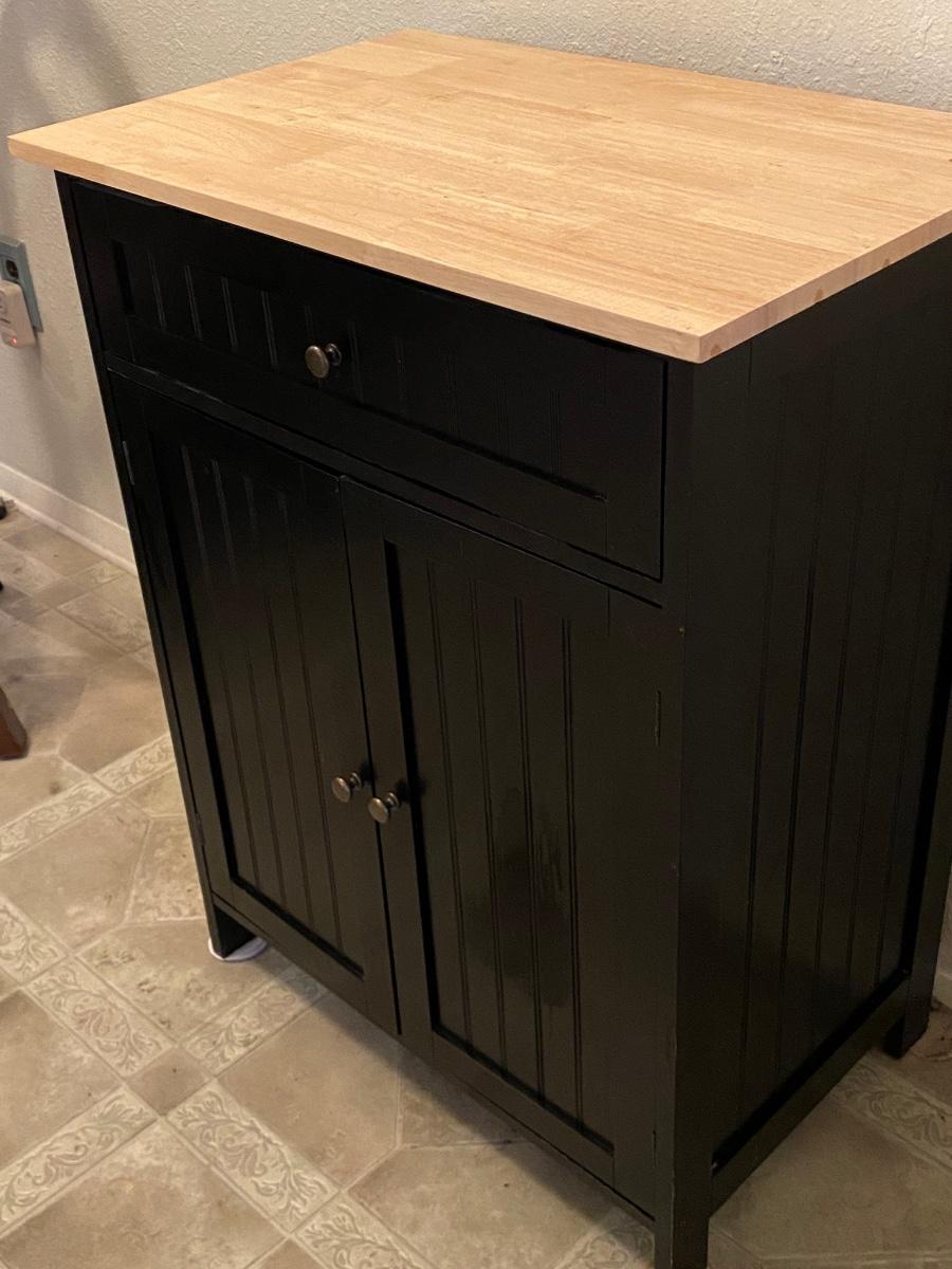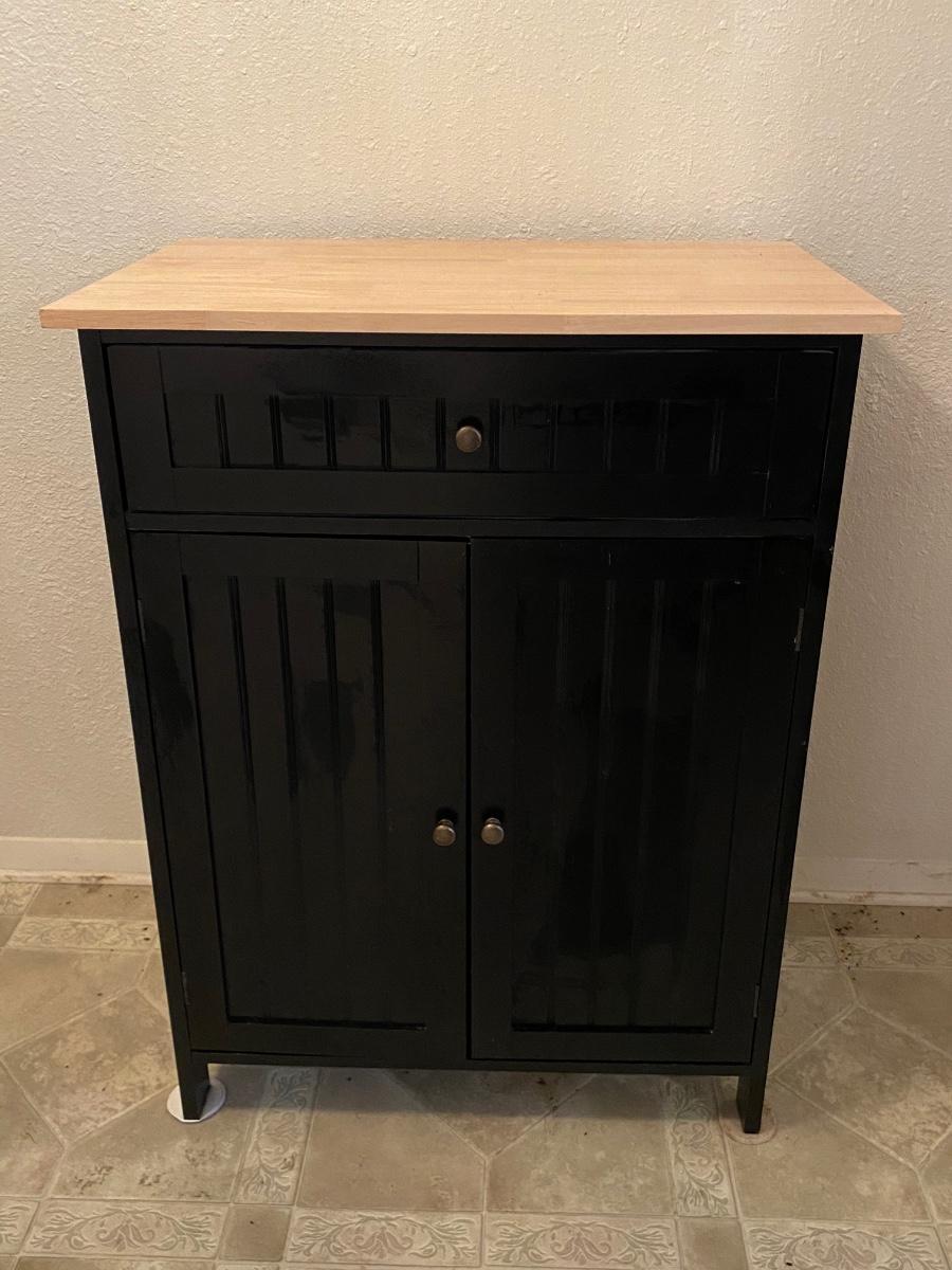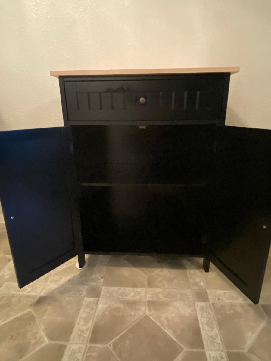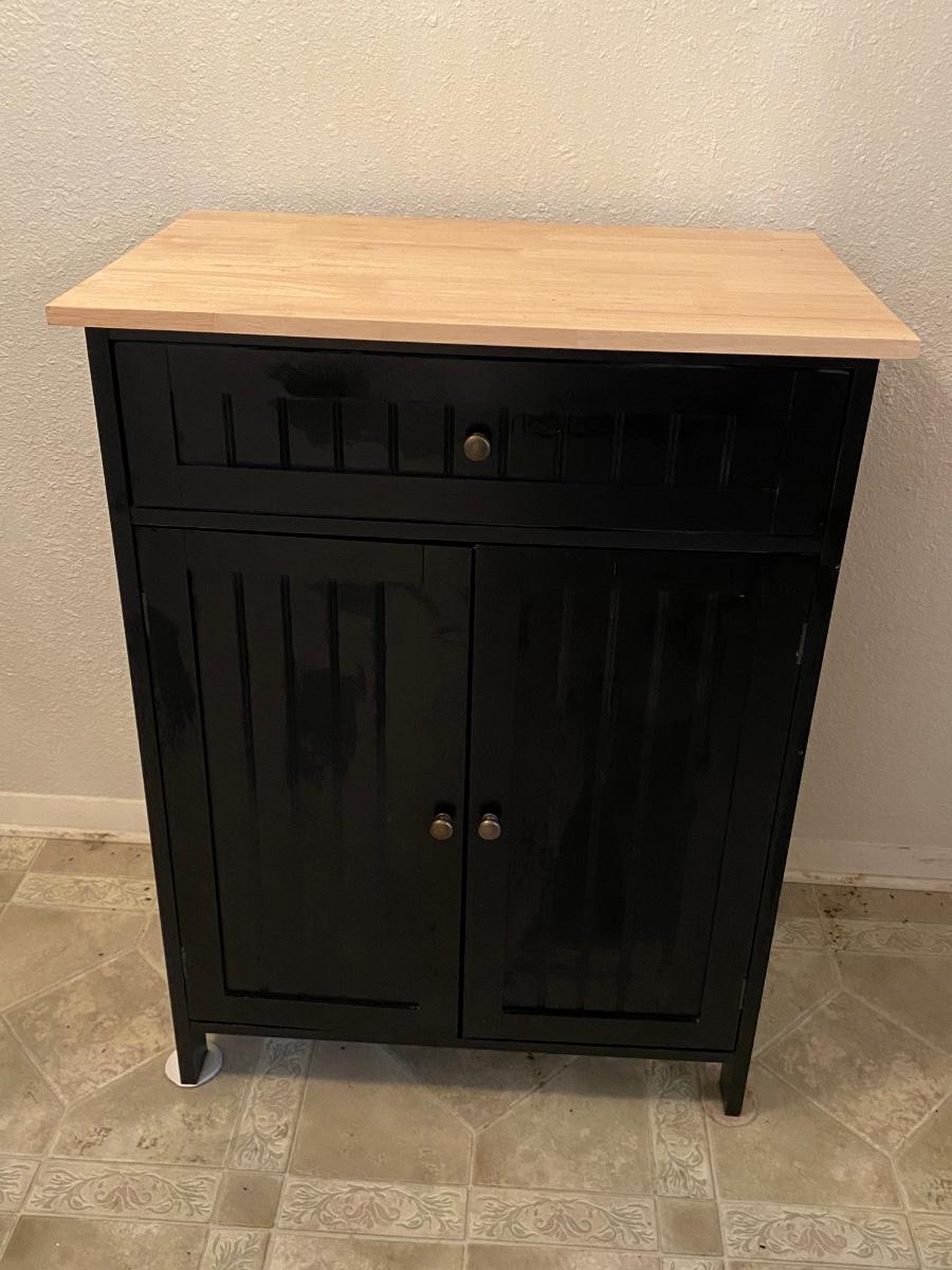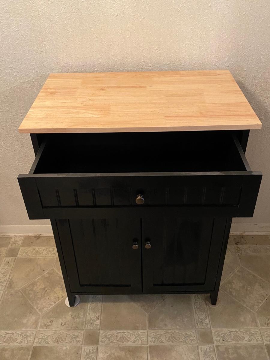 Black microwave/ Kitchen cart. Cart has drawer and two door cabinet. 27”17”x 35”. Please see all pictures as they are the best representation of the items. The pictures show condition, measurements if taken, and what is included in the lot. Due to the large amount that we photograph and the time frame, we are not always able to take measurements. All items unless noted, are pre-owned and have been used. If you purchased furniture, you must bring help. We do not allow one person to carry large furniture out on their own. Bring help, tools and a truck for the safety of our client’s homes, and your personal safety. Any damages that result to the property including walls, and floors due to moving of the furniture will be charged to the buyer. Company policy. Thank you.