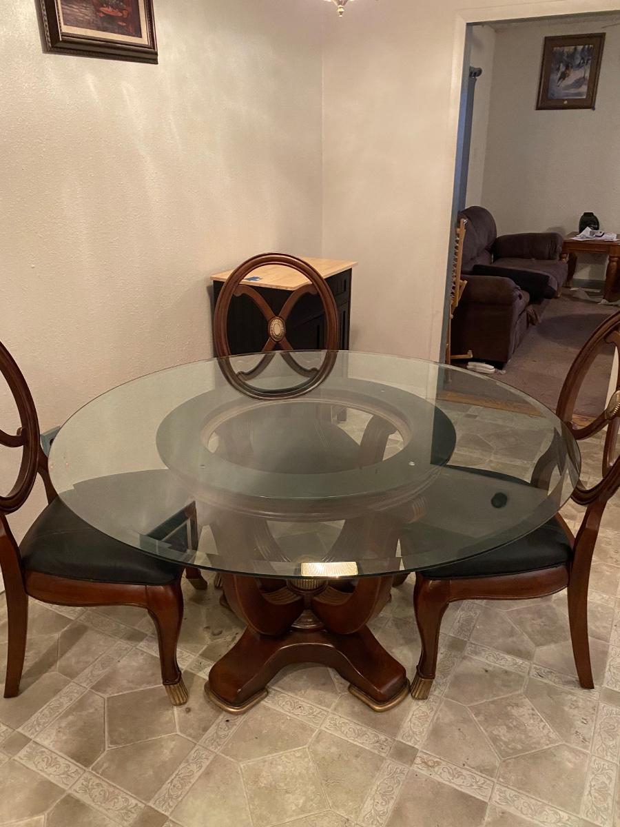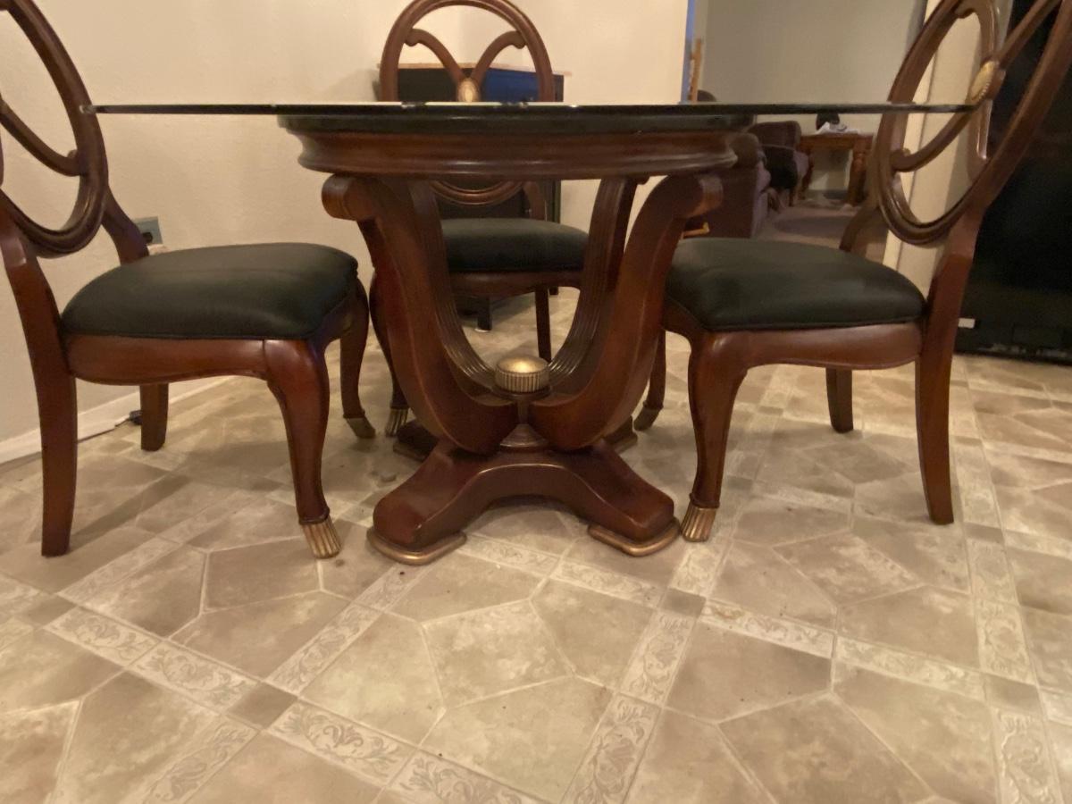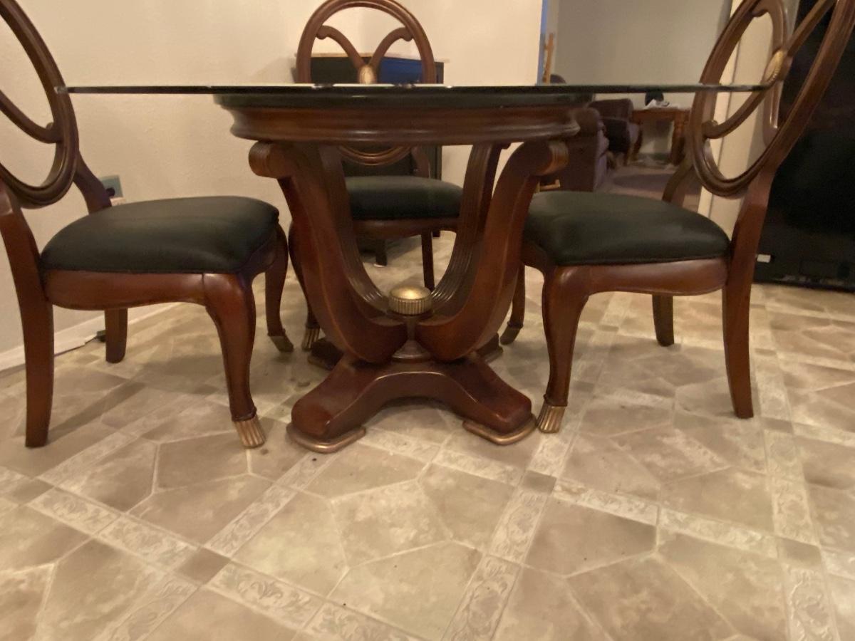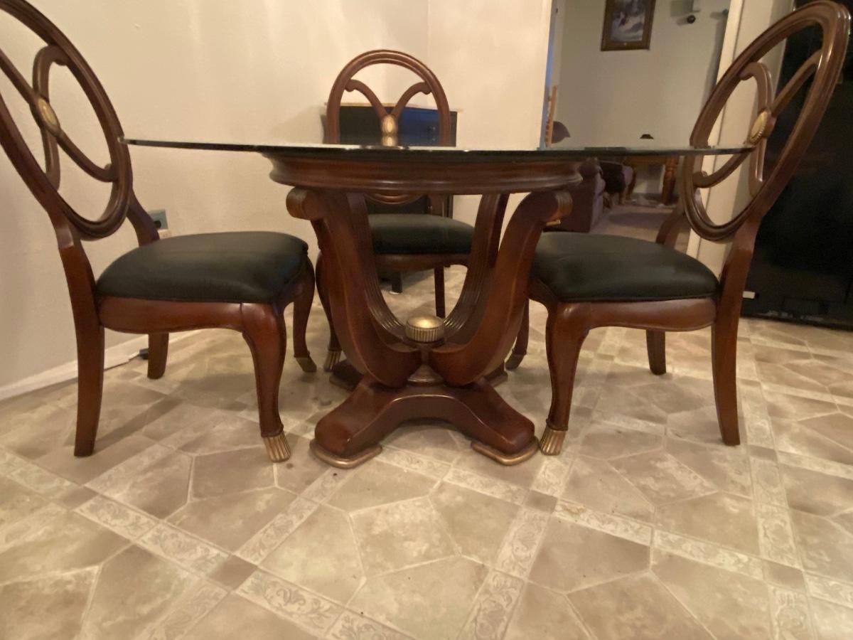 Table Goldtone trim and glass table top. Four matching chairs have leather seat and Goldtone feet. Table measures 54” in diameter and 30” High. Table is in good used condition. Please see all pictures as they are the best representation of the items. The pictures show condition, measurements if taken, and what is included in the lot. Due to the large amount that we photograph and the time frame, we are not always able to take measurements. All items unless noted, are pre-owned and have been used. If you purchased furniture, you must bring help. We do not allow one person to carry large furniture out on their own. Bring help, tools and a truck for the safety of our client’s homes, and your personal safety. Any damages that result to the property including walls, and floors due to moving of the furniture will be charged to the buyer. Company policy. Thank you.