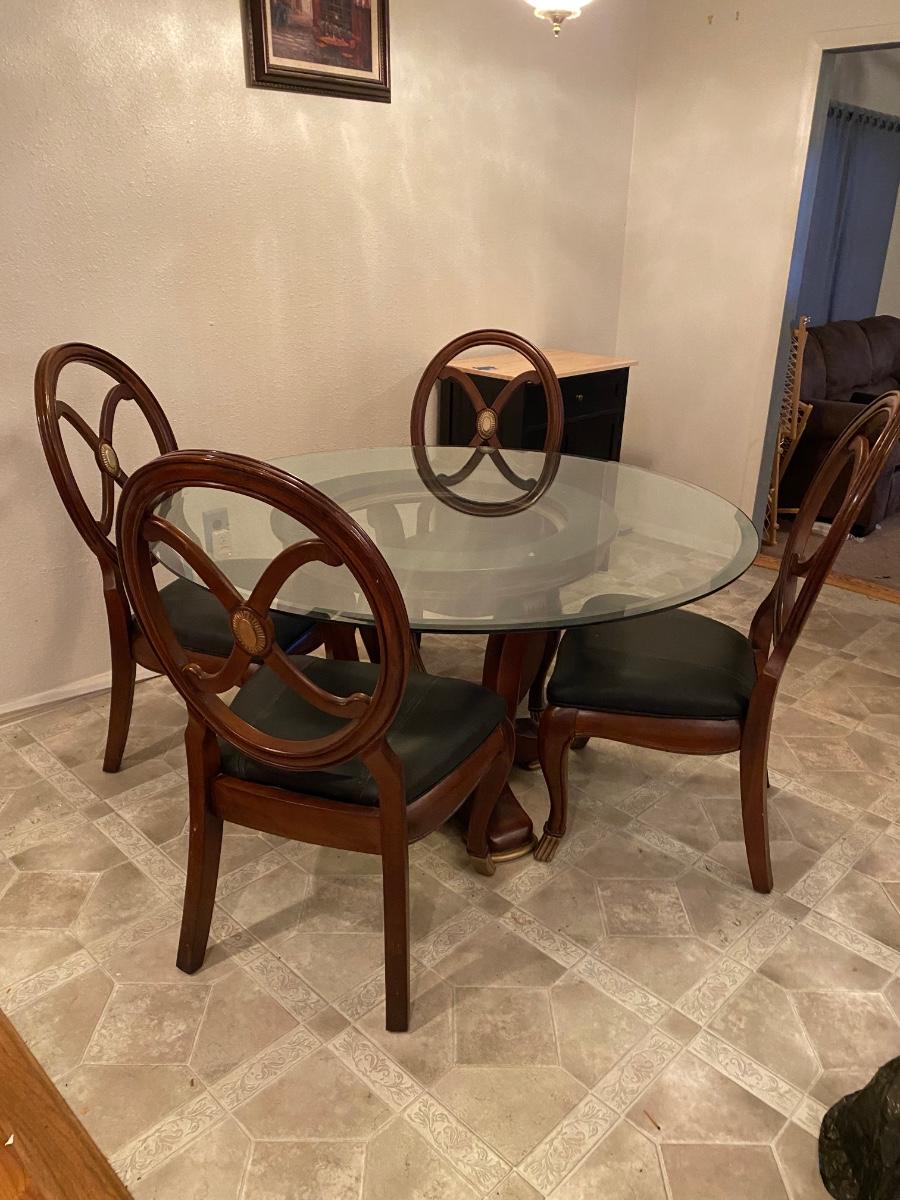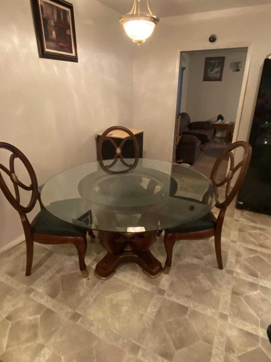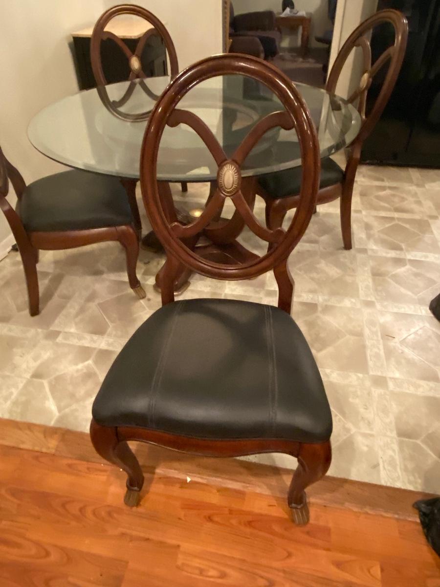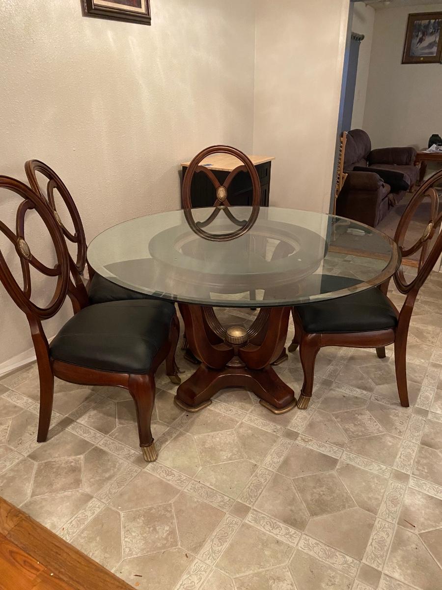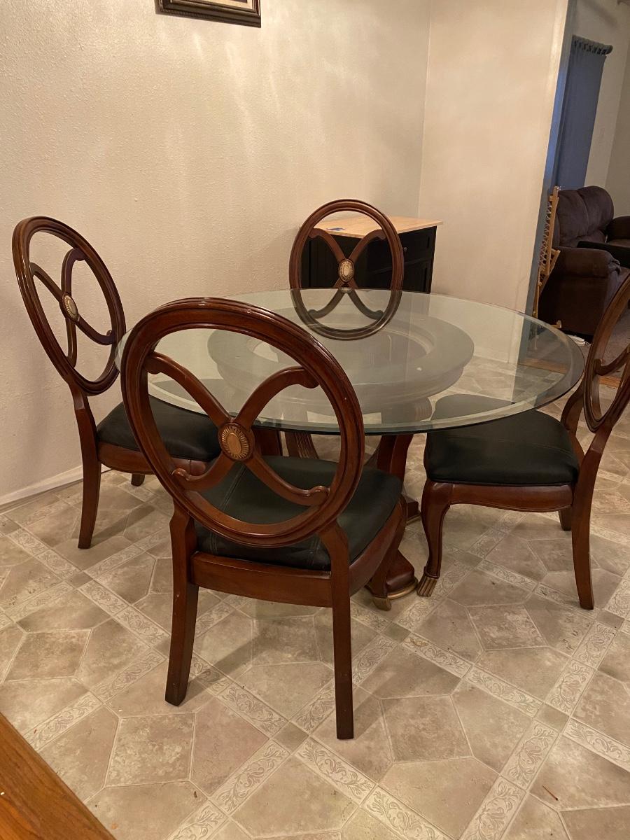 Table Goldtone trim and glass table top. Four matching chairs have leather seat and Goldtone feet. Table measures 54” in diameter and 30” High. Table is in good used condition. Please see all pictures as they are the best representation of the items. The pictures show condition, measurements if taken, and what is included in the lot. Due to the large amount that we photograph and the time frame, we are not always able to take measurements. All items unless noted, are pre-owned and have been used. If you purchased furniture, you must bring help. We do not allow one person to carry large furniture out on their own. Bring help, tools and a truck for the safety of our client’s homes, and your personal safety. Any damages that result to the property including walls, and floors due to moving of the furniture will be charged to the buyer. Company policy. Thank you.
