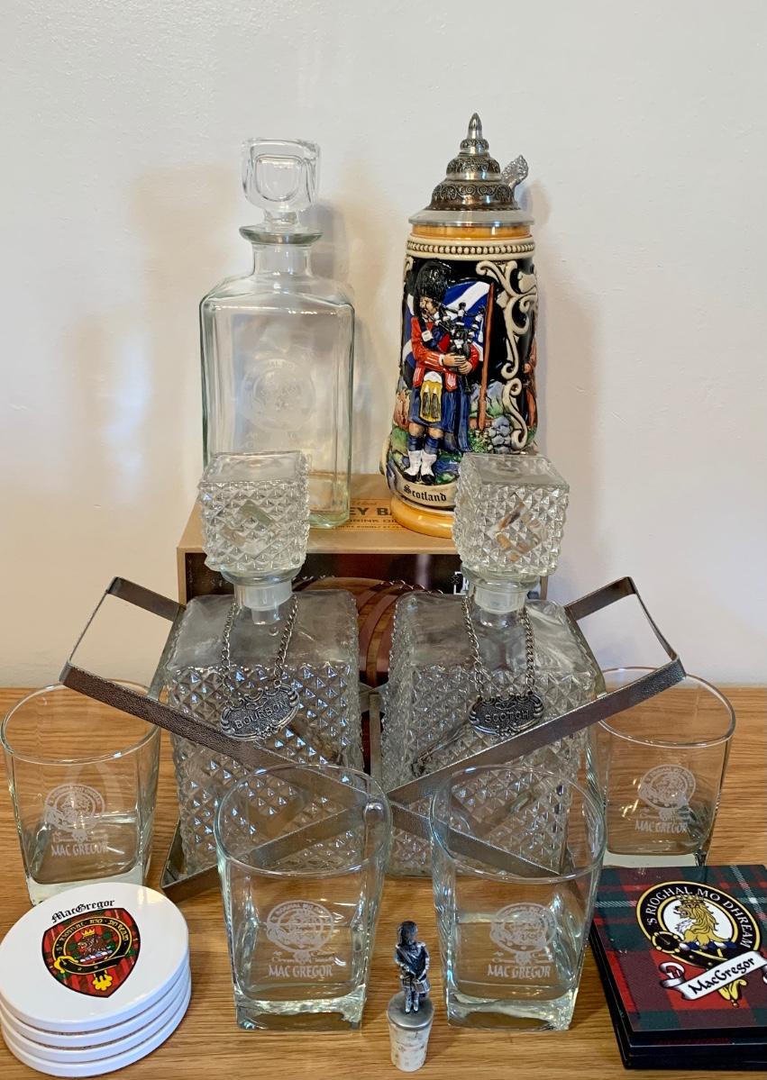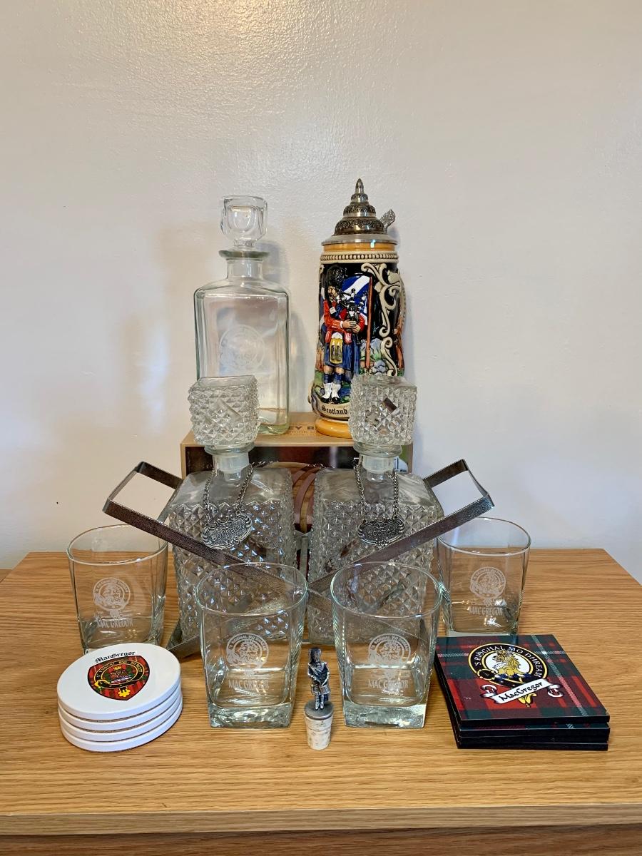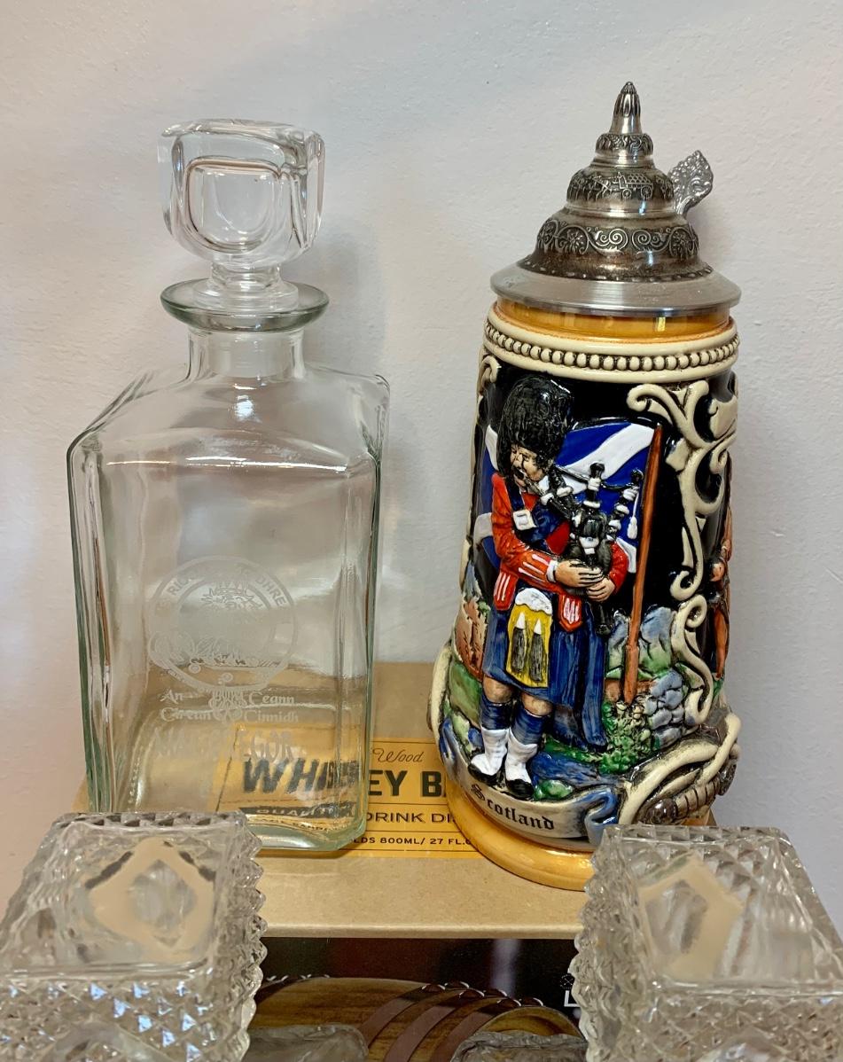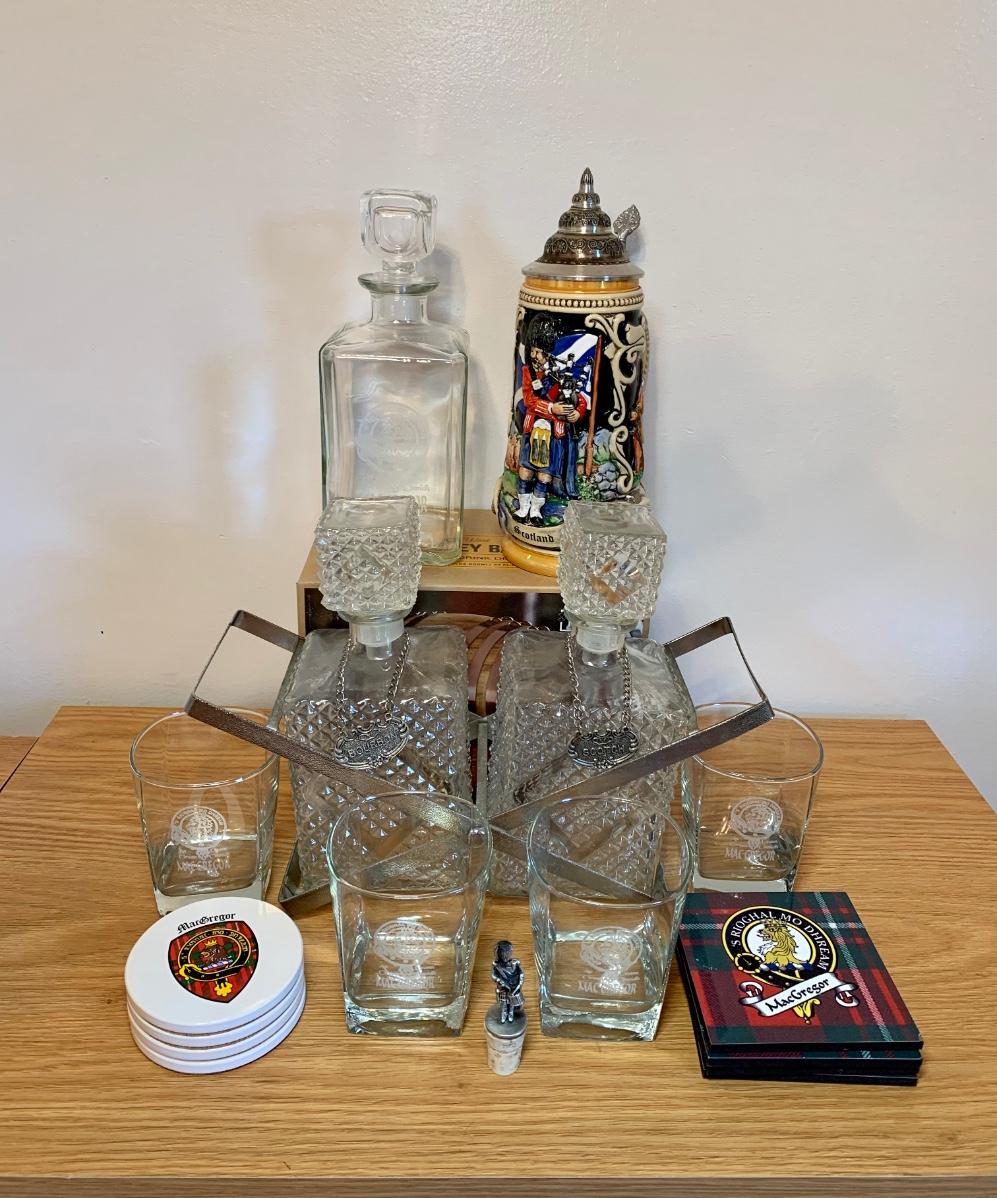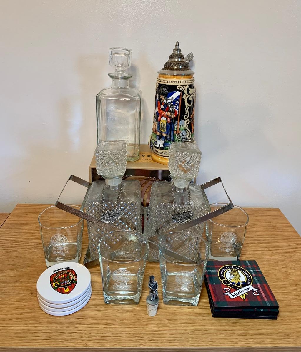 LOT 86: Barware Collection: MacGregor Coasters, MacGregor Decanter, Scotland Stein, New in Box Whiskey Barrel Dispenser & More