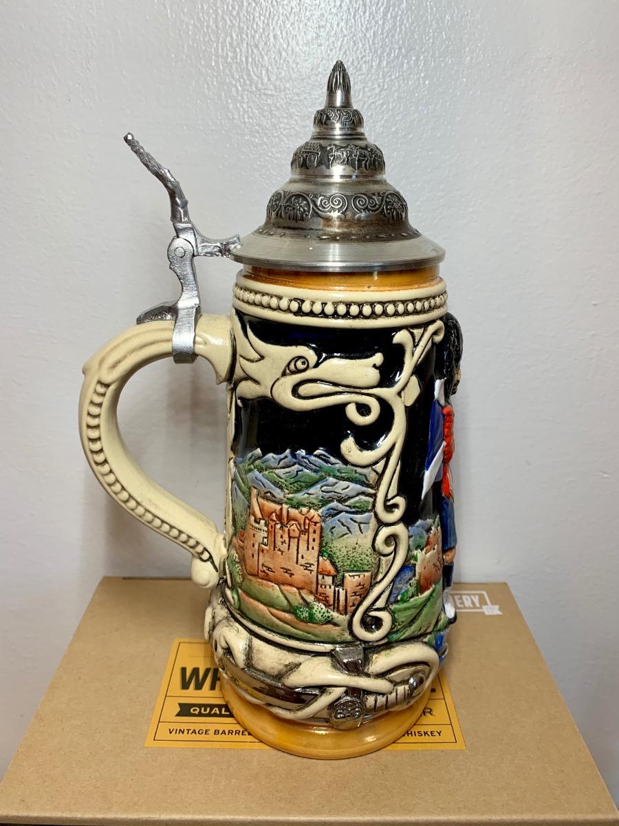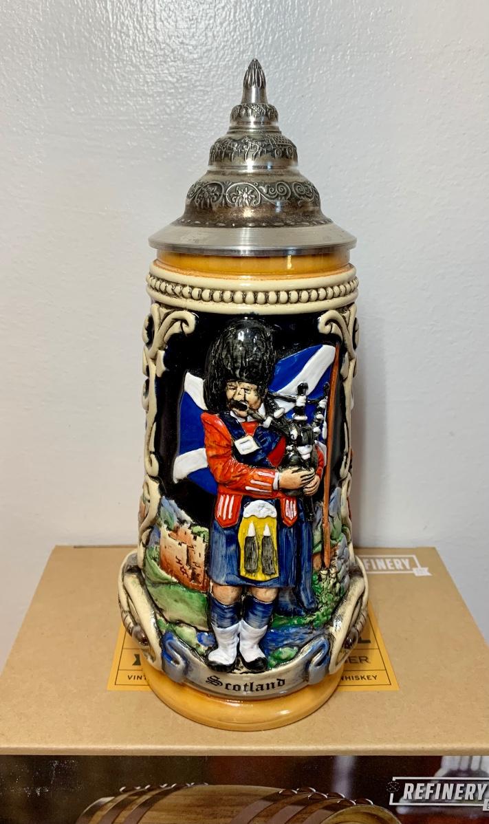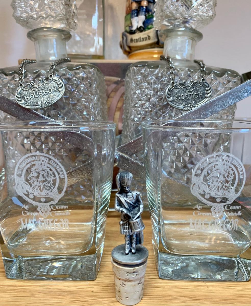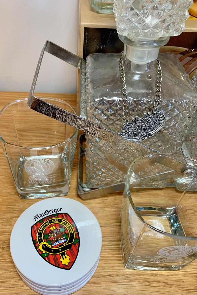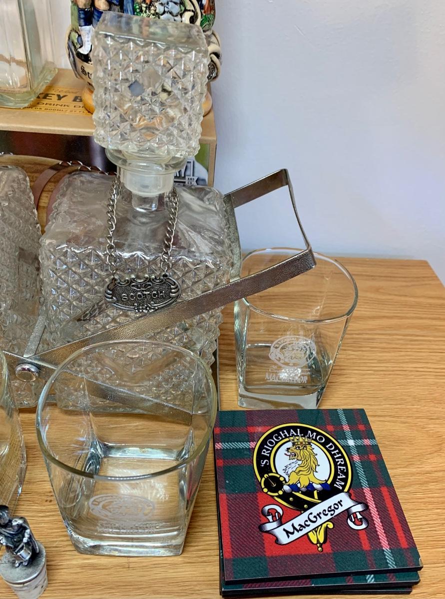 LOT 86: Barware Collection: MacGregor Coasters, MacGregor Decanter, Scotland Stein, New in Box Whiskey Barrel Dispenser & More
