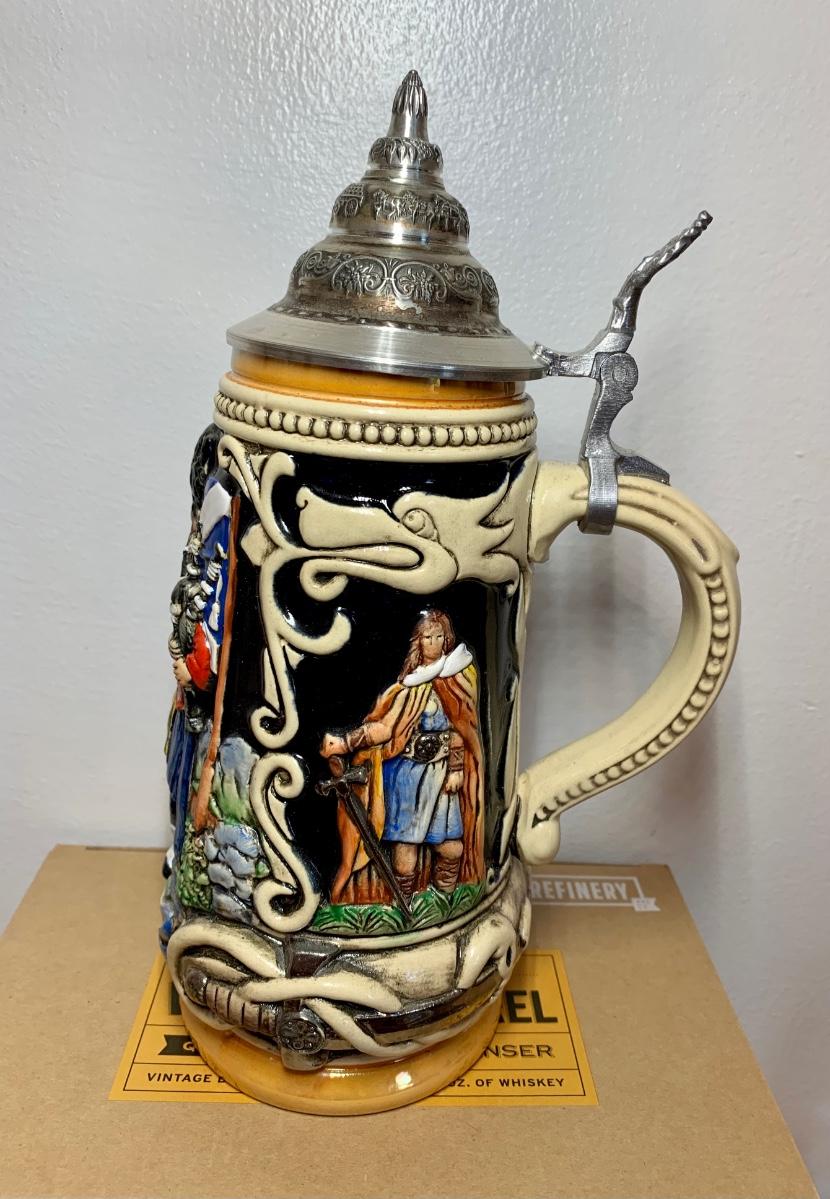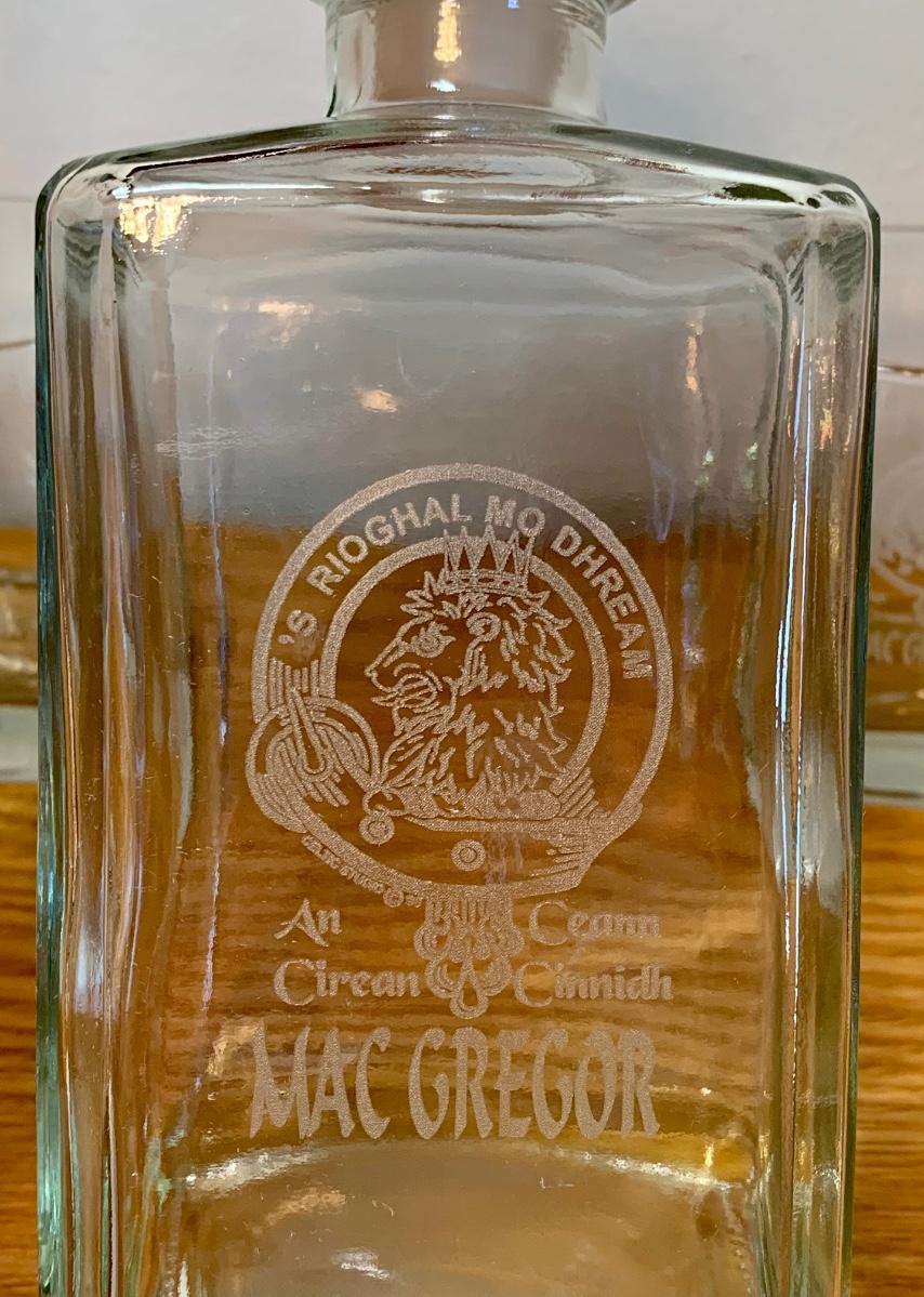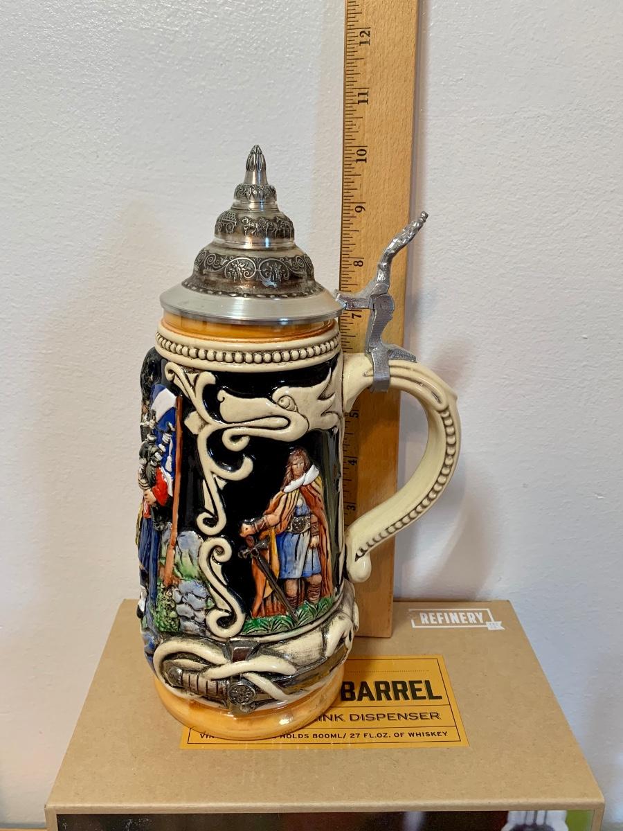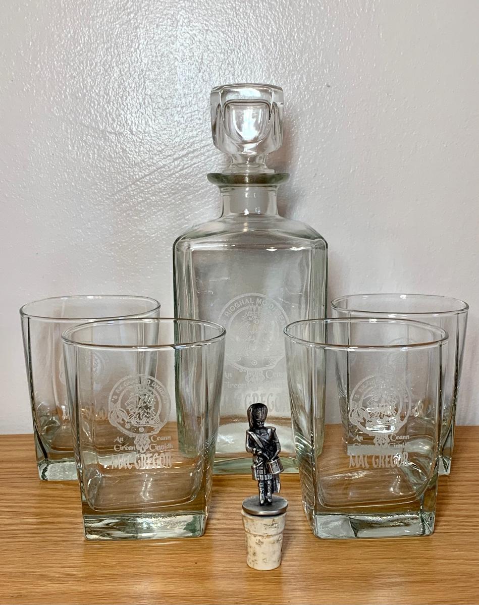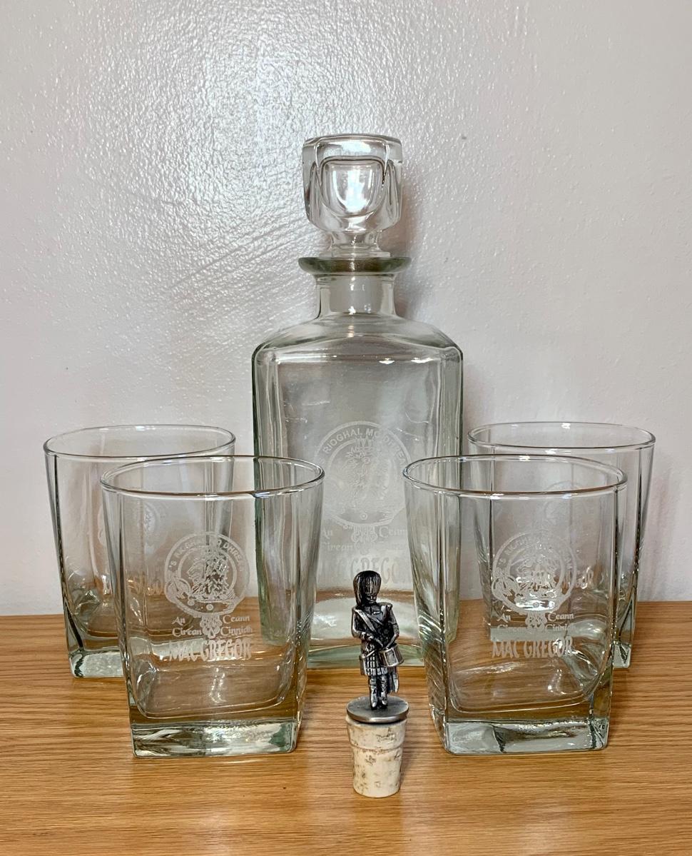 LOT 86: Barware Collection: MacGregor Coasters, MacGregor Decanter, Scotland Stein, New in Box Whiskey Barrel Dispenser & More