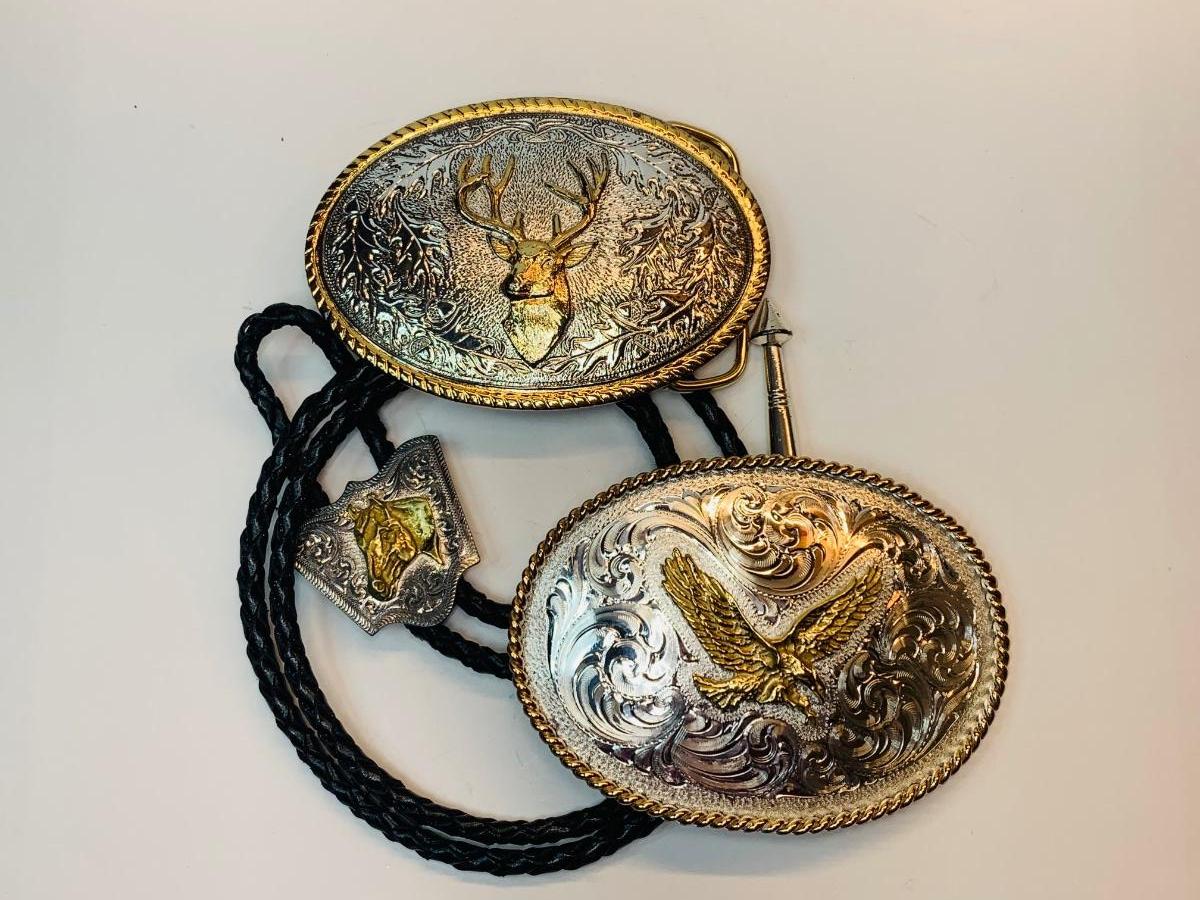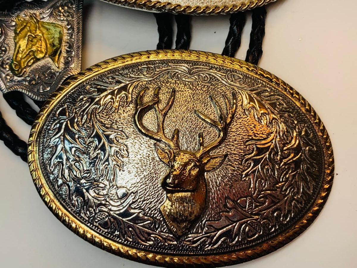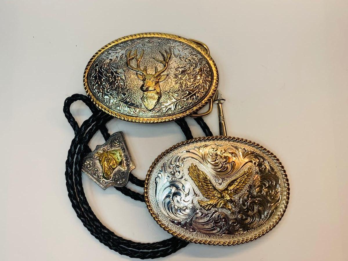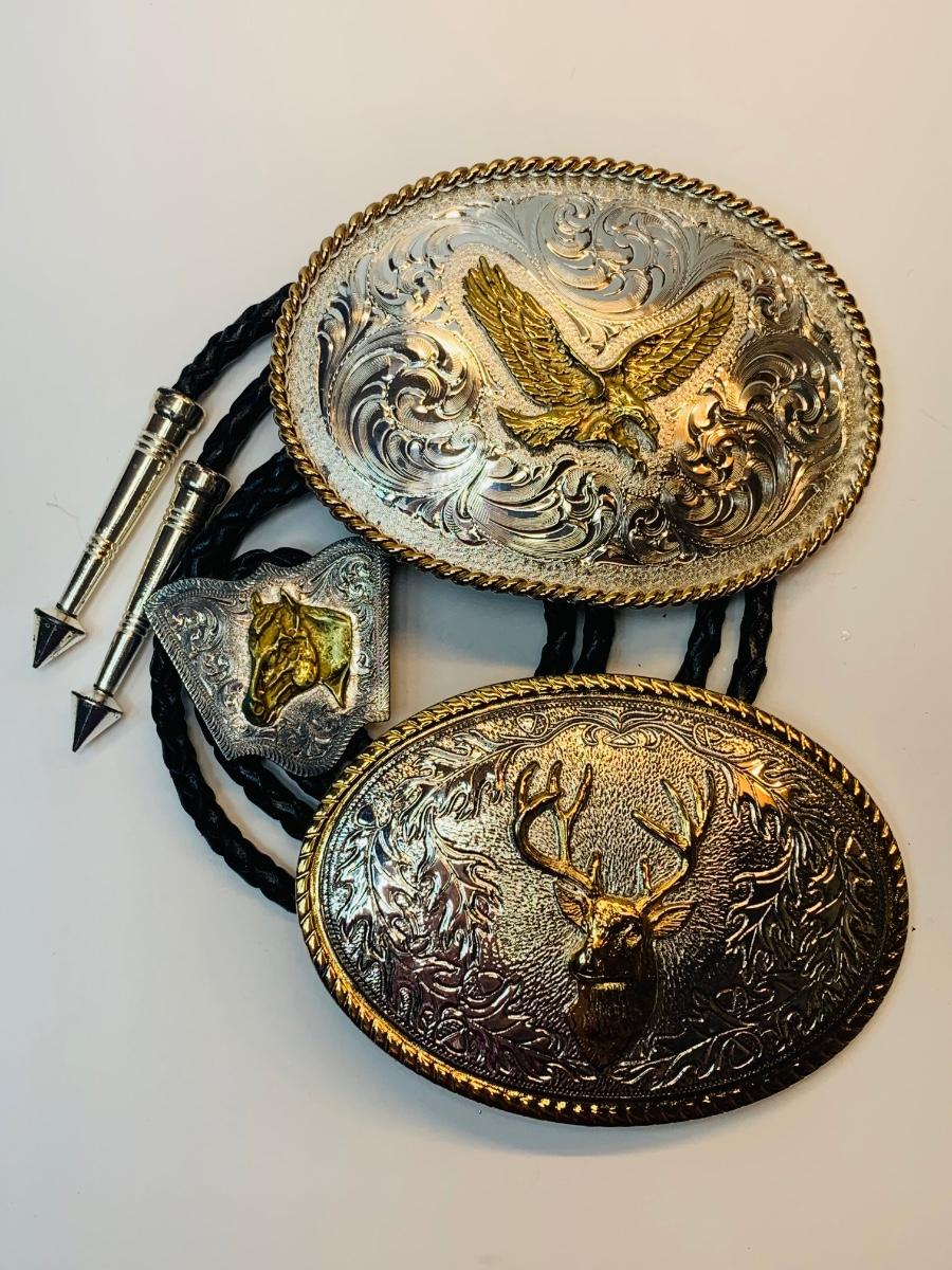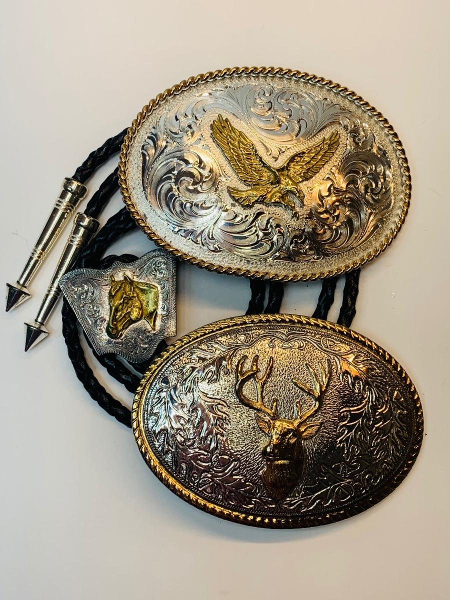 LOT 107: Horse Bolo Tie, Eagle & Deer Belt Buckles: Gold & Silver Plate