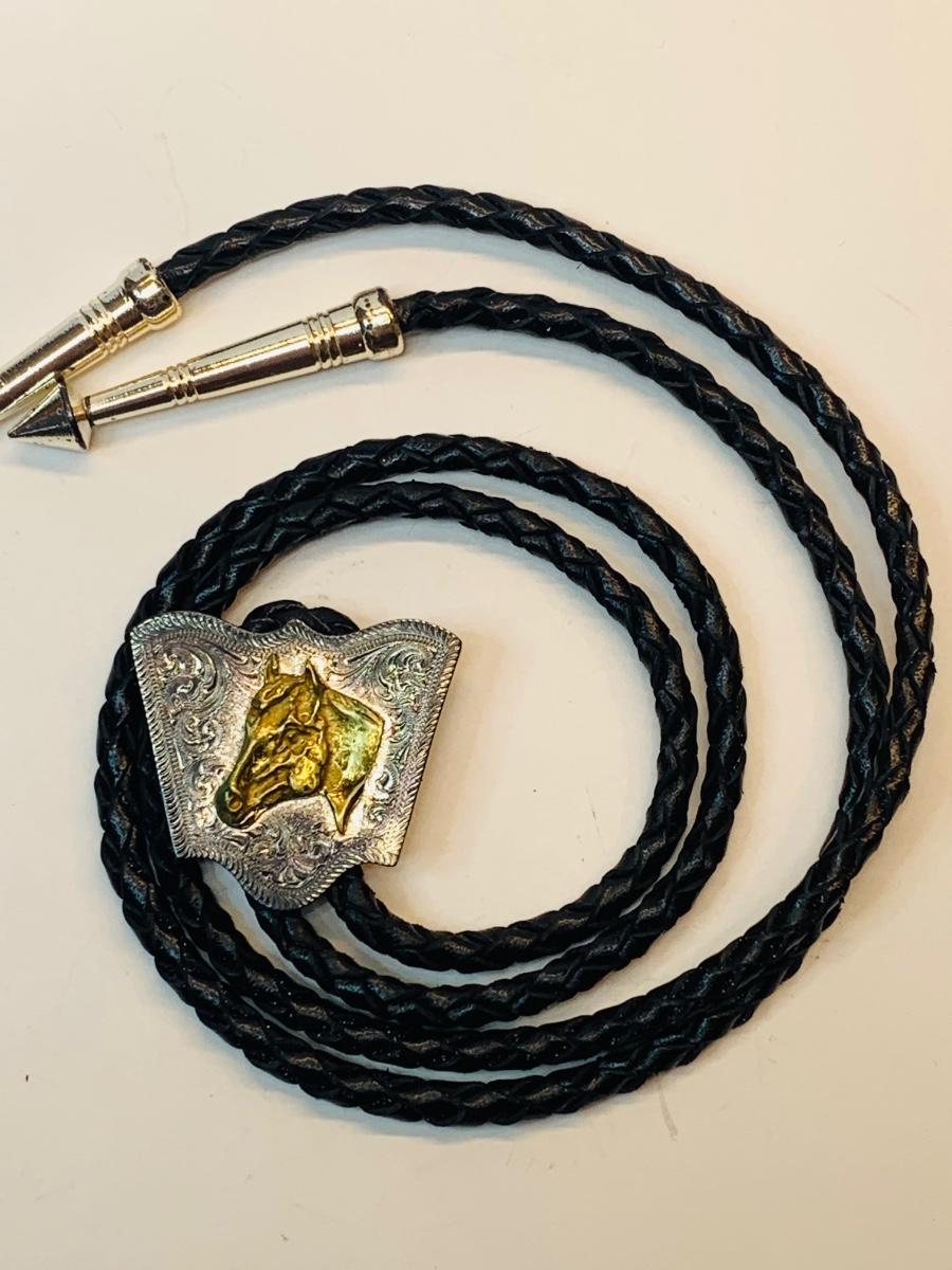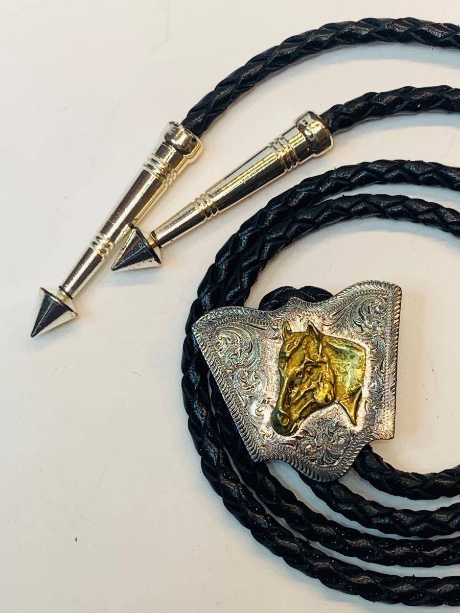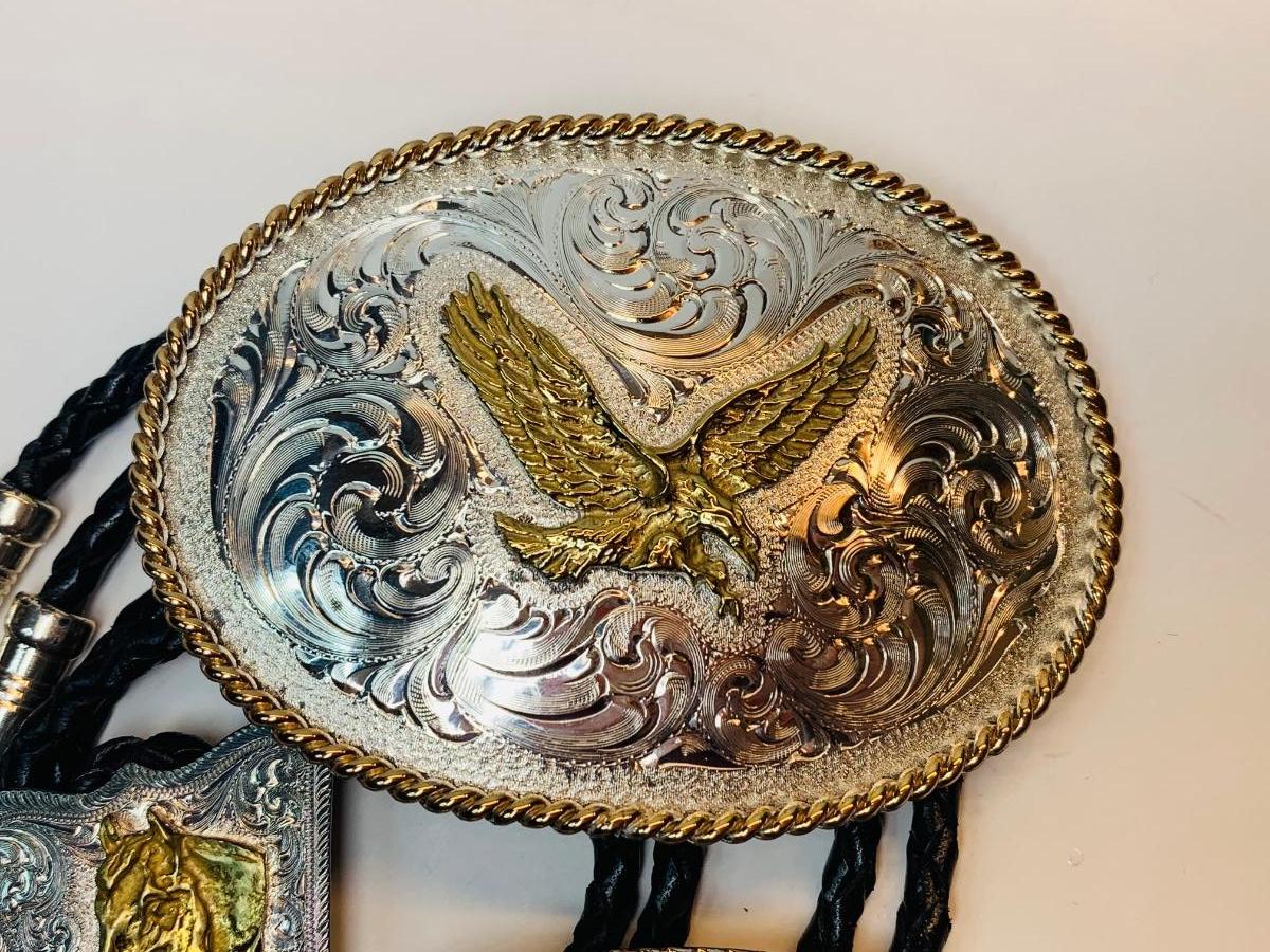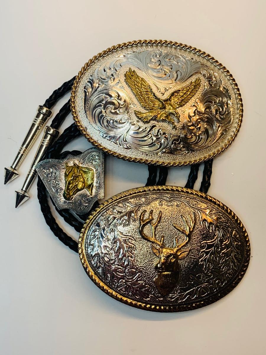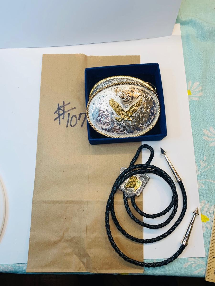 LOT 107: Horse Bolo Tie, Eagle & Deer Belt Buckles: Gold & Silver Plate