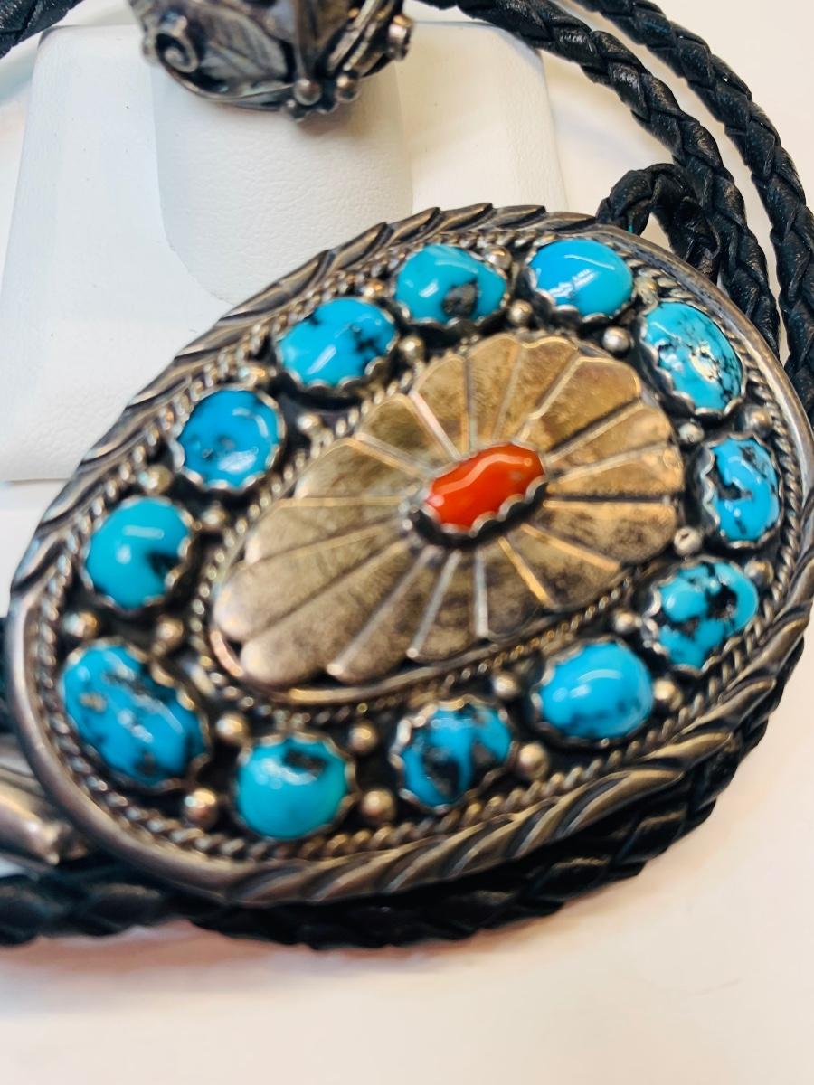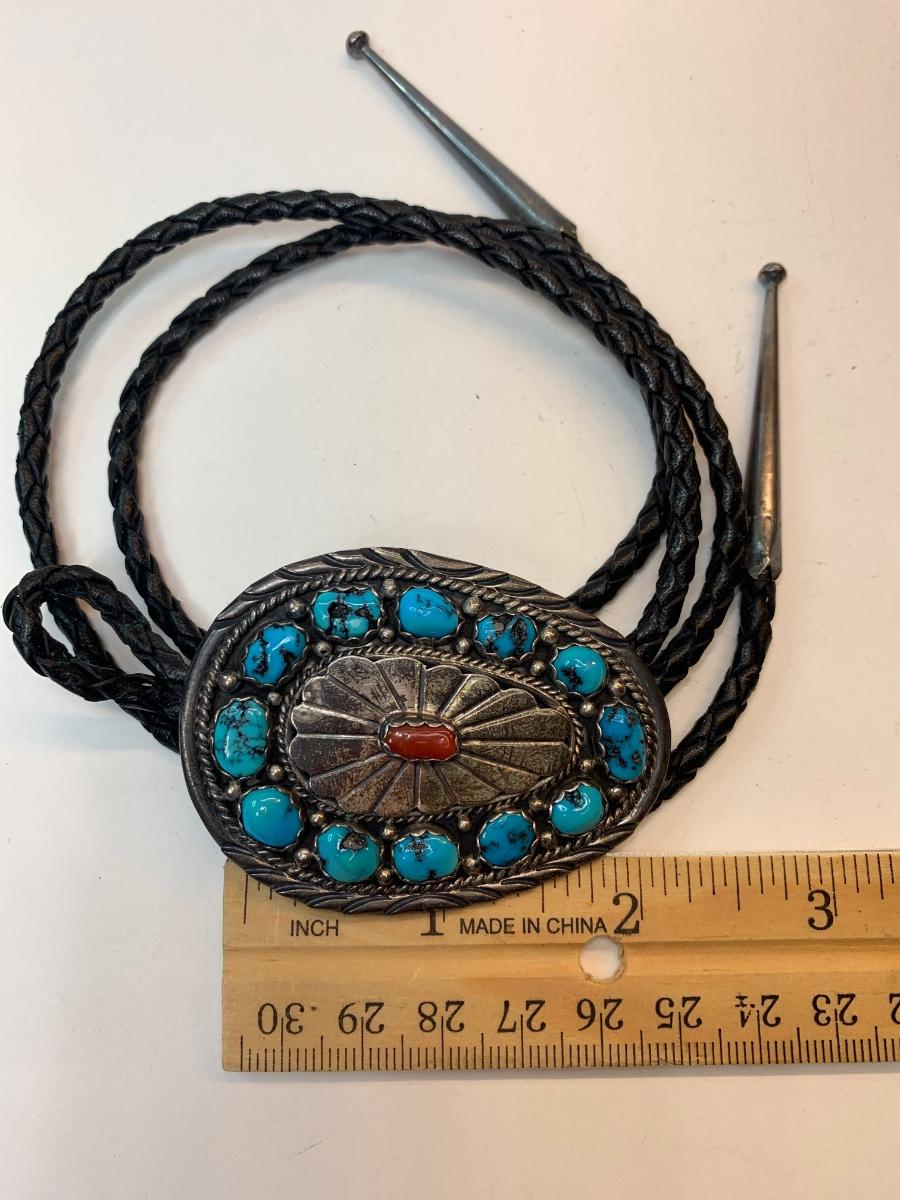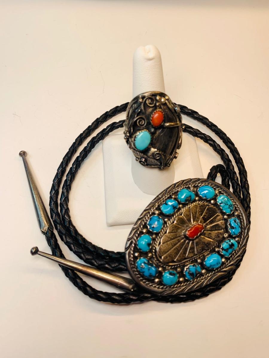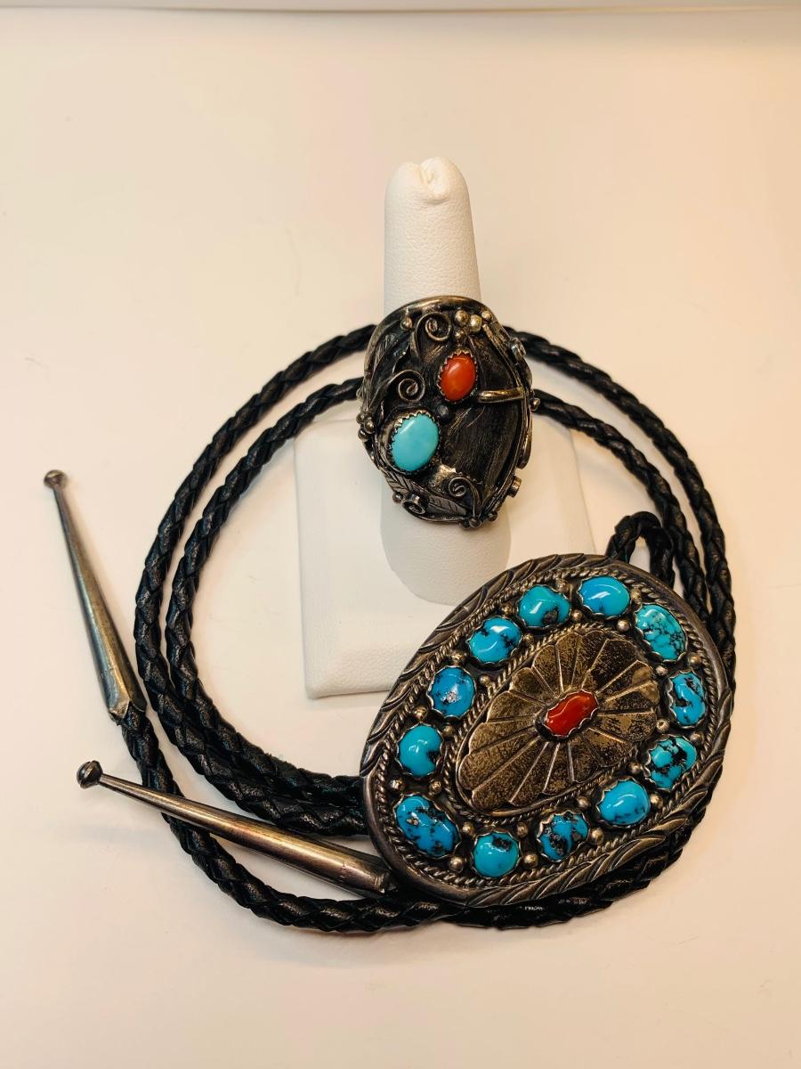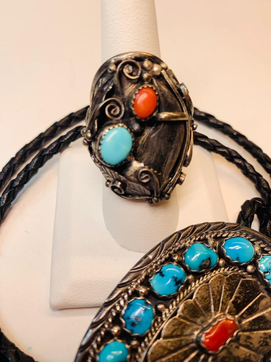 LOT 109: Sterling Silver & Turquoise Bolo Tie & Turquoise & Coral Ring, sz8 w/ring guard