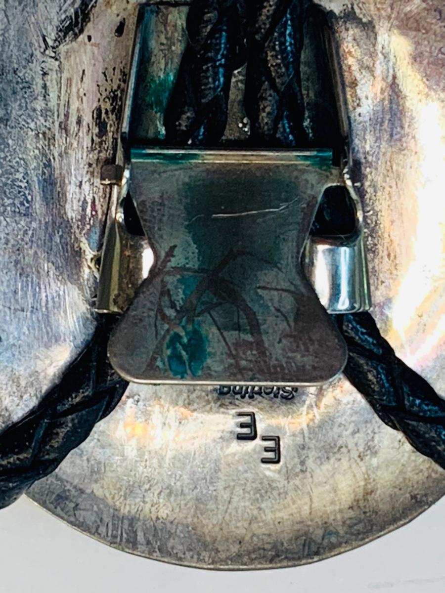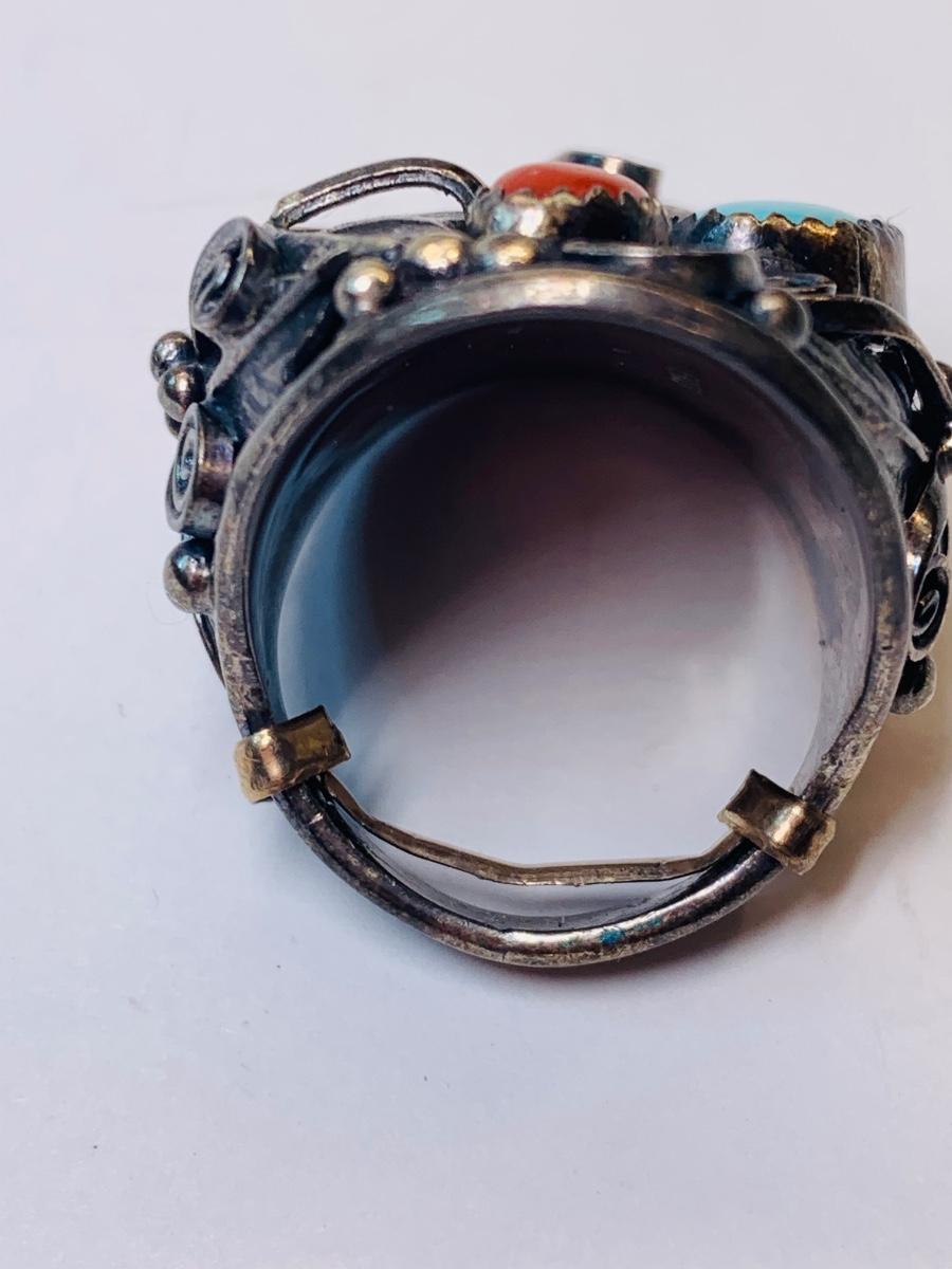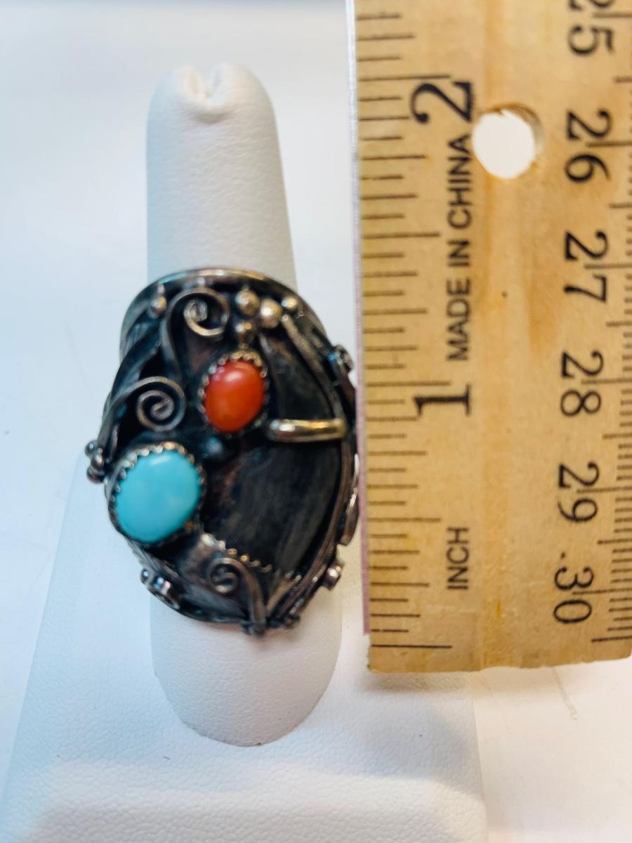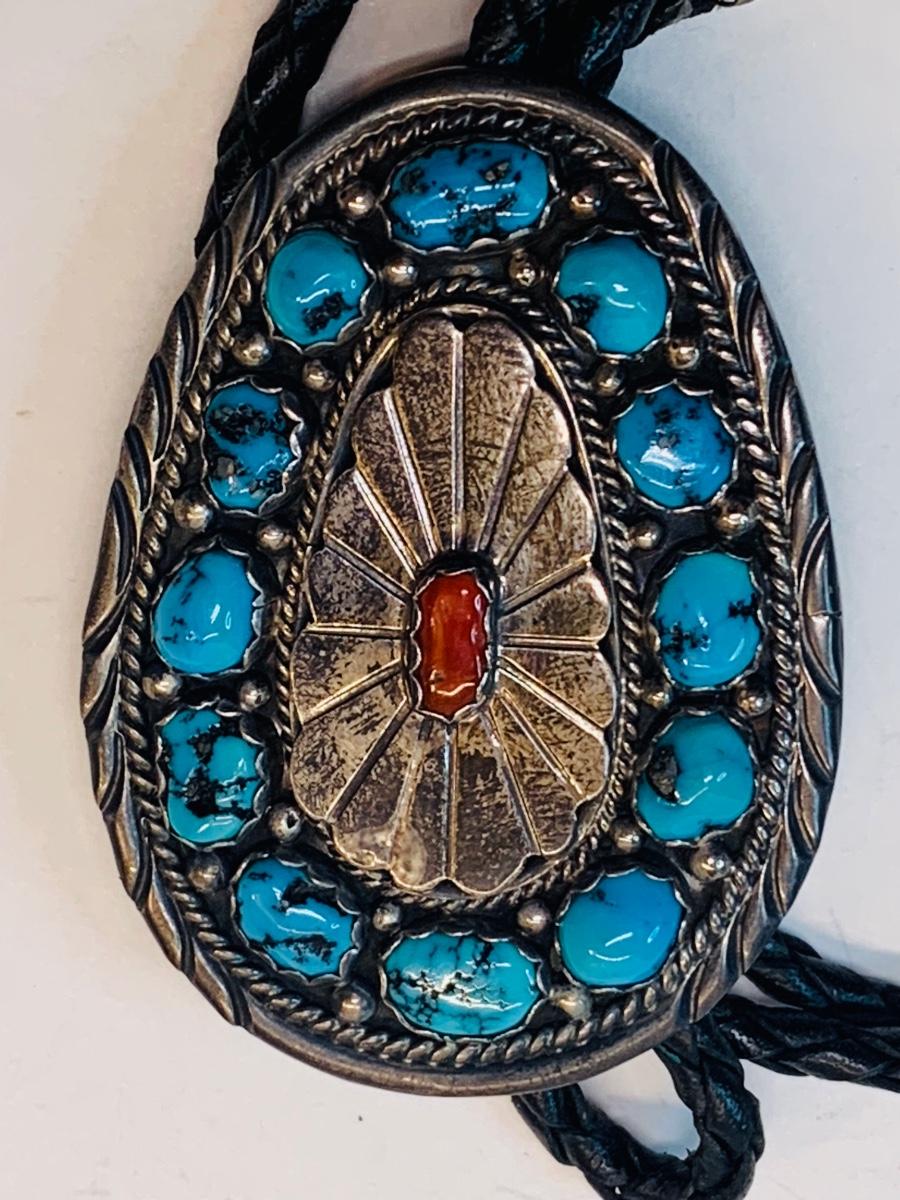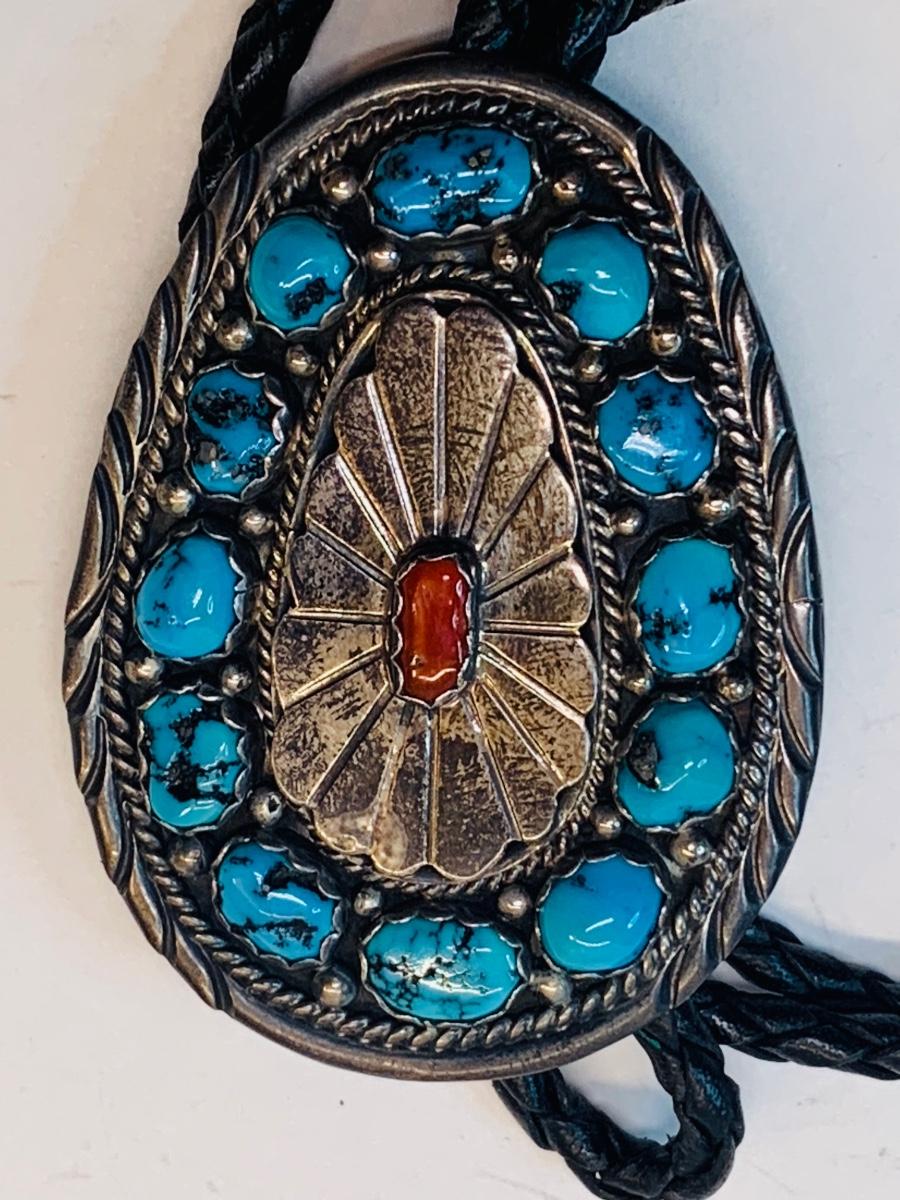 LOT 109: Sterling Silver & Turquoise Bolo Tie & Turquoise & Coral Ring, sz8 w/ring guard