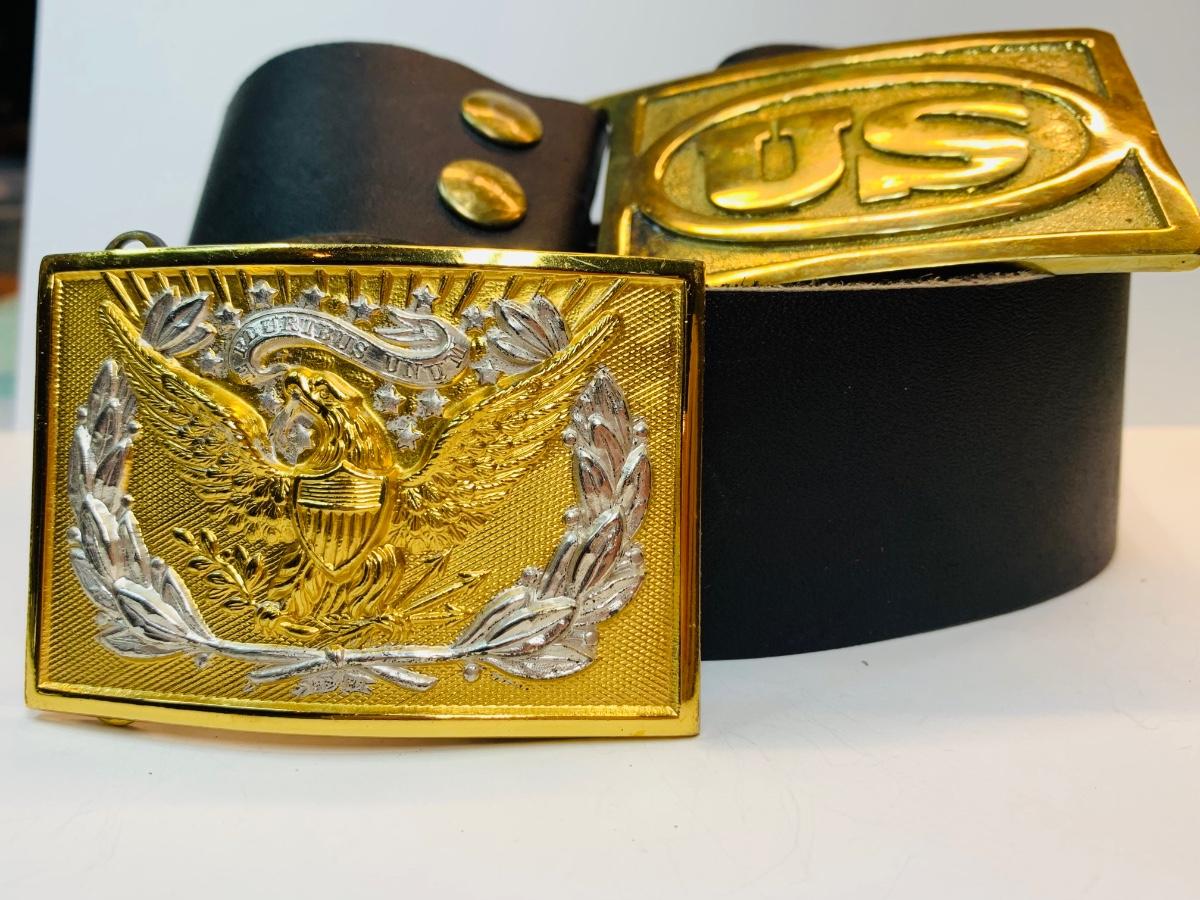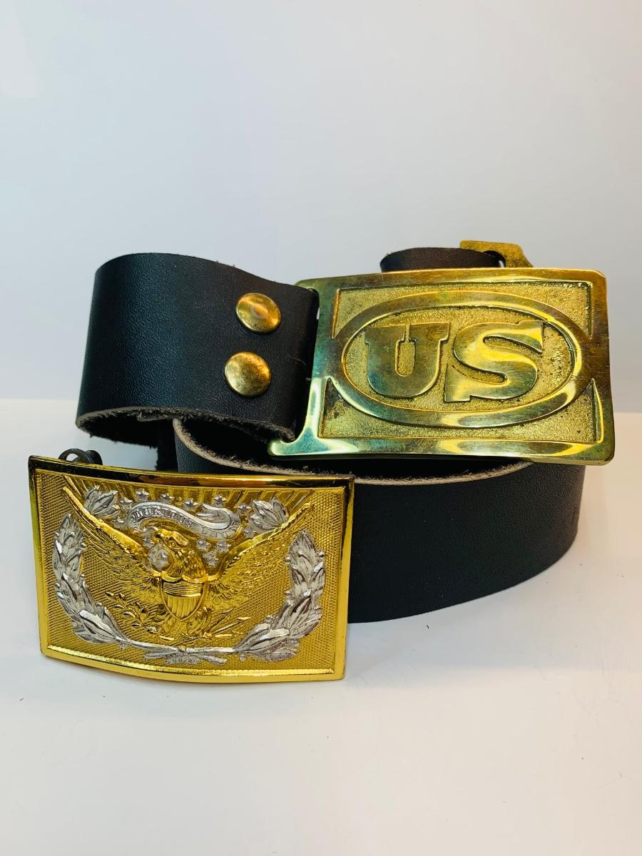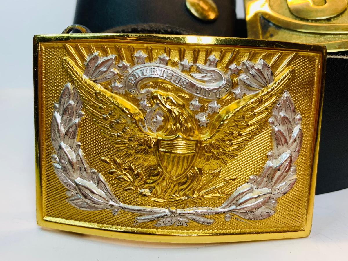 LOT 120: Belt w/Brass US Buckle & Eagle Belt Buckle