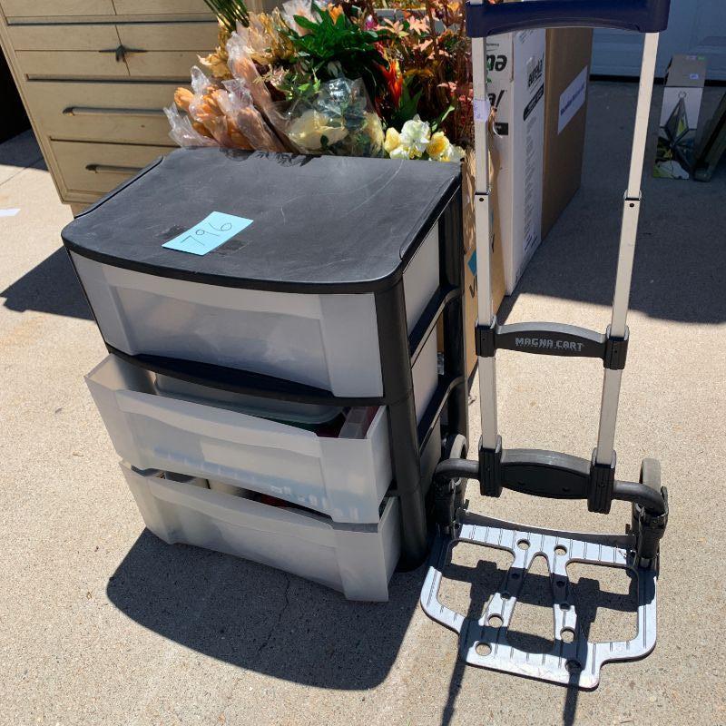 lot 796 plastic storage drawers and fold up dolley