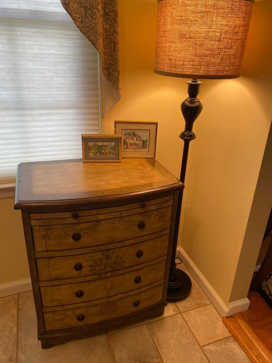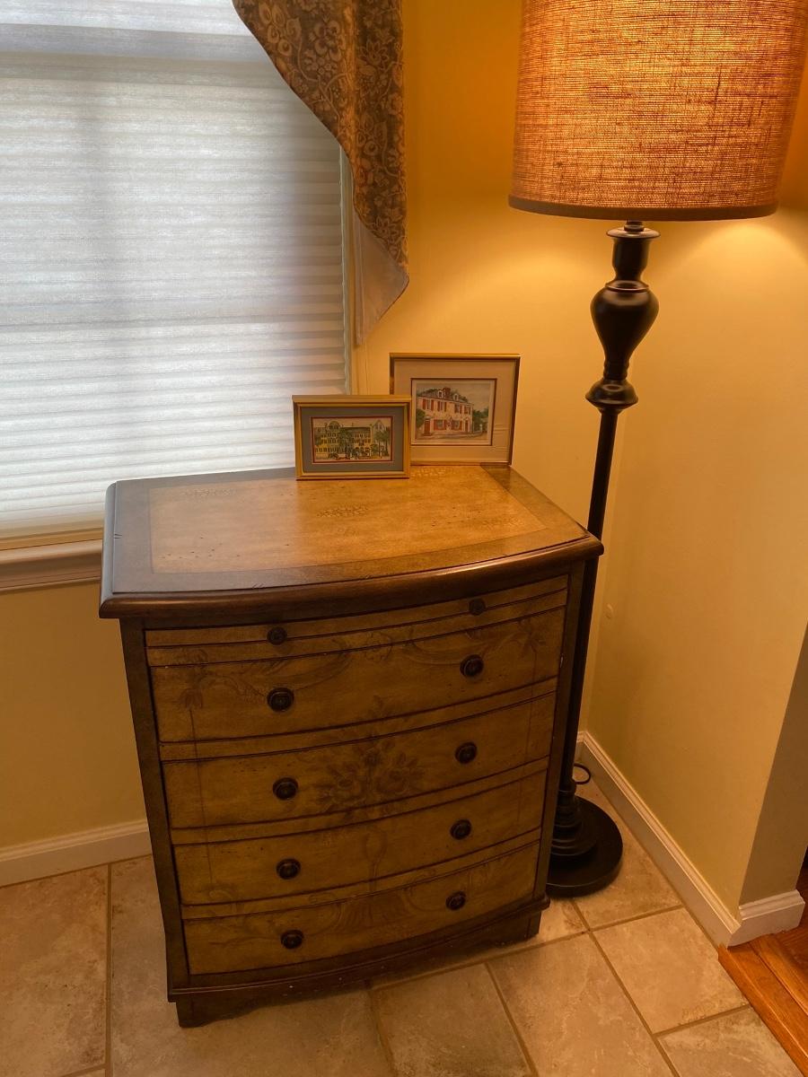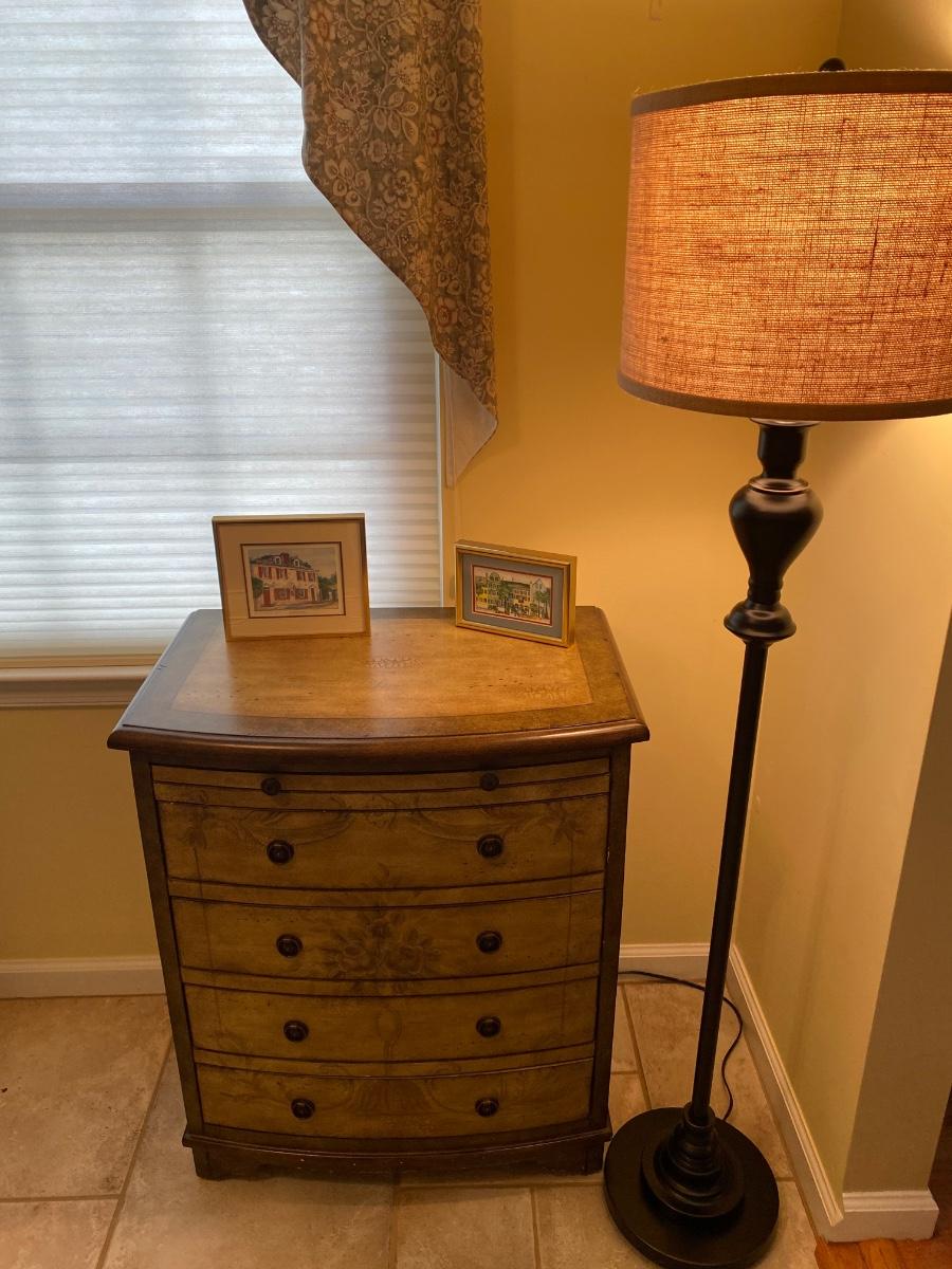 LOT C3: Signed Artwork of Charleston, SC, Shabby Chic Accent Side Chest of Drawers & Floor Lamp