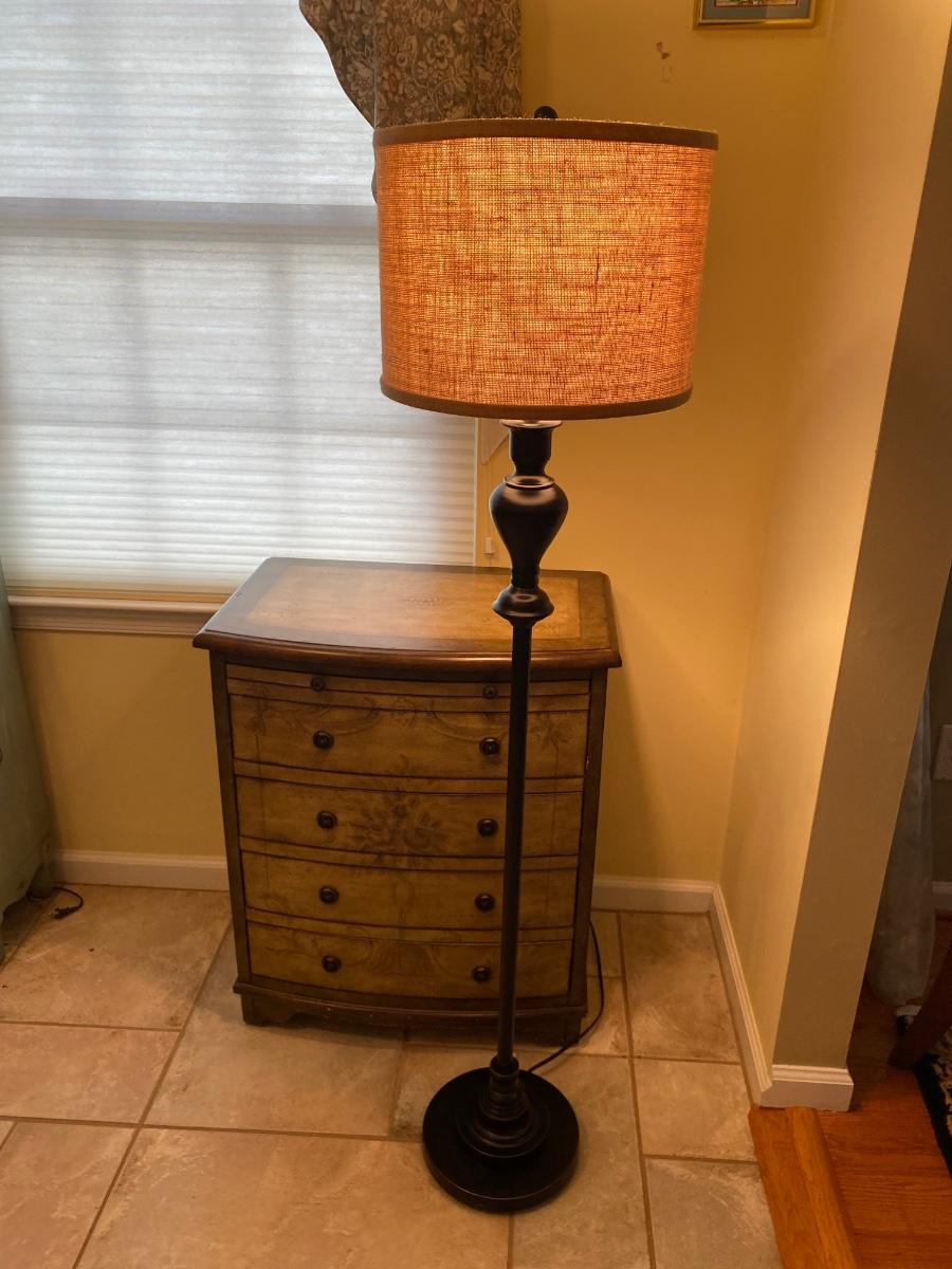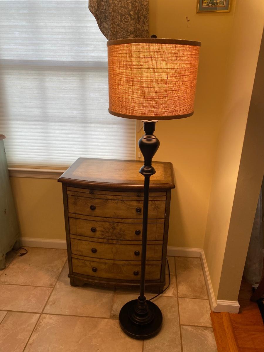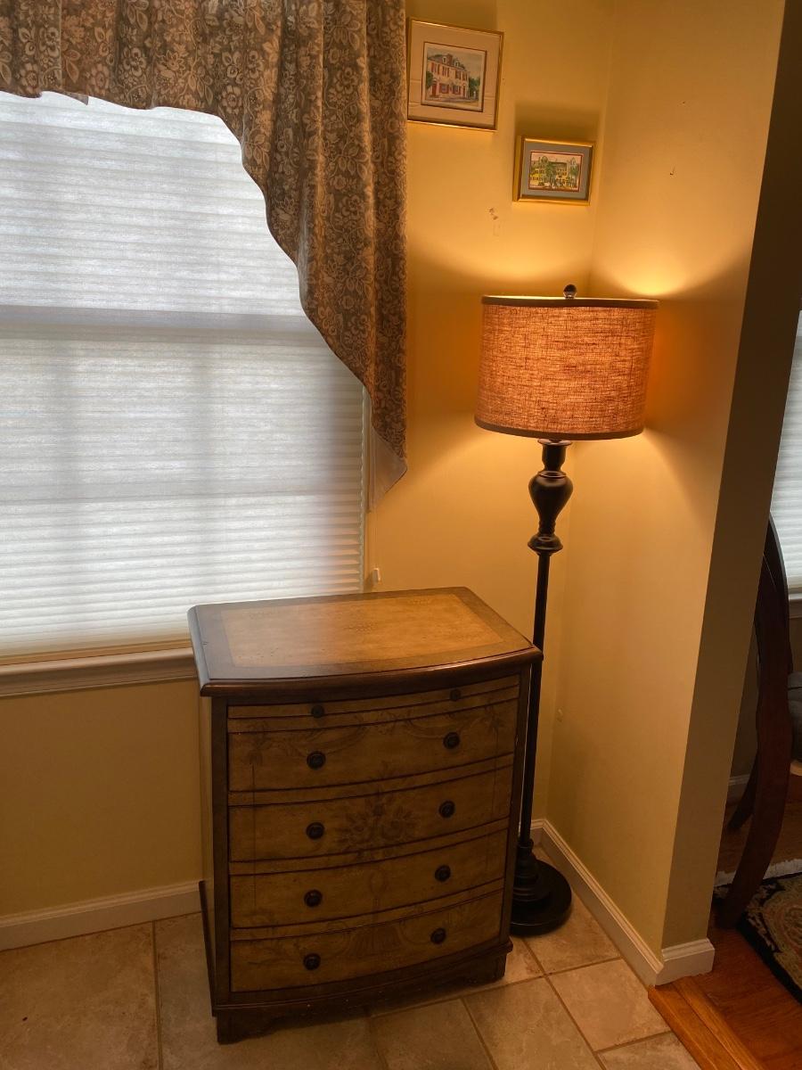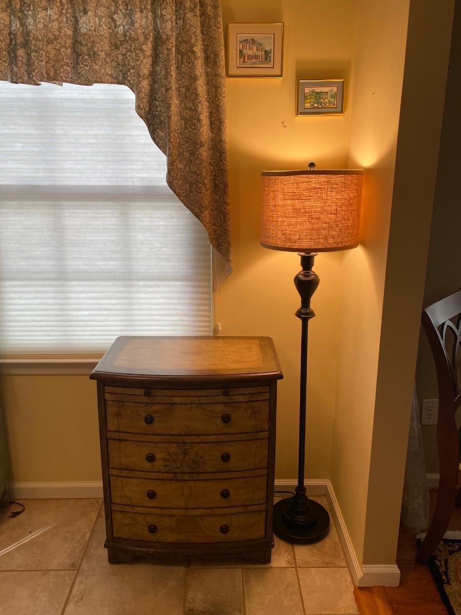 LOT C3: Signed Artwork of Charleston, SC, Shabby Chic Accent Side Chest of Drawers & Floor Lamp