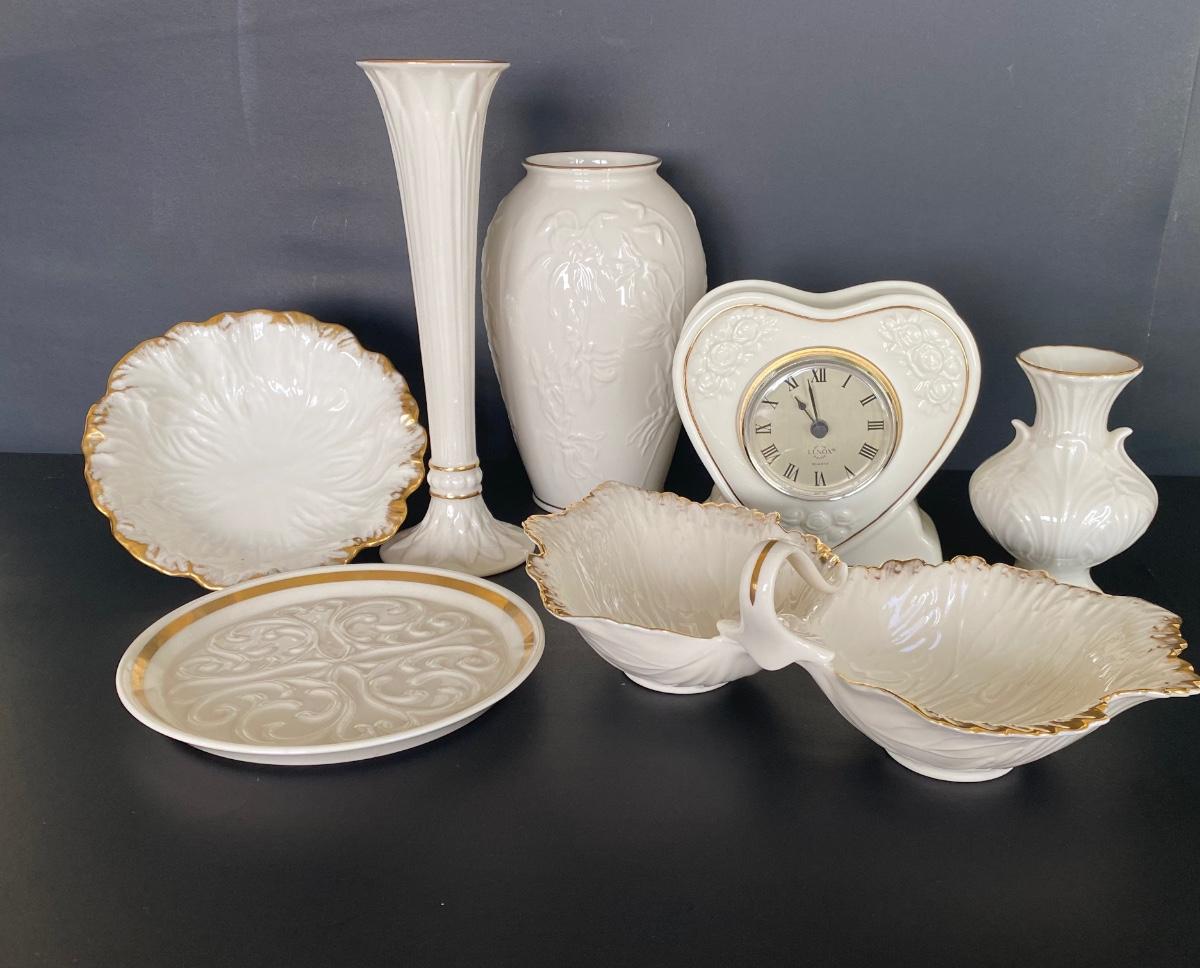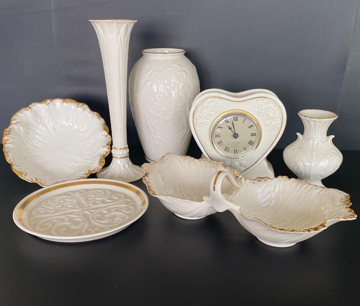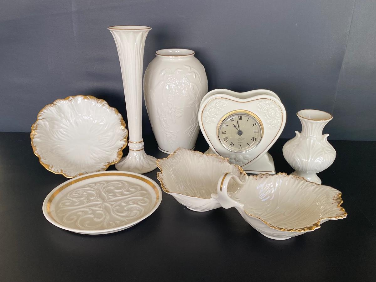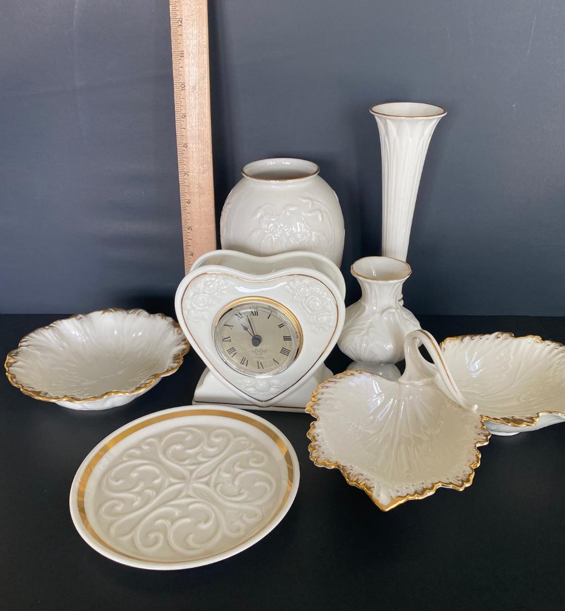 Seven pieces of gold trimmed Lenox. Variety of dishes, vases, and heart shaped clock. Please see all pictures as they are the best representation of the items. The pictures show condition, measurements if taken, and what is included in the lot. Due to the large amount that we photograph and the time frame, we are not always able to take measurements. All items unless noted, are pre-owned and have been used. If you purchased furniture, you must bring help. We do not allow one person to carry large furniture out on their own. Bring help, tools and a truck for the safety of our client’s homes, and your personal safety. Any damages that result to the property including walls, and floors due to moving of the furniture will be charged to the buyer. Company policy. Thank you.