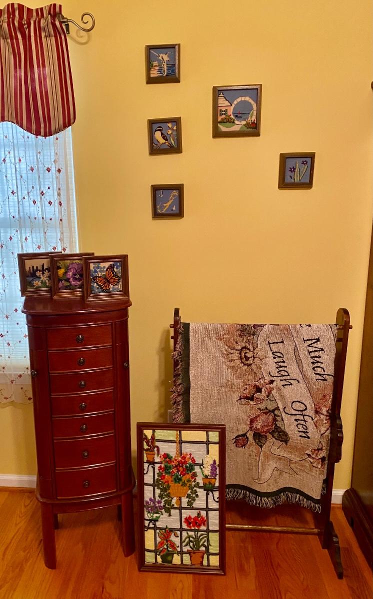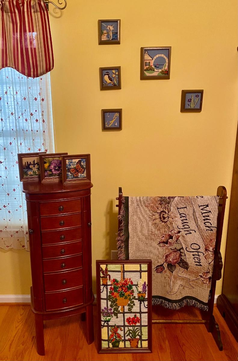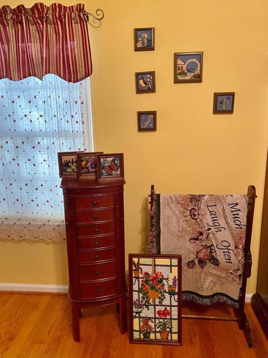 LOT C18: Jewelry Armoire, Quilt Rack & Handmade Needlework Artwork