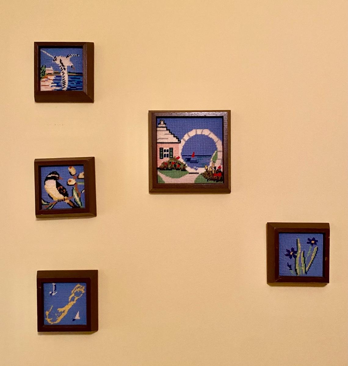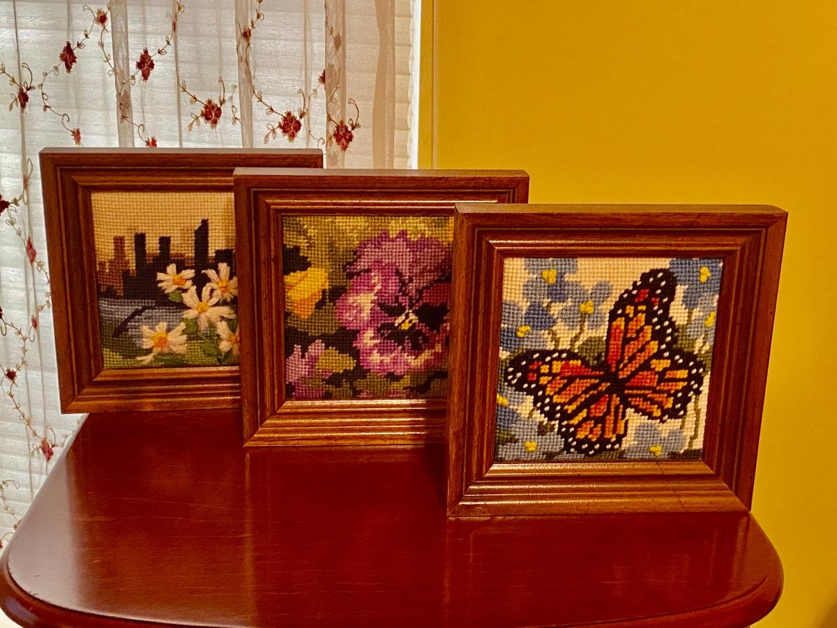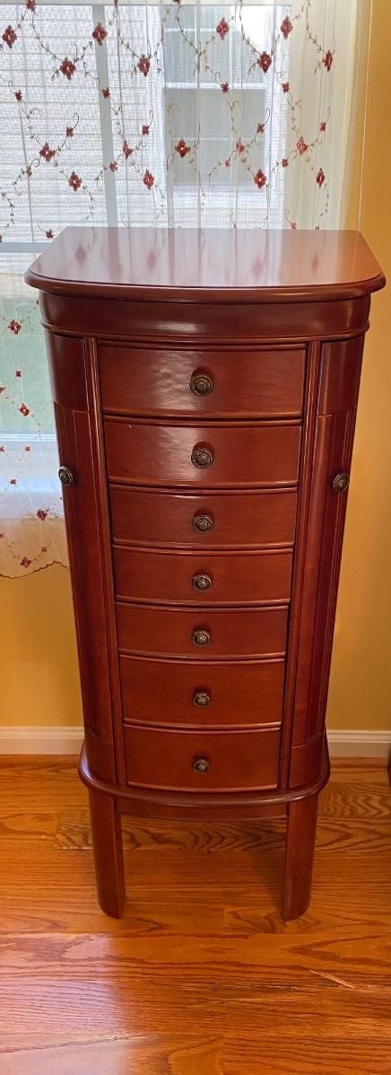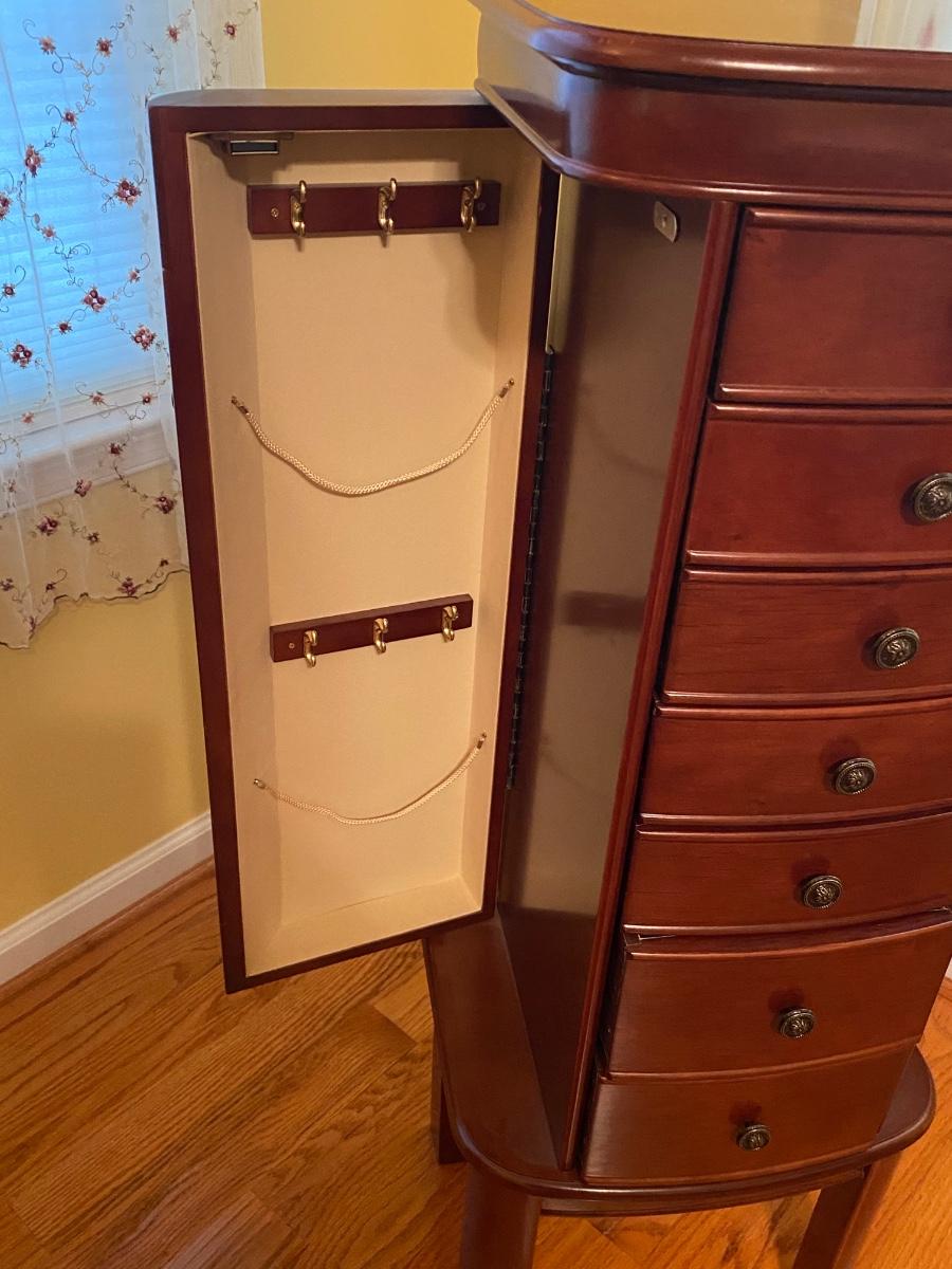 LOT C18: Jewelry Armoire, Quilt Rack & Handmade Needlework Artwork
